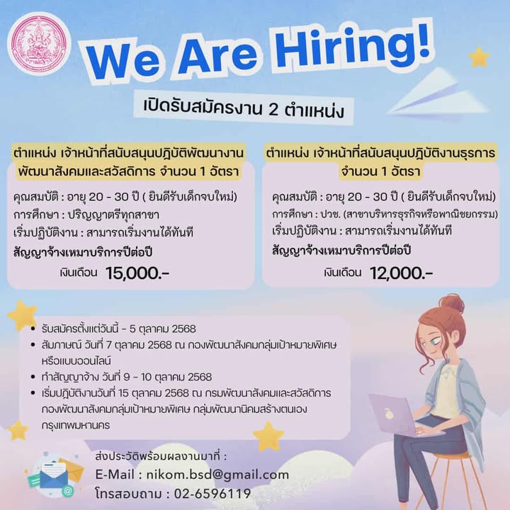 กรมพัฒนาสังคมและสวัสดิการ รับสมัคร จ้างเหมาบริการจำนวน 2 อัตรา เงินเดือน 12,000 - 15,000 บาท ตั้งแต่บัดนี้ถึง 5 ต.ค. 2568 ไฟล์แนป ::: ประกาศรับสมัครสอบ อ้างอิง ::: Tag : งานราชการ แสดงความคิดเห็น : - กรุณาใช้คำพูดที่สุภาพและไม่ทำให้ผู้อื่นเสื่อมเสีย - ห้ามมิให้ผู้ใดโพดขายสินค้าเด็ดขาด - ข้อความโพสโดยสาธารณชน โปรดใช้วิจารณญาณในการอ่าน ที่เกี่ยวข้อง สังกัดสํานักงานการปฏิรูปที่ดินจังหวัดสุรินทร์ รับสมัครพนักงาน 1 อัตรา เงินเดือน 18,000 บาท ตั้งเเต่บัดนี้-5 พ.ย. 2568 18 ต.ค. 2568 เวลา 15:24 น. 1,764 วิทยาลัยการอาชีพวิเชียรบุรี รับสมัครสอบคัดเลือกลูกจ้างชั่วคราว 2 อัตรา เงินเดือน 9,300 บาท ตั้งแต่บัดนี้ - 21 พ.ย. 2568 28 ต.ค. 2568 เวลา 18:10 น. 1,010 บริษัท เอสอาร์ที แอสเสท จำกัด รับสมัครเป็นพนักงานประจำ 11 อัตรา ตั้งแต่บัดนี้ - 7 พ.ย 2568 27 ต.ค. 2568 เวลา 15:04 น. 1,905 โรงพยาบาลสุโขทัย รับสมัครบุคคลเข้ารับราชการ 4 อัตรา เงินเดือน 18,150 - 19,970 บาท ตั้งแต่วันที่ 3 - 7 พ.ย. 2568 30 ต.ค. 2568 เวลา 18:44 น. 805 โรงเรียนนาโยงวิทยาคม รับสมัคร ครูอัตราจ้าง 2 อัตรา เงินเดือน 9,500 บาท ตั้งแต่วันที่ 3-7 พ.ย. 2568 3 พ.ย. 2568 เวลา 15:54 น. 366 กรมการขนส่งทางบก รับสมัครลูกจ้างชั่วคราวจากเงินนอกงบประมาณ 3 อัตรา เงินเดือน 11,380 - 18,150 บาท ตั้งแต่วันที่ 3 - 13 พ.ย. 2568 23 ต.ค. 2568 เวลา 15:55 น. 1,852 เทศบาลเมืองกันทรลักษ์ รับสมัคร พนักงานจ้าง 12 อัตรา เงินเดือน 9,400 - 11,500 บาท ตั้งแต่วันที่ 29 ต.ค. - 6 พ.ย. 2568 23 ต.ค. 2568 เวลา 21:26 น. 676 โรงพยาบาลสกลนคร รับสมัคร ลูกจ้างชั่วคราวรายวัน 1 อัตรา จ้างวันละ 453 บาท ตั้งแต่วันที่ 27 ต.ค. 4 พ.ย. 2568 31 ต.ค. 2568 เวลา 17:52 น. 284 องค์การสวนสัตว์แห่งประเทศไทย รับสมัครลูกจ้างชั่วคราว เงินเดือน 15,000 บาท ตั้งแต่วันที่ 28 ตุลาคม - 6 พ.ย 2568 28 ต.ค. 2568 เวลา 16:02 น. 1,269 เทศบาลเมืองบ้านไผ่ รับสมัคร พนักงานจ้างของเทศบาล 5 อัตรา เงินเดือน 9,400 - 15,000 บาท ตั้งแต่วันที่ 29 ต.ค. - 7 พ.ย. 2568 26 ต.ค. 2568 เวลา 16:42 น. 1,112 โรงพยาบาลมะเร็งอุบลราชธานี ขยายรับสมัครพนักงานกระทรวงสาธารณสุขทั่วไป 1 อัตรา เงินเดือน 13,800 บาท ตั้งแต่บัดนี้ถึง 7 พ.ย. 2568 27 ต.ค. 2568 เวลา 18:33 น. 1,327 กรมวิชาการเกษตร รับสมัครสอบบรรจุบุคคลเข้ารับราชการ 11 อัตรา เงินเดือน 13,130 - 15,320 บาท ตั้งแต่วันที่ 14 พ.ย. - 4 ธ.ค. 2568 4 พ.ย. 2568 เวลา 19:44 น. 311