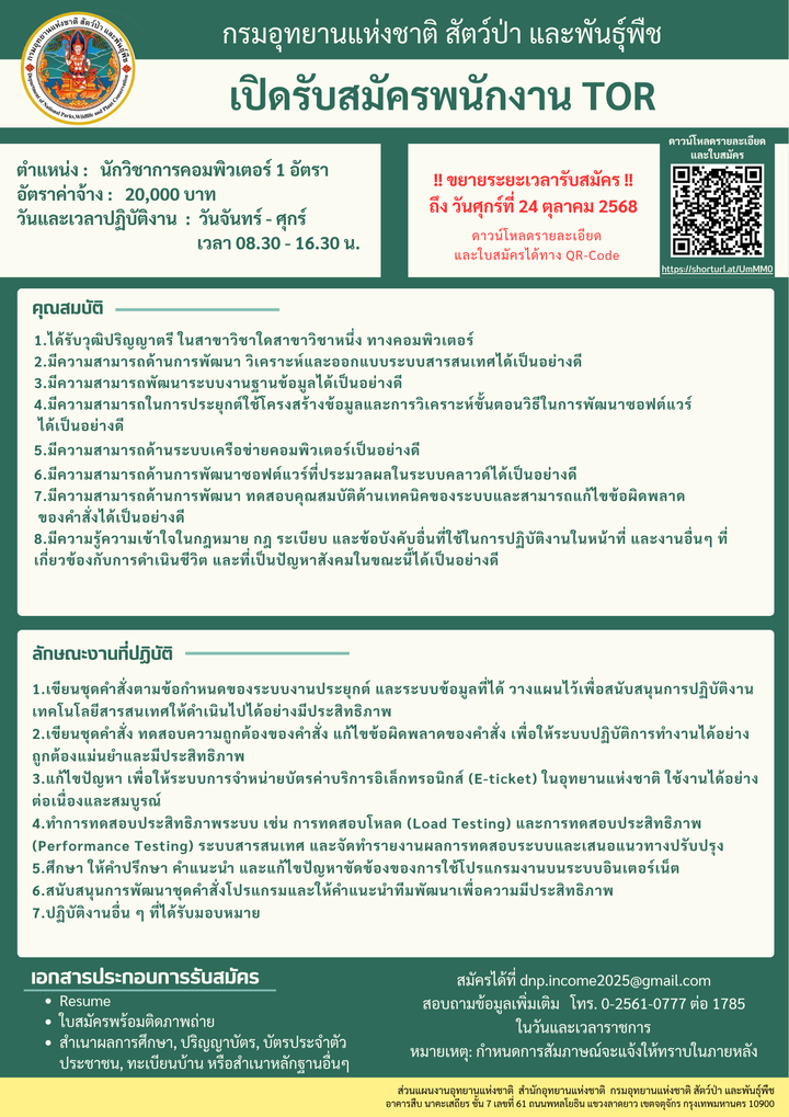 กรมอุทยานแห่งชาติ สัตว์ป่า และพันธุ์พืช รับสมัคร นักวิชาการคอมพิวเตอร์ 1 อัตรา เงินเดือน 20,000 บาท ตั้งแต่บัดนี้ถึง 24 ต.ค. 2568 ไฟล์แนป ::: ประกาศรับสมัครสอบ อ้างอิง ::: Tag : นักวิชาการคอมพิวเตอร์ แสดงความคิดเห็น : - กรุณาใช้คำพูดที่สุภาพและไม่ทำให้ผู้อื่นเสื่อมเสีย - ห้ามมิให้ผู้ใดโพดขายสินค้าเด็ดขาด - ข้อความโพสโดยสาธารณชน โปรดใช้วิจารณญาณในการอ่าน ที่เกี่ยวข้อง สํานักงานการตรวจเงินแผ่นดินภูมิภาคที่ 11(จังหวัดนครสวรรค์) รับสมัคร ตําแหน่งพนักงานขับรถยนต์ ระดับ ส 1 เงินเดือน 9,400.00บาท ตั้งแต่วันที่ 20 ต.ค. - 10 พ.ย.2568 12 ต.ค. 2568 เวลา 13:35 น. 736 สถาบันการอาชีวศึกษาภาคตะวันออกเฉียงเหนือ 4 รับสมัคร ลูกจ้างชั่วคราว 2 อัตรา เงินเดือน 13,920 บาท ตั้งแต่วันที่ 10-14 พ.ย. 2568 30 ต.ค. 2568 เวลา 17:47 น. 508 วิทยาลัยประมงติณสูลานนท์ รับสมัคร ลูกจ้างชั่วคราว 1 อัตรา เงินเดือน 8,300 บาท ตั้งแต่วันที่ 27 ต.ค. - 5 พ.ย. 2568 26 ต.ค. 2568 เวลา 17:47 น. 364 โรงเรียนบ้านหนองบัว รับสมัคร ครูอัตราจ้าง 1 อัตรา เงินเดือน 6,000 บาท ตั้งแต่วันที่ 5-11 พ.ย. 2568 3 พ.ย. 2568 เวลา 12:23 น. 506 มหาวิทยาลัยเทคโนโลยีราชมงคลอีสาน รับสมัคร นักวิชาการศึกษา1 อัตรา เงินเดือน 15,000 บาท ตั้งแต่วันที่ 22 ต.ค. - 5 พ.ย. 2568 25 ต.ค. 2568 เวลา 20:25 น. 825 กรมการแพทย์ รับสมัคร พนักงานราชการทั่วไป 1 อัตรา เงินเดือน 21,780 บาท ตั้งแต่วันที่ 28 ต.ค. - 6 พ.ย. 2568 28 ต.ค. 2568 เวลา 12:50 น. 840 สํานักงานพัฒนาสังคมและความมั่นคงของมนุษย์ จังหวัดศรีสะเกษ รับสมัคร นักสังคมสงเคราะห์ 1 อัตรา เงินเดือน 21,710 บาท ตั้งแต่วันที่ 3-7 พ.ย. 2568 25 ต.ค. 2568 เวลา 20:53 น. 3,077 วิทยาลัยการอาชีพวังไกลกังวล2 รับสมัครบุคคลเพื่อบรรจุเป็นลูกจ้างชั่วคราว 1 อัตรา เงินเดือน 10,000 บาท ตั้งแต่บัดนี้ - 7 พ.ย. 2568 4 พ.ย. 2568 เวลา 19:01 น. 252 สํานักงานปศุสัตว์จังหวัดสระบุรี รับสมัครพนักงานราชการทั่วไป 1 อัตรา เงินเดือน 16,700 บาท ตั้งแต่วันที่ 27 ต.ค. - 4 พ.ย. 2568 22 ต.ค. 2568 เวลา 21:40 น. 1,998 โรงเรียนบ้านบางสะพานน้อย รับสมัคร ครูอัตราจ้าง 1 อัตรา เงินเดือน 7,000 บาท ตั้งแต่วันที่ 1-5 พ.ย. 2568 2 พ.ย. 2568 เวลา 21:22 น. 136 โรงพยาบาลสิชล รับสมัคร ลูกจ้างชั่วคราว (รายวัน) 2 อัตรา จ้างวันละ 400 - 520 บาท ตั้งแต่วันที่ 3-7 พ.ย. 2568 30 ต.ค. 2568 เวลา 19:02 น. 162 โรงพยาบาลชุมพรเขตรอุดมศักดิ์ รับสมัครลูกจ้างชั่วคราวเงินบำรุง (รายวัน) 2 อัตรา ตั้งแต่บัดนี้ - 4 พ.ย. 2568 31 ต.ค. 2568 เวลา 11:46 น. 629