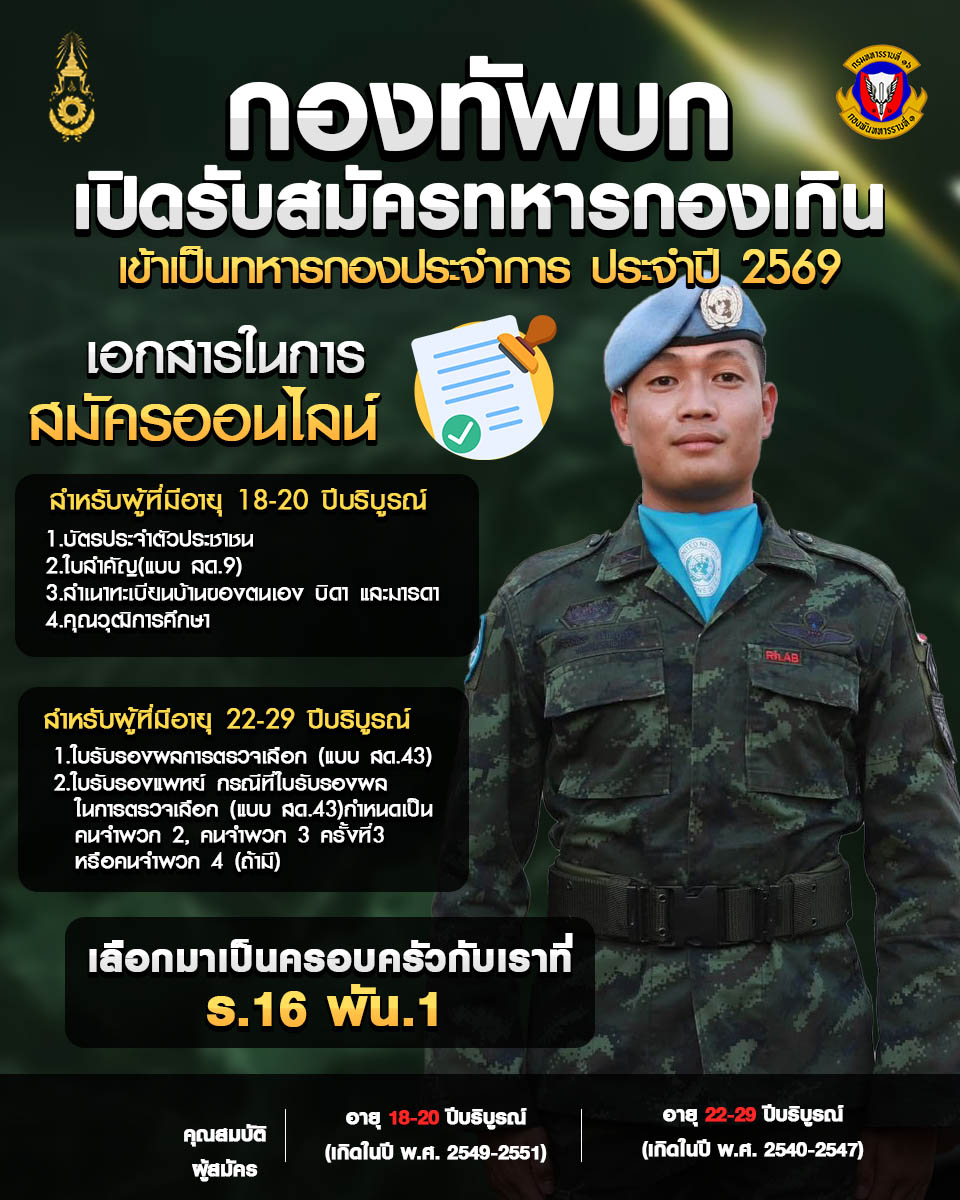 กองทัพบก รับสมัครทหารกองเกินเข้ารับราชการทหารกองประจำการ (กรณีพิเศษ) ด้วยระบบออนไลน์ ตั้งแต่บัดนี้ถึง 25 ม.ค. 2569 แสดงความคิดเห็น : - กรุณาใช้คำพูดที่สุภาพและไม่ทำให้ผู้อื่นเสื่อมเสีย - ห้ามมิให้ผู้ใดโพดขายสินค้าเด็ดขาด - ข้อความโพสโดยสาธารณชน โปรดใช้วิจารณญาณในการอ่าน ที่เกี่ยวข้อง สํานักงานสหกรณ์จังหวัดสุรินทร์ รับสมัคร พนักงานราชการทั่วไป 1 อัตรา เงินเดือน 21,780 บาท ตั้งแต่วันที่ 23-30 ม.ค. 2569 15 ม.ค. 2569 เวลา 20:55 น. 138 สำนักงานสถิติจังหวัดประจวบคีรีขันธ์ รับสมัครพนักงานราชการทั่วไป 1 อัตรา เงินเดือน 21,870 บาท ตั้งแต่วันที่ 19 - 26 ม.ค. 2569 6 ม.ค. 2569 เวลา 09:55 น. 975 โรงพยาบาลส่งเสริมสุขภาพตำบลบ้านปากแพรก รับสมัคร ลูกจ้างชั่วคราวเงินบํารุง (รายเดือน) 2 อัตรา เงินเดือน 9,030 - 15,000 บาท ตั้งแต่วันที่ 14-25 ม.ค. 2569 14 ม.ค. 2569 เวลา 17:06 น. 218 โรงพยาบาลพระนครศรีอยุธยา รับสมัครลูกจ้างชั่วคราว(รายวัน) 1 อัตรา ตั้งแต่วันที่ 13 ม.ค. - 13 ก.พ. 2569 9 ม.ค. 2569 เวลา 19:18 น. 1,347 ก.บ.ม. มหาวิทยาลัยเทคโนโลยีพระจอมเกล้าพระนครเหนือ รับสมัคร บรรจุเป็นพนักงานพิเศษ 1 อัตรา เงินเดือน 14,340 บาท ตั้งแต่วันที่ 25 ธ.ค. 2568 - 19 ม.ค. 2569 2 ม.ค. 2569 เวลา 12:29 น. 564 ท่าอากาศยานร้อยเอ็ด รับสมัครพนักงานราชการทั่วไป 2 อัตรา เงินเดือน 16,700 บาท ตั้งแต่วันที่ 19 - 23 ม.ค. 2569 7 ม.ค. 2569 เวลา 09:39 น. 3,081 สถาบันพยาธิวิทยา ศูนย์อํานวยการแพทย์พระมงกุฎเกล้า รับสมัคร ลูกจ้างชั่วคราว 1 อัตรา เงินเดือน 10,500 บาท ตั้งแต่บัดนี้ถึง 19 ม.ค. 2569 24 ธ.ค. 2568 เวลา 12:01 น. 489 โรงเรียนสาธิตจุฬาลงกรณ์มหาวิทยาลัย ฝ่ายประถม รับสมัครบุคคลเป็นพนักงานมหาวิทยาลัย 1 อัตรา เงินเดือน 23,300 - 56,400 บาท ตั้งแต่บัดนี้ - 20 ม.ค. 2569 2 ม.ค. 2569 เวลา 18:36 น. 4,711 สํานักงาน ป.ป.ช. รับสมัครบุคคลจ้างเหมาบริการ 19 อัตรา เงินเดือน 18,000 บาท ตั้งแต่บัดนี้ - 23 ม.ค. 2569 13 ม.ค. 2569 เวลา 20:22 น. 1,357 ธนาคารออมสิน รับสมัครลูกจ้างปฏิบัติการ เงินเดือน 15,000 บาท ตั้งแต่บัดนี้ - 28 ก.พ 2569 14 ธ.ค. 2568 เวลา 13:19 น. 6,712 โรงพยาบาลสิรินธร รับสมัคร พยาบาลวิชาชีพ 3 อัตรา เงินเดือน7,250บาท ตั้งแต่วันที่ 5-23 ม.ค. 2569 27 ธ.ค. 2568 เวลา 07:57 น. 651 สํานักงานสาธารณสุขจังหวัดสมุทรปราการ รับสมัคร พนักงานราชการ 5 อัตรา เงินเดือน 13,660 - 27,540บาท ตั้งแต่วันที่ 8-24 ม.ค. 2569 30 ธ.ค. 2568 เวลา 10:04 น. 1,015