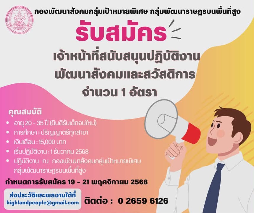 กองพัฒนาสังคมกลุ่มเป้าหมายพิเศษ กลุ่มพัฒนาราษฎรบนพื้นที่สูง รับสมัคร เจ้าหน้าที่สนับสนุนปฏิบัติงาน 1 อัตรา เงินเดือน 15,000 บาท ตั้งแต่วันที่ 19-21 พ.ย. 2568 แสดงความคิดเห็น : - กรุณาใช้คำพูดที่สุภาพและไม่ทำให้ผู้อื่นเสื่อมเสีย - ห้ามมิให้ผู้ใดโพดขายสินค้าเด็ดขาด - ข้อความโพสโดยสาธารณชน โปรดใช้วิจารณญาณในการอ่าน ที่เกี่ยวข้อง โครงการอุทยานวิทยาศาสตร์ มหาวิทยาลัยอุบลราชธานี รับสมัคร ลูกจ้างชั่วคราว 1 อัตรา เงินเดือน 16,120 บาท ตั้งแต่วันที่ 14-24 พ.ย. 2568 15 พ.ย. 2568 เวลา 21:22 น. 826 องค์การบริหารส่วนจังหวัดยะลา รับสมัครพนักงานผู้สูงอายุชำนาญงานเฉพาะทาง 1 อัตรา เงินเดือน 20,000 บาท ตั้งแต่วันที่ 19 - 27 พ.ย. 2568 19 พ.ย. 2568 เวลา 14:14 น. 35 ศูนย์วิจัยและพัฒนาการเพาะเลี้ยงสัตว์น้ำชายฝั่งกระบี่ รับสมัครพนักงานราชการทั่วไป 2 อัตรา เงินเดือน 12,630 บาท ตั้งแต่วันที่ 19 - 27 พ.ย. 2568 12 พ.ย. 2568 เวลา 18:40 น. 1,793 มหาวิทยาลัยอุบลราชธานี รับสมัคร จ้างเหมาบริการรายบุคคล 1อัตรา เงินเดือน 14,950 บาท ตั้งแต่วันที่ 14-30 พ.ย. 2568 15 พ.ย. 2568 เวลา 21:34 น. 939 โรงพยาบาลบ้านไร่ รับสมัคร พนักงานกระทรวงสาธารณสุขทั่วไป 1 อัตรา เงินเดือน 18,000 บาท ตั้งแต่วันที่ 17-28 พ.ย. 2568 9 พ.ย. 2568 เวลา 19:47 น. 418 สพป.ตาก เขต 2 รับสมัครพนักงานราชการทั่วไป 1 อัตรา เงินเดือน 12,630 บาท ตั้งแต่วันที่ 17 - 21 พ.ย. 2568 12 พ.ย. 2568 เวลา 18:45 น. 932 สพป.หนองคาย เขต 1 รับสมัครบุคคลเป็นพนักงานราชการทั่วไป 2 อัตรา เงินเดือน 13,660 - 16,700 บาท ตั้งแต่วันที่ 24 - 30 พ.ย. 2568 18 พ.ย. 2568 เวลา 13:25 น. 385 สถาบันค้นคว้าและพัฒนาผลิตภัณฑ์อาหาร รับสมัคร นักวิชาการพัสดุ 1 อัตรา เงินเดือน 21,000 บาท ตั้งแต่วันที่ 29 ต.ค. - 28 พ.ย. 2568 1 พ.ย. 2568 เวลา 08:54 น. 454 กรมสุขภาพจิต รับสมัคร บรรจุเข้ารับราชการ 13 อัตรา เงินเดือน 13,920-19,970 บาท ตั้งแต่วันที่ 17 พ.ย. - 9 ธ.ค. 2568 16 พ.ย. 2568 เวลา 16:12 น. 741 โรงเรียนบ้านดอนธรรม รับสมัคร ครูอัตราจ้าง 1 อัตรา เงินเดือน 6,500 บาท ตั้งแต่วันที่ 13-19 พ.ย. 2568 15 พ.ย. 2568 เวลา 19:24 น. 613 โรงพยาบาลแก้งสนามนาง รับสมัครบุคคลเป็นลูกจ้างชั่วคราว 3 อัตรา ตั้งแต่บัดนี้ - 21 พ.ย. 2568 14 พ.ย. 2568 เวลา 08:00 น. 270 กรมหม่อนไหม ขอนแก่น รับสมัคร พนักงานราชการทั่วไป 2 อัตรา เงินเดือน 13,660 - 16,700 บาท ตั้งแต่วันที่ 17-21 พ.ย. 2568 10 พ.ย. 2568 เวลา 19:57 น. 2,354