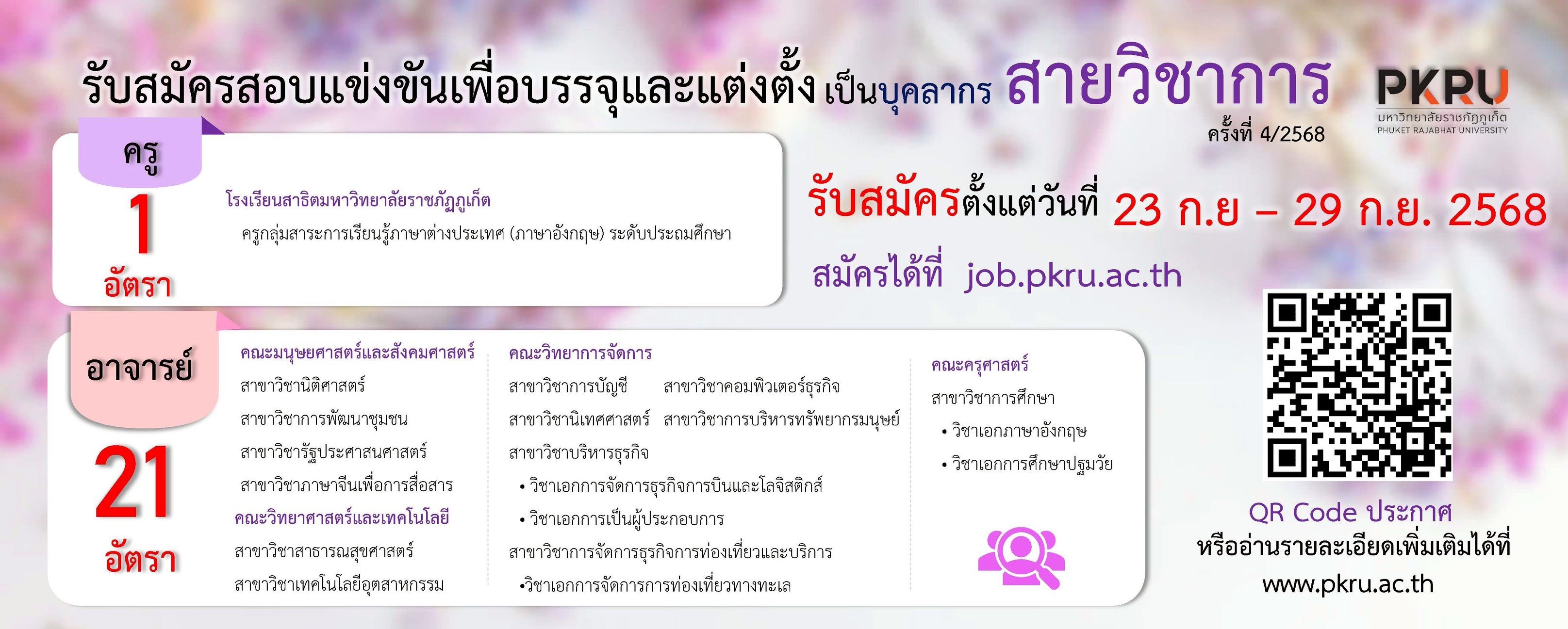 มหาวิทยาลัยราชภัฏภูเก็ต รับสมัคร บุคลากรสายวิชาการ 22 อัตรา ตั้งแต่วันที่ 23-29 ก.ย. 2568 ไฟล์แนป ::: ประกาศรับสมัครสอบ อ้างอิง ::: Tag : อาจารย์ แสดงความคิดเห็น : - กรุณาใช้คำพูดที่สุภาพและไม่ทำให้ผู้อื่นเสื่อมเสีย - ห้ามมิให้ผู้ใดโพดขายสินค้าเด็ดขาด - ข้อความโพสโดยสาธารณชน โปรดใช้วิจารณญาณในการอ่าน ที่เกี่ยวข้อง คณะศิลปศาสตร์ มหาวิทยาลัยมหิดล รับสมัครลูกจ้างโครงการเงินรายได้ 1 อัตรา เงินเดือน 15,000 บาท ตั้งแต่บัดนี้ - 15 พ.ย. 2568 24 ต.ค. 2568 เวลา 17:26 น. 1,625 สภาการสาธารณสุขชุมชน รับสมัคร เจ้าหน้าที่สภาการสาธารณสุขชุมชน 5 อัตรา เงินเดือน 19,970 บาท ตั้งแต่วันที่ 22 ต.ค. - 5 พ.ย. 2568 23 ต.ค. 2568 เวลา 14:28 น. 3,176 โรงเรียนบ้านกะลาพอ รับสมัคร พี่เลี้ยงเด็กพิการ 1 อัตรา เงินเดือน 9,000 บาท ตั้งแต่วันที่ 5-7 พ.ย. 2568 3 พ.ย. 2568 เวลา 15:43 น. 109 โรงพยาบาลมหาราชนครราชสีมา รับสมัคร บรรจุเข้ารับราชการ 15 อัตรา เงินเดือน 13,130 - 19,970 บาท ตั้งแต่วันที่ 5-11 พ.ย. 2568 4 พ.ย. 2568 เวลา 19:44 น. 51 วิทยาลัยเทคนิคยะลา รับสมัครพนักงานราชการทั่วไป 5 อัตรา ตั้งเเต่วันที่ 29 ต.ค. - 5 พ.ย. 2568 18 ต.ค. 2568 เวลา 14:24 น. 2,083 กรมส่งเสริมสหกรณ์ รับสมัครคนพิการเป็นพนักงานราชการทั่วไป 1 อัตรา เงินเดือน 12,630 - 16,700 บาท วันที่ 3 - 14 พ.ย. 2568 31 ต.ค. 2568 เวลา 11:32 น. 443 สำนักงานนโยบายและยุทธศาสตร์การค้า รับสมัครบุคคลเข้ารับราชการ 1 อัตรา เงินเดือน 21,180 - 23,300 บาท ตั้งแต่วันที่ 15 ต.ค. - 10 พ.ย. 2568 1 ต.ค. 2568 เวลา 18:53 น. 2,723 โรงเรียนบ้านหนองบัว รับสมัคร ครูอัตราจ้าง 1 อัตรา เงินเดือน 6,000 บาท ตั้งแต่วันที่ 5-11 พ.ย. 2568 3 พ.ย. 2568 เวลา 12:23 น. 505 สํานักงานสหกรณ์จังหวัดสงขลา รับสมัครพนักงานจ้างเหมาบริการ 1 อัตรา เงินเดือน 15,000 บาท ตั้งเเต่วันที่ 3-7 พ.ย. 2568 28 ต.ค. 2568 เวลา 19:28 น. 3,838 สํานักงานปศุสัตว์จังหวัดมหาสารคาม รับสมัครพนักงานราชการทั่วไป 2 อัตรา เงินเดือน 16,700 บาท ตั้งแต่วันที่ 3 - 7 พ.ย. 2568 27 ต.ค. 2568 เวลา 18:51 น. 1,758 สำนักงานปลัดกระทรวงการพัฒนาสังคมและความมั่นคงของมนุษย์ รับสมัครบุคคลเข้ารับราชการ 21 อัตรา เงินเดือน 13,920 - 19,970 บาท ตั้งแต่วันที่ 28 ต.ค. - 17 พ.ย. 2568 17 ต.ค. 2568 เวลา 18:39 น. 8,524 โรงพยาบาลพหลพลพยุหเสนา รับสมัคร ลูกจ้างชั่วคราว (รายวัน) 4 อัตรา จ้างวันละ 430 บาท ตั้งแต่วันที่ 30 ต.ค. - 12 พ.ย. 2568 30 ต.ค. 2568 เวลา 17:56 น. 136