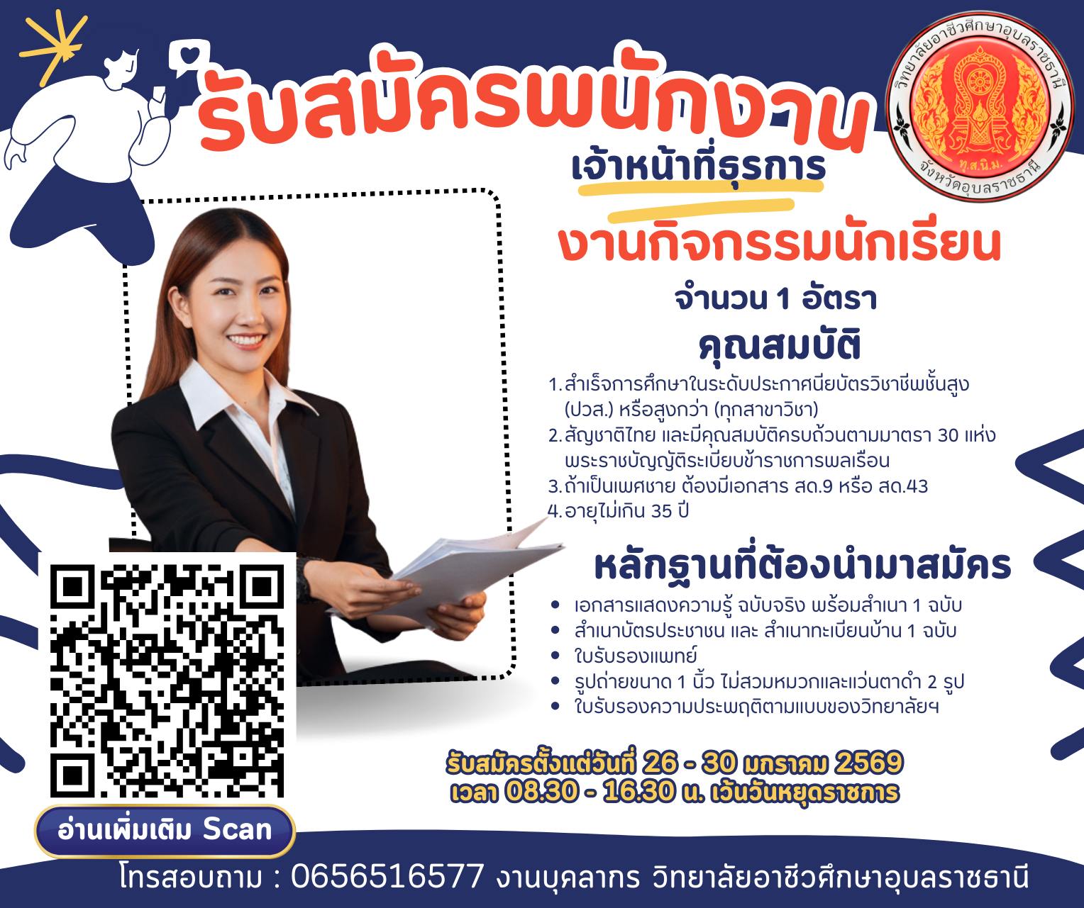 วันอังคารที่ 27 เดือนมกราคม พ.ศ.2569 Home (เปิดสอบราชการ) งานราชการ งานรัฐวิสาหกิจ สอบครูผู้ช่วย สอบครูอัตราจ้าง ตำรวจ/ทหาร แนวข้อสอบ ข่าวการศึกษา งานสถานศึกษา ประกาศผลสอบ สาระน่ารู้ 🔍 ล่าสุด : ท่าอากาศยานขอนแก่น รับสมัครพนักงานราชการทั่วไป 2 อัตรา เงินเดือน 16,700 บาท ตั้งแต่วันที่ 19 ม.ค. - 20 ก.พ. 2569 Home งานราชการ วิทยาลัยอาชีวศึกษาอุบลราชธานี รับสมัคร ลูกจ้างชั่วคราว (เจ้าหน้าที่) 1.. วิทยาลัยอาชีวศึกษาอุบลราชธานี รับสมัคร ลูกจ้างชั่วคราว (เจ้าหน้าที่) 1 อัตรา เงินเดือน 8,120บาท ตั้งแต่วันที่ 26-30 ม.ค. 2569 แสดงความคิดเห็น : - กรุณาใช้คำพูดที่สุภาพและไม่ทำให้ผู้อื่นเสื่อมเสีย - ห้ามมิให้ผู้ใดโพดขายสินค้าเด็ดขาด - ข้อความโพสโดยสาธารณชน โปรดใช้วิจารณญาณในการอ่าน ที่เกี่ยวข้อง โรงพยาบาลดอนสัก รับสมัครพนักงานจ้างเหมาบริการ (รายเดือน) 1 อัตรา เงินเดือน 18,000 บาท ตั้งเเต่วันที่ 12-30 ม.ค. 2569 10 ม.ค. 2569 เวลา 20:37 น. 765 เทศบาลเมืองตราด รับสมัครบุคคลเป็นพนักงานจ้าง 8 อัตรา เงินเดือน 9,000 - 9,400 บาท ตั้งแต่บัดนี้ - 29 ม.ค. 2569 23 ม.ค. 2569 เวลา 18:52 น. 697 เทศบาลเมืองกระบี่ รับสมัครบุคคลเลือกสรรเป็นพนักงานจ้าง 6 อัตรา เงินเดือน 9,000 - 15,000 บาท ตั้งแต่บัดนี้ - 29 ม.ค. 2569 25 ม.ค. 2569 เวลา 20:30 น. 1,027 วิทยาลัยเทคนิคธัญบุรี รับสมัครพนักงานราชการทั่วไป 1 อัตรา เงินเดือน 21,780 บาท ตั้งแต่วันที่ 2 -13 ก.พ. 2569 27 ม.ค. 2569 เวลา 12:50 น. 73 โรงพยาบาลสมเด็จพระเจ้าตากสินมหาราช รับสมัครพนักงานกระทรวงสาธารณสุขทั่วไป 2 อัตรา เงินเดือน 8,690 - 18,000 บาท ตั้งแต่วันที่ 2 - 6 ก.พ. 2569 21 ม.ค. 2569 เวลา 19:55 น. 1,157 สํานักงาน ป.ป.ช. อํานาจเจริญ รับสมัคร ลูกจ้างตามสัญญาจ้าง 1 อัตรา เงินเดือน 11,500 บาท ตั้งแต่วันที่ 19-30 ม.ค. 2569 15 ม.ค. 2569 เวลา 14:00 น. 437 ศูนย์วิจัยและพัฒนาการเพาะเลี้ยงสัตว์น้ำจืดแพร่ รับสมัครบุคคลเป็นพนักงานราชการทั่วไป 1 อัตรา เงินเดือน 16,700 บาท ตั้งแต่วันที่ 2 - 10 ก.พ. 2569 19 ม.ค. 2569 เวลา 18:54 น. 659 มหาวิทยาลัยขอนแก่น รับสมัครบุคคลเข้าปฏิบัติงานเป็นลูกจ้างมหาวิทยาลัย 1 อัตรา เงินเดือน 13,920 บาท ตั้งแต่บัดนี้ - 10 ก.พ. 2569 1 ม.ค. 2569 เวลา 18:02 น. 3,271 สํานักงานคุมประพฤติ รับสมัครลูกจ้างชั่วคราว หลายอัตรา เงินเดือน 10,340 - 18,150 บาท หลายจังหวัด ทั่วประเทศ 17 ม.ค. 2569 เวลา 23:40 น. 6,762 วิทยาลัยเทคนิคบางนรา รับสมัครบุคคลเป็นพนักงานราชการทั่วไป 1 อัตรา เงินเดือน 21,780 บาท ตั้งแต่วันที่ 11 - 24 ก.พ. 2569 26 ม.ค. 2569 เวลา 19:10 น. 630 สำนักงานบริหารทรัพยากรบุคคล สภากาชาดไทย รับสมัครบุคคลบรรจุและแต่งตั้งเข้าปฏิบัติงาน 1 อัตรา ตั้งแต่บัดนี้ - 2 ก.พ. 2569 20 ม.ค. 2569 เวลา 19:21 น. 1,051 โรงพยาบาลพุทธโสธร รับสมัครพนักงานกระทรวงสาธารณสุขทั่วไป 2 อัตรา เงินเดือน 18,000 บาท ตั้งแต่วันที่ 22-29 ม.ค. 2569 23 ม.ค. 2569 เวลา 14:49 น. 267 หมวดหมู่ท