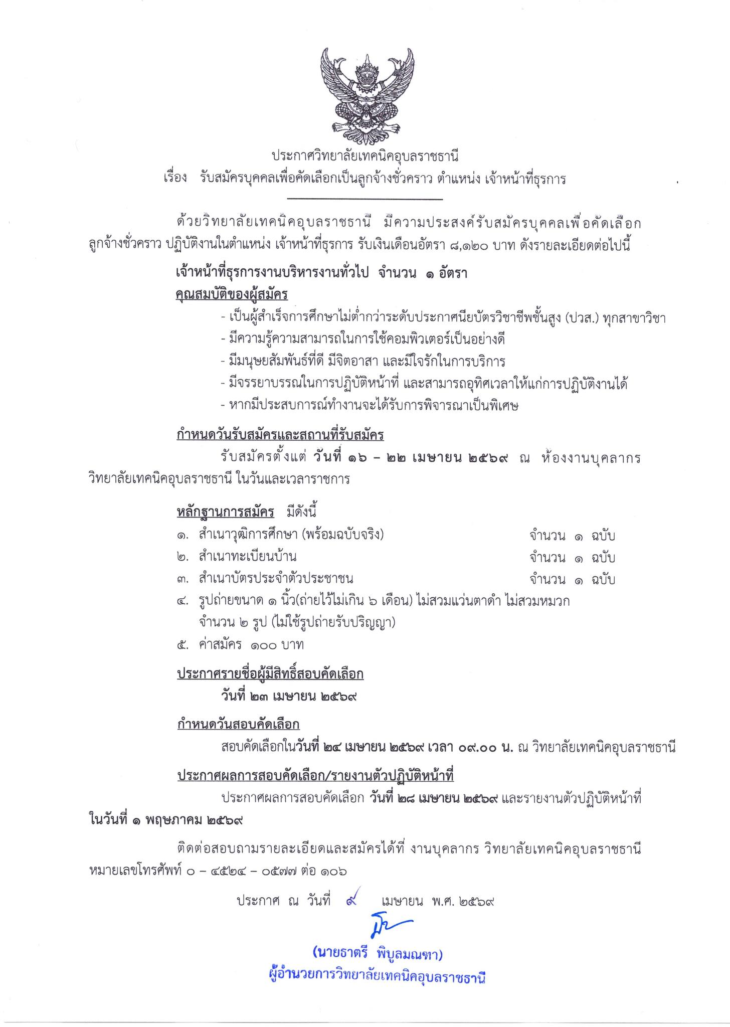 วิทยาลัยเทคนิคอุบลราชธานี รับสมัครลูกจ้างชั่วคราว 1 อัตรา เงินเดือน 8,120 บาท ตั้งแต่วันที่ 16-22 เม.ย.2569 ที่เกี่ยวข้อง โรงพยาบาลราชพิพัฒน์ รับสมัครพนักงานประกันสังคม 64 อัตรา เงินเดือน 9,993 - 17,250 บาท ตั้งแต่วันที่ 20 เม.ย. - 11 พ.ค. 2569 12 เม.ย. 2569 เวลา 14:25 น. 489 คณะเภสัชศาสตร์ มหาวิทยาลัยเกษตรศาสตร์ รับสมัครพนักงานมหาวิทยาลัย 2 อัตรา เงินเดือน 21,000 - 24,000 บาท ตั้งแต่บัดนี้ - 6 พ.ค. 2569 14 เม.ย. 2569 เวลา 20:32 น. 1,285 วิทยาลัยเกษตรและเทคโนโลยีกาญจนบุรี รับสมัครบุคคลเป็นพนักงานราชการทั่วไป 1 อัตรา เงินเดือน 21,780 บาท ตั้งแต่วันที่ 20 - 24 เม.ย. 2569 9 เม.ย. 2569 เวลา 19:14 น. 2,419 สํานักงานสาธารณสุขจังหวัดชัยนาท รับสมัครพนักงานกระทรวงสาธารณสุขทั่วไป 6 อัตรา เงินเดือน 11,500 - 18,000 บาท ตั้งแต่วันที่ 17-23 เม.ย. 2569 9 เม.ย. 2569 เวลา 22:16 น. 2,247 สำนักงานสถิติจังหวัดนครราชสีมา รับสมัครลูกจ้างเหมาบริการ 1 อัตรา เงินเดือน 15,000 บาท ตั้งเเต่บัดนี้-24 เม.ย. 2569 17 เม.ย. 2569 เวลา 16:48 น. 933 โรงพยาบาลภูมิพลอดุลยเดช กรมแพทย์ทหารอากาศ รับสมัครลูกจ้างชั่วคราวรายเดือน 94 อัตรา เงินเดือน 8,690 - 18,150 บาท ตั้งแต่วันที่ 16-24 เม.ย. 2569 11 เม.ย. 2569 เวลา 23:01 น. 921 วิทยาลัยพยาบาลบรมราชชนนี จักรีรัช รับสมัครจ้างเหมาบริการ 3 อัตรา เงินเดือน 12,000 - 15,000 บาท ตั้งแต่วันที่ 16 - 22 เม.ย. 2569 13 เม.ย. 2569 เวลา 11:09 น. 846 สำนักงานสาธารณสุขจังหวัดเลย รับสมัครพนักงานกระทรวงสาธารณสุขทั่วไป 2 อัตรา เงินเดือน 15,960 - 18,000 บาท ตั้งแต่บัดนี้เป็นต้นไป 14 เม.ย. 2569 เวลา 23:07 น. 462 กรมพัฒนาที่ดิน รับสมัครพนักงานราชการทั่วไป 21 อัตรา เงินเดือน 16,700 - 23,600 บาท ตั้งแต่วันที่ 20 - 24 เม.ย. 2569 7 เม.ย. 2569 เวลา 18:49 น. 20,547 โรงเรียนเบญจมราชรังสฤษฎ์ รับสมัครครูอัตราจ้าง 2 อัตรา เงินเดือน 15,800 บาท ตั้งแต่วันที่ 16 - 24 เม.ย. 2569 31 มี.ค. 2569 เวลา 19:14 น. 3,166 คณะวิศวกรรมศาสตร์ มหาวิทยาลัยเกษตรศาสตร์ รับสมัคร เจ้าหน้าที่บริหารงานทั่วไปปฏิบัติการ 1 อัตรา เงินเดือน 21,000 บาท ตั้งแต่บัดนี้ - 21 พ.ค. 2569 11 เม.ย. 2569 เวลา 17:55 น. 4,924 กรมสุขภาพจิต รับสมัคร พนักงานราชการทั่วไป 3 อัตรา เงินเดือน 12,630 -23,600 บาท ตั้งแต่วันที่ 17-23 เม.ย. 2569 12 เม.ย. 2569 เวลา 13:14 น. 843