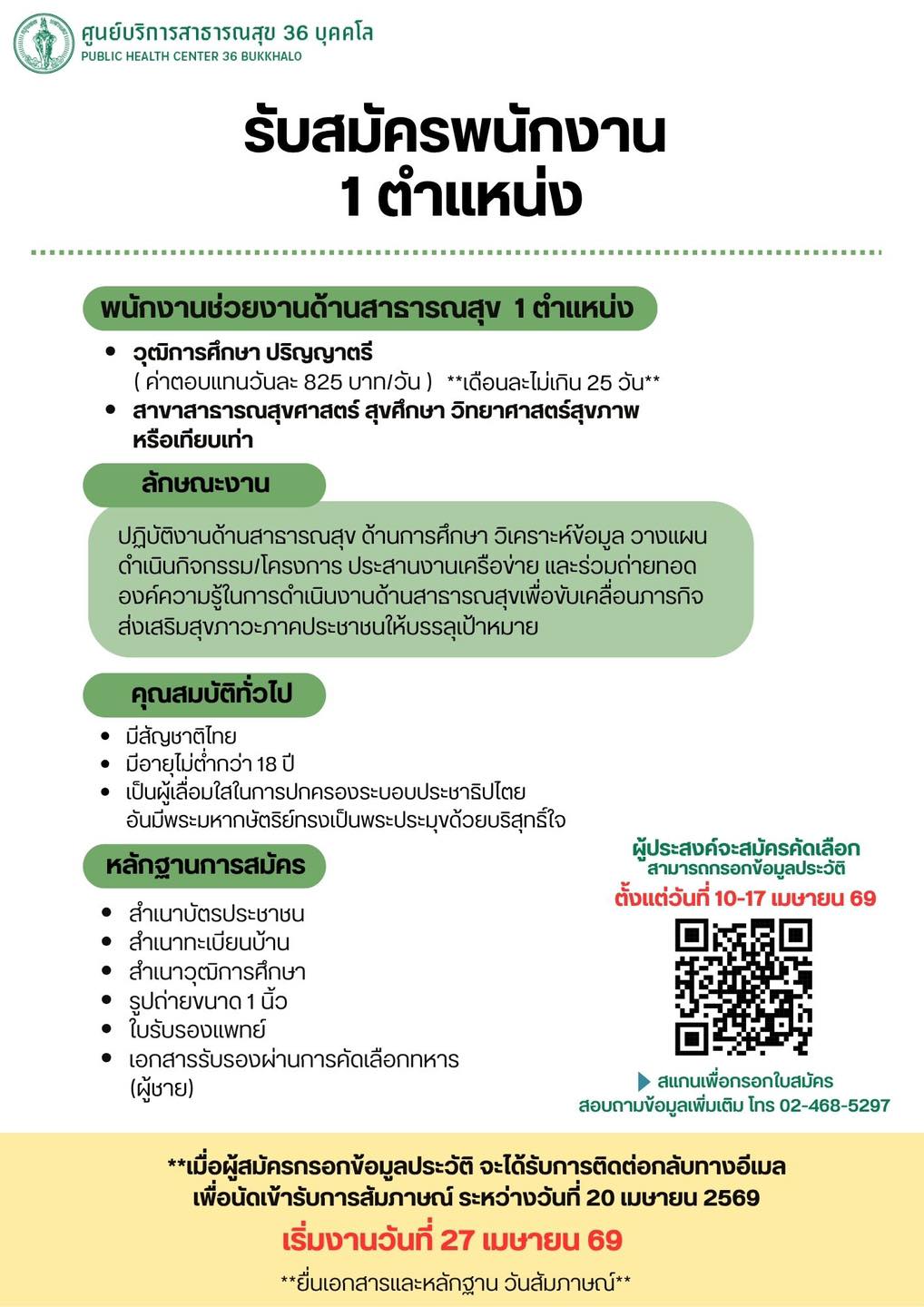 ศูนย์บริการสาธารณสุข 36 บุคคโล รับสมัครพนักงาน 1 ตำแหน่ง จ้างวันละ 825 บาท ตั้งแต่วันที่ 10-17 เม.ย. 2569 ที่เกี่ยวข้อง สำนักงานกองทุนพัฒนาสื่อปลอดภัยและสร้างสรรค์ รับสมัครจ้างเหมาบริการบุคคลภายนอก 1 อัตรา ตั้งแต่บัดนี้ถึง 24 เม.ย. 2569 17 เม.ย. 2569 เวลา 12:43 น. 226 คณะสัตวแพทยศาสตร์ มหาวิทยาลัยเกษตรศาสตร์ รับสมัคร พนักงานมหาวิทยาลัยเงินรายได้ 6 อัตรา เงินเดือน 15,000 - 18,000 บาท ตั้งแต่วันที่ 23 มี.ค - 20 เม.ย. 2569 13 เม.ย. 2569 เวลา 16:39 น. 677 องค์การบริหารส่วนจังหวัดระยอง รับสมัครมีเหตุพิเศษที่ไม่จำเป็นต้องสอบแข่งขัน 3 อัตรา เงินเดือน 21,500 -26,500 บาท ตั้งแต่วันที่ 27 เม.ย. - 5 พ.ค. 2569 12 เม.ย. 2569 เวลา 23:52 น. 5,068 กองแผนงาน มหาวิทยาลัยมหาสารคาม รับสมัครลูกจ้างชั่วคราว 1 อัตรา เงินเดือน 16,500 บาท ตั้งแต่บัดนี้ถึง 24 เม.ย. 2569 5 เม.ย. 2569 เวลา 13:23 น. 1,636 โรงพยาบาลโคกโพธิ์ รับสมัครลูกจ้างเหมาบริการ 6 อัตรา เงินเดือน 7,260 - 12,350 บาท ตั้งแต่วันที่ 16-22 เม.ย. 2569 16 เม.ย. 2569 เวลา 20:11 น. 148 คณะบริหารธุรกิจและการบัญชี มหาวิทยาลัยขอนแก่น รับสมัครพนักงานมหาวิทยาลัย 1 อัตรา เงินเดือน 37,900 - 41,000 บาท ตั้งแต่วันที่ 30 มี.ค. - 30 มิ.ย. 2569 14 เม.ย. 2569 เวลา 22:58 น. 534 คณะเภสัชศาสตร์ มหาวิทยาลัยพะเยา รับสมัครบรรจุพนักงานมหาวิทยาลัย 1 อัตรา เงินเดือน 27,020 - 36,230 บาท ตั้งแต่บัดนี้ - 7 พ.ค. 2569 15 เม.ย. 2569 เวลา 19:17 น. 944 โรงเรียนพรหมานุสรณ์จังหวัดเพชรบุรี รับสมัครเป็นลูกจ้างชั่วคราว 1 อัตรา เงินเดือน 12,000 บาท ตั้งแต่บัดนี้- 30 เม.ย. 2569 17 เม.ย. 2569 เวลา 15:40 น. 667 ราชวิทยาลัยจุฬาภรณ์ รับสมัครบุคคลเพื่อเป็นผู้ปฏิบัติงาน 1 อัตรา เงินเดือน 18,000 บาท ตั้งแต่บัดนี้ - 22 เม.ย. 2569 14 เม.ย. 2569 เวลา 21:50 น. 341 โรงพยาบาลนางรอง รับสมัครบุคคลเข้ารับราชการ 6 อัตรา เงินเดือน 13,130 - 24,010 บาท ตั้งแต่วันที่ 7-30 เม.ย. 2569 30 มี.ค. 2569 เวลา 14:29 น. 3,064 สํานักงานสาธารณสุขจังหวัดชัยนาท รับสมัครพนักงานกระทรวงสาธารณสุขทั่วไป 6 อัตรา เงินเดือน 11,500 - 18,000 บาท ตั้งแต่วันที่ 17-23 เม.ย. 2569 9 เม.ย. 2569 เวลา 22:16 น. 2,248 โรงพยาบาลธรรมศาสตร์เฉลิมพระเกียรติ รับสมัครบุคคลเพื่อคัดเลือกเป็นพนักงานประจำ 1 อัตรา เงินเดือน 21,250 บาท ตั้งแต่วันที่ 7 ก.พ. 2568 - 30 ก.ย. 2569 6 ก.พ. 2568 เวลา 19:48 น. 18,702