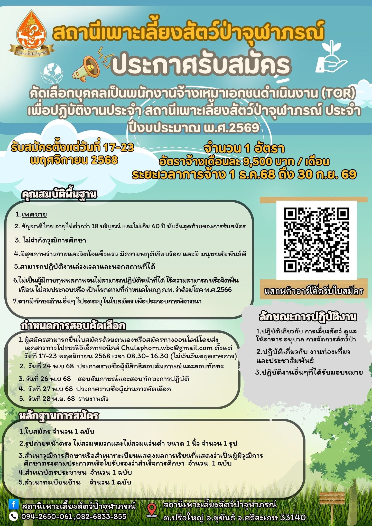 สถานีเพาะเลี้ยงสัตว์ป่าจุฬาภรณ์ รับสมัคร พนักงานจ้างเหมาเอกชนดําเนินงาน (TOR) 1 อัตรา เงินเดือน 9,500 บาท ตั้งแต่วันที่ 17-23 พ.ย. 2568 แสดงความคิดเห็น : - กรุณาใช้คำพูดที่สุภาพและไม่ทำให้ผู้อื่นเสื่อมเสีย - ห้ามมิให้ผู้ใดโพดขายสินค้าเด็ดขาด - ข้อความโพสโดยสาธารณชน โปรดใช้วิจารณญาณในการอ่าน ที่เกี่ยวข้อง โรงเรียนบ้านร้องเชียงแรง รับสมัคร ครูอัตราจ้าง 1 อัตรา เงินเดือน 8,000 บาท ตั้งแต่วันที่ 14-25 พ.ย. 2568 15 พ.ย. 2568 เวลา 19:19 น. 429 สำนักงานที่ดินจังหวัดตรัง รับสมัครพนักงานราชการทั่วไป 2 อัตรา เงินเดือน 12,630 - 16,700 บาท ตั้งแต่วันที่ 15 ธ.ค. - 19 ธ.ค. 2568 19 พ.ย. 2568 เวลา 18:06 น. 123 กองผลิตภัณฑ์สุขภาพนวัตกรรมและการบริการ รับสมัคร นักวิชาการอาหารและยา 1 อัตรา เงินเดือน 14,000 บาท ตั้งแต่บัดนี้ถึง 19 พ.ย. 2568 18 พ.ย. 2568 เวลา 10:46 น. 223 โรงพยาบาลส่งเสริมสุขภาพตําบลโนนสําราญ รับสมัคร ลูกจ้างชั่วคราว (รายเดือน) 2อัตรา เงินเดือน 11,500 - 18,000 บาท ตั้งแต่บัดนี้ถึง 28 พ.ย. 2568 7 พ.ย. 2568 เวลา 12:32 น. 492 มหาวิทยาลัยอุบลราชธานี รับสมัคร จ้างเหมาบริการรายบุคคล 1อัตรา เงินเดือน 14,950 บาท ตั้งแต่วันที่ 14-30 พ.ย. 2568 15 พ.ย. 2568 เวลา 21:34 น. 948 กรมเจ้าท่า รับสมัครบุคคลเข้ารับราชการ 37 อัตรา เงินเดือน 18,150 - 19,970 บาท ตั้งแต่วันที่ 17 พ.ย. - 8 ธ.ค. 2568 4 พ.ย. 2568 เวลา 18:18 น. 3,141 โรงพยาบาลบ้านแพ้ว (องค์การมหาชน) รับสมัครบุคคลเข้าปฏิบัติงาน 1 อัตรา ตั้งแต่บัดนี้ - 30 พ.ย. 2568 16 พ.ย. 2568 เวลา 19:20 น. 792 สํานักงานเขตพื้นที่การศึกษาประถมศึกษาอุทัยธานี เขต 2 รับสมัคร พนักงานราชการทั่วไป 10 อัตรา เงินเดือน 21,780 บาท ตั้งแต่วันที่ 20-26 พ.ย. 2568 15 พ.ย. 2568 เวลา 18:13 น. 595 สถานีเพาะเลี้ยงสัตว์ป่าจุฬาภรณ์ รับสมัคร พนักงานจ้างเหมาเอกชนดําเนินงาน (TOR) 1 อัตรา เงินเดือน 9,500 บาท ตั้งแต่วันที่ 17-23 พ.ย. 2568 19 พ.ย. 2568 เวลา 19:09 น. 15 สถาบันวิทยาลัยชุมชน รับสมัคร บรรจุเข้ารับราชการ 6 อัตรา เงินเดือน 21,500 - 22,620 บาท ตั้งแต่วันที่ 25 พ.ย. - 1 ธ.ค. 2568 19 พ.ย. 2568 เวลา 15:08 น. 83 สํานักงานยุติธรรมจังหวัดสมุทรสาคร รับสมัคร ตําแหน่ง นิติกร 1 อัตรา เงินเดือน 18,150 บาท ตั้งแต่วันที่ 20 ต.ค. - 20 พ.ย. 2568 31 ต.ค. 2568 เวลา 11:39 น. 371 โรงพยาบาลส่งเสริมสุขภาพตําบลหนองมะค่า รับสมัคร ลูกจ้างชั่วคราว 1 อัตรา เงินเดือน 11,900 บาท ตั้งแต่วันที่ 20 ต.ค. - 20 พ.ย. 2568 9 พ.ย. 2568 เวลา 12:29 น. 311