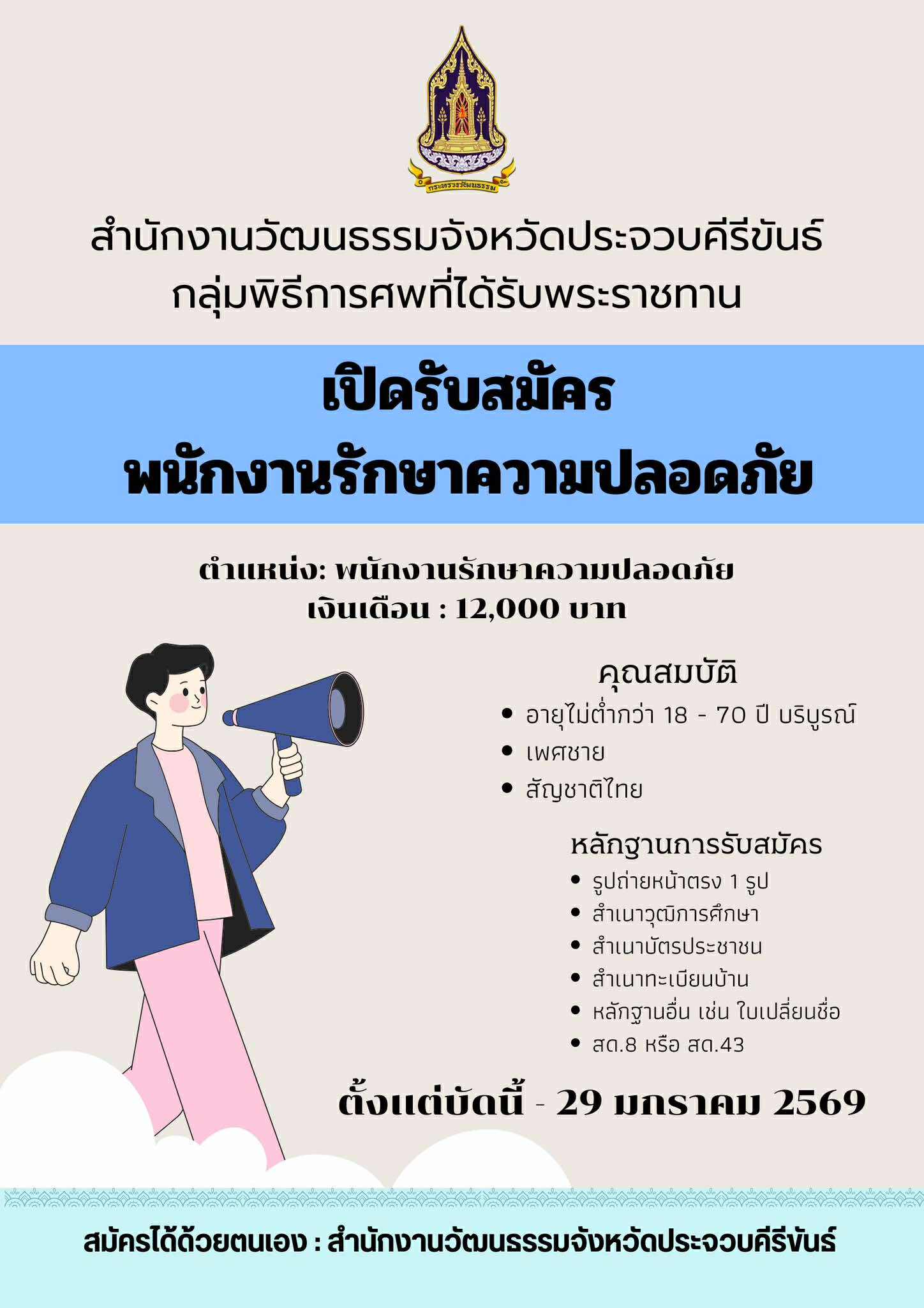 สำนักงานวัฒนธรรมจังหวัดประจวบคีรีขันธ์ รับสมัคร พนักงานรักษาความปลอดภัย 1 อัตรา เงินเดือน 12,000 บาท ตั้งแต่บัดนี้ถึง 29 ม.ค. 2569 แสดงความคิดเห็น : - กรุณาใช้คำพูดที่สุภาพและไม่ทำให้ผู้อื่นเสื่อมเสีย - ห้ามมิให้ผู้ใดโพดขายสินค้าเด็ดขาด - ข้อความโพสโดยสาธารณชน โปรดใช้วิจารณญาณในการอ่าน ที่เกี่ยวข้อง วิทยาลัยเทคนิคบางนรา รับสมัครบุคคลเป็นพนักงานราชการทั่วไป 1 อัตรา เงินเดือน 21,780 บาท ตั้งแต่วันที่ 11 - 24 ก.พ. 2569 26 ม.ค. 2569 เวลา 19:10 น. 634 โรงพยาบาลพระปกเกล้า รับสมัครลูกจ้างชั่วคราว 6 อัตรา ค้างจ้างวันละ 360 - 650 บาท ตั้งแต่บัดนี้ - 30 ม.ค. 2569 26 ม.ค. 2569 เวลา 19:03 น. 528 สํานักงานคณะกรรมการสุขภาพแห่งชาติ (สช.) รับสมัคร ผู้ช่วยวิจัย 1 อัตรา ตั้งแต่บัดนี้ถึง 27 ม.ค. 2569 14 ม.ค. 2569 เวลา 15:38 น. 626 โรงพยาบาลมหาวิทยาลัยอุบลราชธานี รับสมัครพนักงานมหาวิทยาลัย 1 อัตรา เงินเดือน 24,500 บาท ตั้งแต่บัดนี้ - 2 ก.พ. 2569 20 ม.ค. 2569 เวลา 19:39 น. 3,154 โรงพยาบาลพระนั่งเกล้า รับสมัครพนักงานกระทรวงสาธารณสุขทั่วไป 2 อัตรา เงินเดือน 9,400 - 21,000 บาท ตั้งแต่บัดนี้ - 13 ก.พ. 2569 17 ม.ค. 2569 เวลา 17:28 น. 1,412 คณะวิทยาศาสตร์ มหาวิทยาลัยเชียงใหม่ รับสมัครคัดเลือกเป็นพนักงานมหาวิทยาลัย 1 อัตรา เงินเดือน 20,250 บาท ตั้งแต่บัดนี้ - 6 ก.พ. 2569 24 ม.ค. 2569 เวลา 19:41 น. 1,004 วิทยาลัยแพทยศาสตร์และการสาธารณสุข รับสมัคร ตําแหน่งอาจารย์ 9 อัตรา เงินเดือน 28,840 - 34,580 บาท ตั้งแต่วันที่ 22 ธ.ค. 2568 - 2 มี.ค. 2569 19 ธ.ค. 2568 เวลา 13:27 น. 2,465 โรงพยาบาลธรรมศาสตร์เฉลิมพระเกียรติ รับสมัครบุคคลเพื่อเป็นพนักงาน 3 อัตรา เงินเดือน 10,360 บาท ตั้งแต่บัดนี้ - 30 ก.ย. 2569 1 ธ.ค. 2568 เวลา 18:57 น. 1,340 เทศบาลเมืองปัตตานี รับสมัครบุคคลเป็นพนักงานจ้างทั่วไป 1 อัตรา เงินเดือน 9,000 บาท ตั้งแต่วันที่ 19 - 27 ม.ค. 2569 16 ม.ค. 2569 เวลา 19:08 น. 2,478 โรงพยาบาลธรรมศาสตร์เฉลิมพระเกียรติ รับสมัครบุคคลเพื่อคัดเลือกเป็นพนักงานประจำ 1 อัตรา เงินเดือน 21,250 บาท ตั้งแต่วันที่ 7 ก.พ. 2568 - 30 ก.ย. 2569 6 ก.พ. 2568 เวลา 19:48 น. 4,303 กรมวิทยาศาสตร์การแพทย์ รับสมัคร บุคคลเข้ารับราชการ 9 อัตรา เงินเดือน 18,150 - 27,960 บาท ตั้งแต่วันที่ 26-30 ม.ค. 2569 21 ม.ค. 2569 เวลา 20:34 น. 3,216 มหาวิทยาลัยพะเยา รับสมัครบุคคลเพื่อบรรจุเป็นพนักงานมหาวิทยาลัย 1 อัตรา เงินเดือน 23,780 บาท ตั้งแต่บัดนี้ - 19 ก.พ. 2569 25 ม.ค. 2569 เวลา 18:47 น. 1,645