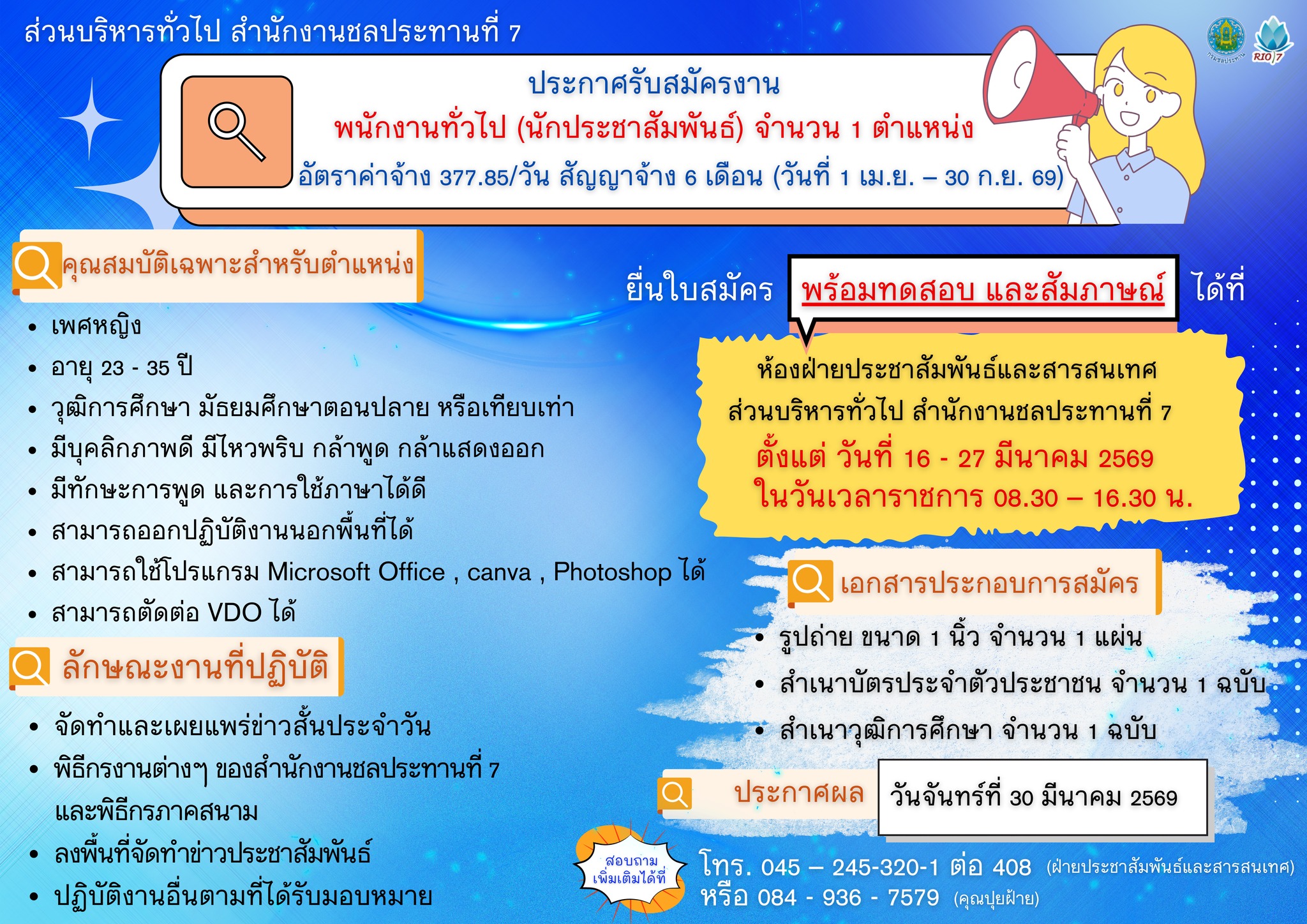 ส่วนบริหารทั่วไป สํานักงานชลประทานที่ 7 รับสมัครพนักงานทั่วไป 1 อัตรา จ้างวันละ 377.85 บาท ตั้งแต่วันที่ 16-27 มี.ค. 2569 แสดงความคิดเห็น : - กรุณาใช้คำพูดที่สุภาพและไม่ทำให้ผู้อื่นเสื่อมเสีย - ห้ามมิให้ผู้ใดโพดขายสินค้าเด็ดขาด - ข้อความโพสโดยสาธารณชน โปรดใช้วิจารณญาณในการอ่าน ที่เกี่ยวข้อง โรงพยาบาลโนนคูณ รับสมัครพนักงานกระทรวงสาธารณสุขทั่วไป 2 อัตรา เงินเดือน 18,000บาท ตั้งแต่วันที่ 23 ก.พ. - 31 มี.ค. 2569 17 ก.พ. 2569 เวลา 22:44 น. 929 โรงเรียนอนุบาลสำโรง รับสมัครครู 4 อัตรา ตั้งแต่บัดนี้เป็นต้นไป 3 มี.ค. 2569 เวลา 11:52 น. 1,651 โรงเรียนราชประชานุเคราะห์ 48จังหวัดจันทบุรี รับสมัคร จ้างเหมาบริการ 1 อัตรา เงินเดือน 9,000 บาท ตั้งแต่วันที่ 11-17 มี.ค. 2569 11 มี.ค. 2569 เวลา 22:19 น. 258 สํานักงานบังคับคดีจังหวัดนครราชสีมา รับสมัครลูกจ้างชั่วคราว 1 อัตรา เงินเดือน 18,150 บาท ตั้งแต่วันที่ 16 - 20 มี.ค. 2569 10 มี.ค. 2569 เวลา 14:59 น. 1,362 กองผลิตภัณฑ์สุขภาพนวัตกรรมและการบริการ รับสมัครลูกจ้างเหมาบริการ 3 อัตรา เงินเดือน 14,000 บาท ตั้งแต่บัดนี้ถึง 20 มี.ค. 2569 24 ก.พ. 2569 เวลา 21:29 น. 565 วิทยาลัยการเมืองการปกครอง มหาวิทยาลัยมหาสารคาม รับสมัคร ลูกจ้างชั่วคราว 3 อัตรา เงินเดือน 16,500 - 19,250 บาท ตั้งแต่บัดนี้ถึง 18 มี.ค. 2569 5 มี.ค. 2569 เวลา 14:12 น. 1,773 ศูนย์หม่อนไหมเฉลิมพระเกียรติสมเด็จพระนางเจ้าสิริกิติ์ พระบรมราชินีนาถ น่าน รับสมัคร จ้างเหมาบริการ 1 อัตรา เงินเดือน 10,000 บาท ตั้งแต่วันที่ 9-20 มี.ค. 2569 7 มี.ค. 2569 เวลา 11:45 น. 194 สํานักงานสวัสดิการและคุ้มครองแรงงานจังหวัดปราจีนบุรี รับสมัครพนักงานจ้างเหมาบริการ 1 อัตรา เงินเดือน 10,710 - 15,000 บาท ตั้งแต่วันที่ 12-18 มี.ค. 2569 7 มี.ค. 2569 เวลา 12:00 น. 769 เทศบาลนครสุราษฎร์ธานี รับสมัครพนักงานจ้าง 35 อัตรา เงินเดือน 9,000 บาท ตั้งแต่วันที่ 6-17 มี.ค. 2569 28 ก.พ. 2569 เวลา 16:37 น. 3,245 วิทยาลัยสารพัดช่างพระนครศรีอยุธยา รับสมัครพนักงานราชการทั่วไป 2 อัตรา เงินเดือน 21,780 บาท ตั้งแต่วันที่ 12 - 18 มี.ค. 2569 28 ก.พ. 2569 เวลา 18:11 น. 5,122 กรมยุโรป รับสมัคร จ้างเหมาบริการเอกชน 1 อัตรา เงินเดือน 15,000 บาท ตั้งแต่วันที่ 9-23 มี.ค.2569 12 มี.ค. 2569 เวลา 14:31 น. 413 โรงเรียนศรีภิรมย์พิทยา รับสมัครครูอัตราจ้าง 1 อัตรา เงินเดือน 7,000 บาท ตั้งแต่วันที่ 16-24 มี.ค. 2569 14 มี.ค. 2569 เวลา 10:00 น. 82