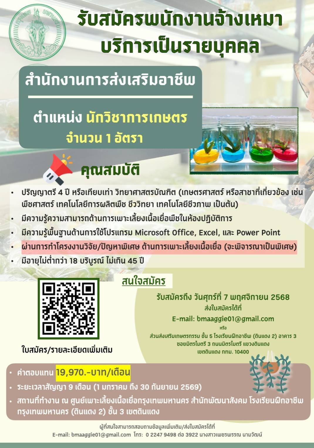สํานักงานการส่งเสริมอาชีพ รับสมัคร นักวิชาการเกษตร 1 อัตรา เงินเดือน 19,970 บาท ตั้งแต่บัดนี้ถึง 7 พ.ย. 2568 ไฟล์แนป ::: ประกาศรับสมัครสอบ อ้างอิง ::: Tag : นักวิชาการเกษตร แสดงความคิดเห็น : - กรุณาใช้คำพูดที่สุภาพและไม่ทำให้ผู้อื่นเสื่อมเสีย - ห้ามมิให้ผู้ใดโพดขายสินค้าเด็ดขาด - ข้อความโพสโดยสาธารณชน โปรดใช้วิจารณญาณในการอ่าน ที่เกี่ยวข้อง วิทยาลัยการสาธารณสุขสิรินธร จังหวัดตรัง รับสมัครบุคคลเป็นลูกจ้างเหมาบริการ 1 อัตรา เงินเดือน 23,000 บาท ตั้งแต่บัดนี้ - 6 พ.ย 2568 21 ต.ค. 2568 เวลา 20:35 น. 3,649 กรมวิชาการเกษตร รับสมัครสอบบรรจุบุคคลเข้ารับราชการ 11 อัตรา เงินเดือน 13,130 - 15,320 บาท ตั้งแต่วันที่ 14 พ.ย. - 4 ธ.ค. 2568 4 พ.ย. 2568 เวลา 19:44 น. 123 สำนักงานสหกรณ์จังหวัดหนองบัวลำภู รับสมัครพนักงานจ้างเหมาบริการ 1 อัตรา เงินเดือน 15,000 บาท ตั้งแต่วันที่ 3 - 7 พ.ย. 2568 31 ต.ค. 2568 เวลา 11:20 น. 415 สํานักงานตํารวจแห่งชาติ รับสมัครตํารวจชั้นสัญญาบัตร 700 อัตรา สมัครทางอินเทอร์เน็ต ตั้งแต่วันที่ 27 ต.ค. - 4 พ.ย. 2568 18 ต.ค. 2568 เวลา 21:49 น. 10,041 โรงเรียนจักรคำคณาทร จังหวัดลำพูน รับสมัครบุคคลเป็นลูกจ้างชั่วคราว 5 อัตรา เงินเดือน 8,000 - 9,140 บาท ตั้งแต่บัดนี้ - 18 พ.ย. 2568 4 พ.ย. 2568 เวลา 19:27 น. 142 มหาวิทยาลัยขอนแก่น รับสมัครบุคคลเข้าปฏิบัติงานเป็นพนักงานมหาวิทยาลัย 1 อัตรา เงินเดือน 18,000 บาท ตั้งแต่บัดนี้ - 13 พ.ย. 2568 1 พ.ย. 2568 เวลา 17:08 น. 2,512 โรงพยาบาลกระบี่ รับสมัครบุคคลเป็นพนักงานราชการ 1 อัตรา เงินเดือน 12,630 บาท ตั้งแต่บัดนี้ - 10 พ.ย. 2568 3 พ.ย. 2568 เวลา 09:57 น. 314 ศูนย์การขนส่งชายแดนจังหวัดนครพนม รับสมัครลูกจ้างชั่วคราว 2 อัตรา เงินเดือน 9,400 - 13,920 บาท ตั้งแต่วันที่ 3 - 13 พ.ย. 2568 23 ต.ค. 2568 เวลา 15:38 น. 1,612 ส่วนแผนงานอุทยานแห่งชาติ รับสมัคร นักวิชาการคอมพิวเตอร์ 1 อัตรา เงินเดือน 20,000 บาท ตั้งแต่บัดนี้ถึง 7 พ.ย. 2568 27 ต.ค. 2568 เวลา 18:02 น. 908 โรงเรียนบ้านคุ้งเขาเขียว (สําเภาราษฎร์บํารุง) รับสมัคร ครูอัตราจ้าง 1 อัตรา เงินเดือน 9,000 บาท ตั้งแต่วันที่ 3-7 พ.ย. 2568 3 พ.ย. 2568 เวลา 11:57 น. 64 กรมการแพทย์ รับสมัครบุคคลเข้ารับราชการ 105 อัตรา ตั้งแต่วันที่ 10 - 17 พ.ย. 2568 31 ต.ค. 2568 เวลา 10:51 น. 1,206 กรมการแพทย์ รับสมัคร พนักงานราชการทั่วไป 1 อัตรา เงินเดือน 21,780 บาท ตั้งแต่วันที่ 28 ต.ค. - 6 พ.ย. 2568 28 ต.ค. 2568 เวลา 12:50 น. 744