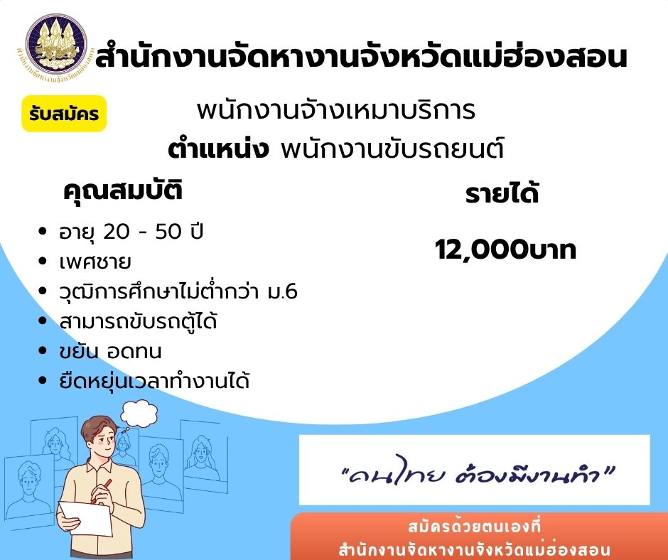 สํานักงานจัดหางานจังหวัดแม่ฮ่องสอน รับสมัคร พนักงานขับรถยนต์ 1 อัตรา เงินเดือน 12,000บาท ตั้งแต่บัดนี้ถึง 26 พ.ย. 2568 แสดงความคิดเห็น : - กรุณาใช้คำพูดที่สุภาพและไม่ทำให้ผู้อื่นเสื่อมเสีย - ห้ามมิให้ผู้ใดโพดขายสินค้าเด็ดขาด - ข้อความโพสโดยสาธารณชน โปรดใช้วิจารณญาณในการอ่าน ที่เกี่ยวข้อง กรมเจ้าท่า รับสมัครบุคคลเข้ารับราชการ 37 อัตรา เงินเดือน 18,150 - 19,970 บาท ตั้งแต่วันที่ 17 พ.ย. - 8 ธ.ค. 2568 4 พ.ย. 2568 เวลา 18:18 น. 3,161 คณะเกษตรศาสตร์ มหาวิทยาลัยเชียงใหม่ รับสมัคร ตำแหน่งอาจารย์สังกัดภาควิชาพืชศาสตร์ และปฐพีศาสตร์ 1 อัตรา เงินเดือน 41,000 บาท ตั้งแต่บัดนี้ถึง 31 ม.ค. 2569 31 ต.ค. 2568 เวลา 12:31 น. 332 แขวงทางหลวงชนบทแม่ฮ่องสอน รับสมัคร ลูกจ้างชั่วคราวรายเดือน 1 อัตรา เงินเดือน 9,400 บาท ตั้งแต่วันที่ 13-21 พ.ย. 2568 20 พ.ย. 2568 เวลา 11:00 น. 39 เทศบาลตำบลต้นธง รับสมัครบุคคลเป็นพนักงานจ้างทั่วไป 1 อัตรา เงินเดือน 9,000 บาท ตั้งแต่วันที่ 12 - 21 พ.ย. 2568 7 พ.ย. 2568 เวลา 20:00 น. 1,177 โรงพยาบาลพัทลุง รับสมัคร พนักงานกระทรวงสาธารณสุขทั่วไป 3 อัตรา เงินเดือน 8,690 - 9,400 บาท ตั้งแต่วันที่ 17-21 พ.ย. 2568 19 พ.ย. 2568 เวลา 18:19 น. 69 ศูนย์วิทยบริการและชุมชนสัมพันธ์ มหาวิทยาลัยสุโขทัยธรรมาธิราช เพชรบุรี รับสมัคร ลูกจ้างชั่วคราวรายเดือน 2 อัตรา เงินเดือน 15,000บาท ตั้งแต่วันที่ 10-28 พ.ย. 2568 11 พ.ย. 2568 เวลา 20:01 น. 563 สํานักงานเลขาธิการสภาผู้แทนราษฎร รับสมัครพนักงานจ้างเหมาบริการ 4 อัตา เงินเดือน 14,000 - 18,000 บาท ตั้งแต่วันที่ 17 พ.ย. - 8 ธ.ค. 2568 13 พ.ย. 2568 เวลา 12:40 น. 329 โรงเรียนบ้านประชาสามัคคี รับสมัคร ครูอัตราจ้าง 1 อัตรา เงินเดือน 5,000 บาท ตั้งแต่วันที่ 13-30 พ.ย. 2568 13 พ.ย. 2568 เวลา 12:51 น. 853 โรงเรียนระยองวิทยาคม รับสมัคร ลูกจ้างชั่วคราว 4 อัตรา ตั้งแต่วันที่ 13-21 พ.ย. 2568 16 พ.ย. 2568 เวลา 15:38 น. 230 วิทยาลัยสารพัดช่างพระนคร รับสมัครพนักงานบริหารทั่วไป (ครู) 1 อัตรา เงินเดือนน 21,780 บาท ตั้งแต่วันที่ 18 - 24 พ.ย. 2568 10 พ.ย. 2568 เวลา 18:45 น. 625 สํานักเทคโนโลยีชีวภัณฑ์สัตว์ ขยายระยะเวลารับสมัครพนักงานราชการทั่วไป 1 อัตรา เงินเดือน 28,360 บาท ตั้งแต่บัดนี้ - 21 พ.ย. 2568 13 พ.ย. 2568 เวลา 18:42 น. 1,459 มหาวิทยาลัยมหิดล วิทยาเขตอํานาจเจริญ รับสมัคร ลูกจ้างชั่วคราวเงินรายได้ 1 อัตรา เงินเดือน 15,000 บาท ตั้งแต่บัดนี้ถึง 28 พ.ย. 2568 10 พ.ย. 2568 เวลา 21:04 น. 691