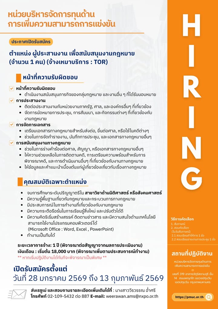 หน่วยบริหารจัดการทุนด้าน การเพิ่มความสามารถการแข่งขัน รับสมัครจ้างเหมาบริการ : TOR 1 อัตรา เงินเดือน 18,000 บาท ตั้งแต่วันที่ 28 ม.ค. - 13 ก.พ. 2569 แสดงความคิดเห็น : - กรุณาใช้คำพูดที่สุภาพและไม่ทำให้ผู้อื่นเสื่อมเสีย - ห้ามมิให้ผู้ใดโพดขายสินค้าเด็ดขาด - ข้อความโพสโดยสาธารณชน โปรดใช้วิจารณญาณในการอ่าน ที่เกี่ยวข้อง ศูนย์วิจัยและพัฒนาประมงน้ำจืดพัทลุง รับสมัครพนักงานราชการทั่วไป 1 อัตรา เงินเดือน 16,700 บาท ตั้งแต่วันที่ 9 - 17 ก.พ. 2569 19 ม.ค. 2569 เวลา 18:27 น. 3,844 มหาวิทยาลัยพะเยา รับสมัครบุคคลเพื่อบรรจุและแต่งตั้งเป็นพนักงาน 3 อัตรา เงินเดือน 27,020 - 36,230 บาท ตั้งแต่บัดนี้ - 6 มี.ค. 2569 9 ม.ค. 2569 เวลา 19:59 น. 4,946 สำนักงานขนส่งจังหวัดนครราชสีมา รับสมัครบุคคลจ้างเหมาบริการ 1 อัตรา เงินเดือน 10,500 บาท ตั้งแต่วันที่ 2 - 10 ก.พ. 2569 22 ม.ค. 2569 เวลา 19:24 น. 1,851 เทศบาลตําบลช่อแฮ รับสมัคร พนักงานจ้าง 1 อัตรา เงินเดือน 9,400 บาท ตั้งแต่วันที่ 26 ม.ค. - 3 ก.พ. 2569 19 ม.ค. 2569 เวลา 19:02 น. 255 สํานักเทคโนโลยีชีวภัณฑ์สัตว์ รับสมัคร พนักงานเงินทุนหมุนเวียน 3 อัตรา เงินเดือน 12,630 - 21,780 บาท ตั้งแต่วันที่ 26 ม.ค. -6 ก.พ. 2569 24 ม.ค. 2569 เวลา 13:35 น. 524 สถาบันจิตเวชศาสตร์สมเด็จเจ้าพระยา ขยายเวลารับสมัครพนักงานกระทรวงสาธารณสุขทั่วไป 2 อัตรา เงินเดือน 15,000 บาท ตั้งแต่บัดนี้ - 16 ก.พ. 2569 31 ม.ค. 2569 เวลา 19:04 น. 226 สถาบันกัลยาณ์ราชนครินทร์ รับสมัครพนักงานราชการทั่วไป 1 อัตรา เงินเดือน 27,540 บาท ตั้งแต่วันที่ 22 ม.ค. - 27 ก.พ. 2569 20 ม.ค. 2569 เวลา 20:03 น. 1,546 มูลนิธิส่งเสริมศิลปาชีพ ในสมเด็จพระนางเจ้าสิริกิติ์ พระบรมราชินีนาถ รับสมัครบุคคลเข้าทำงาน 2 อัตรา ตั้งแต่บัดนี้ - 31 ม.ค. 2569 23 ธ.ค. 2568 เวลา 19:22 น. 1,754 สถาบันเทคโนโลยีพระจอมเกล้าเจ้าคุณทหารลาดกระบัง จังหวัดชุมพร รับสมัคร ลูกจ้างชั่วคราว 2 อัตรา เงินเดือน 10,000 - 15,600 บาท ตั้งแต่วันที่ 27 ม.ค. - 12 ก.พ. 2569 31 ม.ค. 2569 เวลา 18:25 น. 53 วิทยาลัยเทคนิคกาฬสินธุ์ รับสมัคร พนักงานราชการทั่วไป 1 อัตรา เงินเดือน 21,780 บาท ตั้งแต่วันที่ 2-6 ก.พ. 2569 26 ม.ค. 2569 เวลา 18:07 น. 1,578 มณฑลทหารบกที่ 310 รับสมัครลูกจ้างชั่วคราว 3 อัตรา เงินเดือน 11,000 - 18,000บาท ตั้งแต่วันที่ 2-13 ก.พ. 2569 30 ม.ค. 2569 เวลา 12:20 น. 284 โรงพยาบาลธรรมศาสตร์เฉลิมพระเกียรติ รับสมัครบุคคลเพื่อเป็นพนักงาน 3 อัตรา เงินเดือน 10,360 บาท ตั้งแต่บัดนี้ - 30 ก.ย. 2569 1 ธ.ค. 2568 เวลา 18:57 น. 1,368