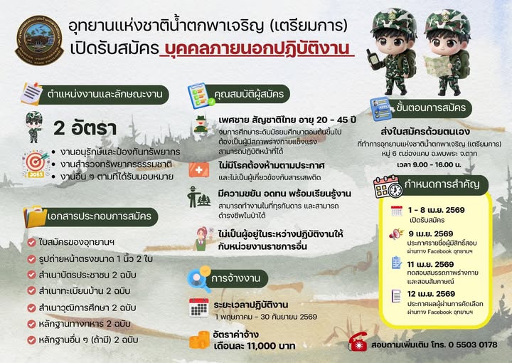 อุทยานแห่งชาติน้ําตกพาเจริญ รับสมัคร บุคคลภายนอกปฏิบัติงาน 2 อัตรา เงินเดือน 11,000 บาท ตั้งแต่วันที่ 1-8 เม.ย. 2569 ที่เกี่ยวข้อง โรงเรียนวัดจันทราวาส(ศุขประสารราษฎร์) รับสมัครครูอัตราจ้าง 1 อัตรา เงินเดือน 10,270 บาท ตั้งแต่วันที่ 16-22 เม.ย. 2569 12 เม.ย. 2569 เวลา 23:03 น. 388 โรงพยาบาลพนมไพร รับสมัคร ลูกจ้างชั่วคราวเงินบำรุง (รายวัน) 9 อัตรา จ้างวันละ 342 - 800 บาท ตั้งแต่วันที่ 10-24 เม.ย. 2569 16 เม.ย. 2569 เวลา 20:30 น. 180 มหาวิทยาลัยราชภัฏสวนสุนันทา รับสมัครบุคคลสอบบรรจุเป็นพนักงาน 1 อัตรา เงินเดือน 20,000 บาท ตั้งแต่วันที่ 2 - 28 เม.ย. 2569 31 มี.ค. 2569 เวลา 19:49 น. 2,868 องค์การบริหารส่วนจังหวัดชัยภูมิ รับสมัคร พนักงานจ้าง (ผู้พิการ) 3 อัตรา เงินเดือน 9,000 บาท ตั้งแต่วันที่ 8-24 เม.ย. 2569 30 มี.ค. 2569 เวลา 15:04 น. 957 โรงพยาบาลหนองสองห้อง รับสมัครลูกจ้างชั่วคราวเงินบํารุง 19 อัตรา จ้างวันละ 320 - 600 บาท ตั้งแต่วันที่ 8-23 เม.ย. 2569 8 เม.ย. 2569 เวลา 21:15 น. 502 กองทัพบก สอบคัดเลือกนายทหารประทวนคุณวุฒิปริญญา เลื่อนฐานะ 48 อัตรา ตั้งแต่วันที่ 27 มี.ค. - 22 เม.ย. 2569 27 มี.ค. 2569 เวลา 20:39 น. 3,372 โรงพยาบาลตะกั่วป่า รับสมัครลูกจ้างชั่วคราวเงินบํารุง (รายวัน) 2 อัตรา ค่าจ้างวันละ 380 - 400 บาท ตั้งแต่วันที่ 20 - 24 เม.ย. 2569 15 เม.ย. 2569 เวลา 20:06 น. 858 อุทยานวิทยาศาสตร์และเทคโนโลยี มหาวิทยาลัยวลัยลักษณ์ รับสมัครพนักงานวิสาหกิจ 1 อัตรา เงินเดือน 17,400 บาท ตั้งแต่บัดนี้ - 11 พ.ค. 2569 15 เม.ย. 2569 เวลา 19:36 น. 3,464 โรงเรียนบ้านปลักแรด รับสมัครครูอัตราจ้าง 3 อัตรา ตั้งแต่วันที่ 24 มี.ค. - 7 พ.ค. 2569 28 มี.ค. 2569 เวลา 20:53 น. 2,082 โรงพยาบาลการแพทย์แผนไทย มหาวิทยาลัยสงขลานครินทร์ รับสมัครลูกจ้างโครงการ 1 อัตรา เงินเดือน 15,000 บาท ตั้งแต่บัดนี้ - 24 เม.ย. 2569 10 เม.ย. 2569 เวลา 20:03 น. 1,534 โครงการศูนย์ภูฟ้าพัฒนาอันเนื่องมาจากพระราชดำริ รับสมัคร ลูกจ้างชั่วคราวรายวัน 11 อัตรา จ้างวันละ 377 - 652 บาท ตั้งแต่วันที่ 16-30 เม.ย. 2569 13 เม.ย. 2569 เวลา 22:46 น. 510 วิทยาลัยเกษตรและเทคโนโลยีกำแพงเพชร รับสมัครพนักงานราชการทั่วไป 1 อัตรา เงินเดือน 21,780 บาท ตั้งแต่วันที่ 20-24 เม.ย. 2569 12 เม.ย. 2569 เวลา 12:59 น. 2,136