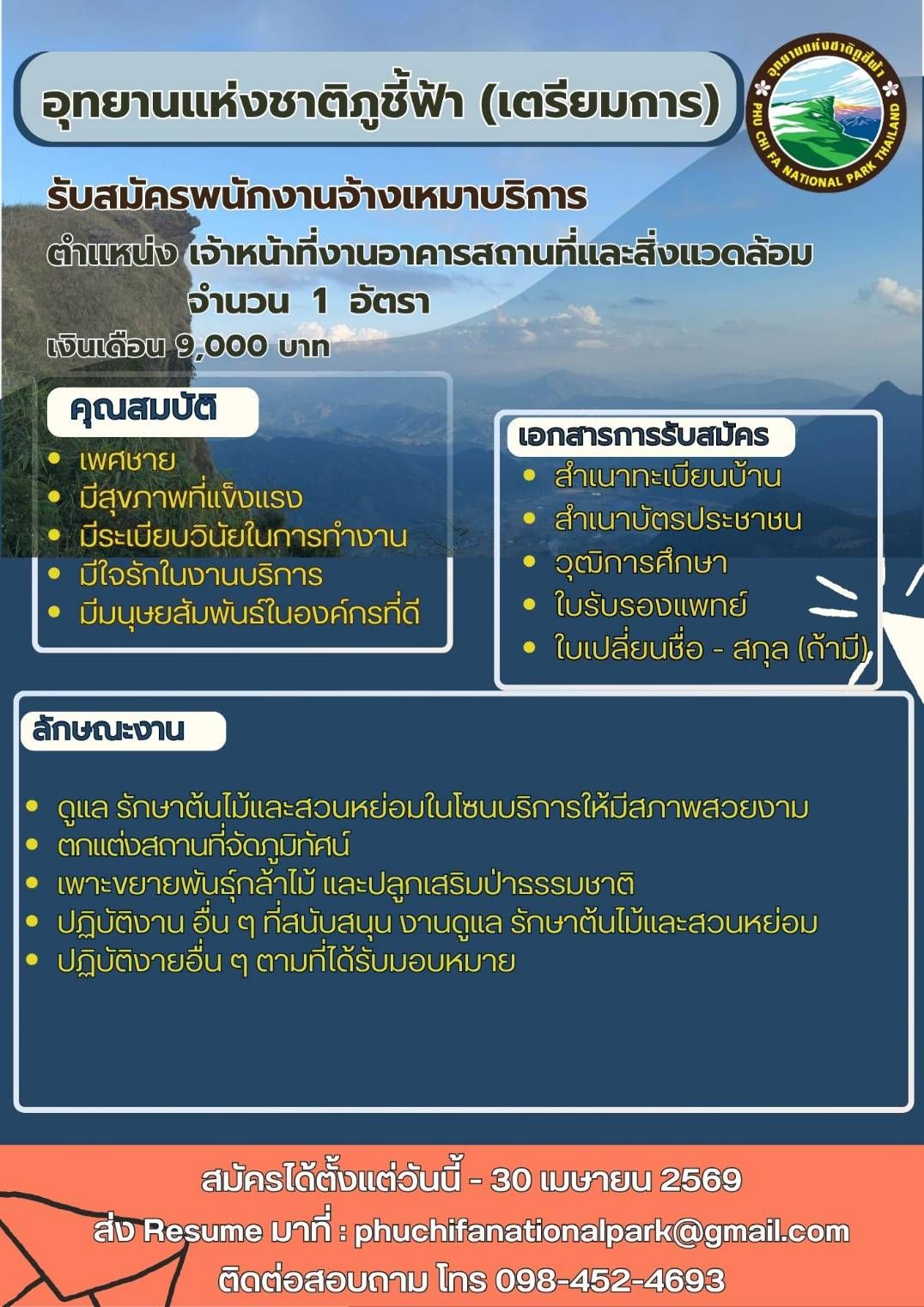 อุทยานแห่งชาติภูชี้ฟ้า รับสมัครพนักงานจ้างเหมาบริการ 1 อัตรา เงินเดือน 9,000 บาท ตั้งแต่บัดนี้ถึง 30 เม.ย. 2569 ที่เกี่ยวข้อง ธนาคารเพื่อการเกษตรและสหกรณ์การเกษตร รับสมัครบุคคลภายนอกเพื่อปฏิบัติงาน 1 อัตรา เงินเดือน 12,000 บาท ตั้งแต่วันที่ 27 เม.ย. - 7 พ.ค. 2569 25 เม.ย. 2569 เวลา 22:31 น. 1,708 สํานักอํานวยการประจําศาลจังหวัดธัญบุรี รับสมัครจ้างเหมาบริการรายบุคคล 1 อัตรา เงินเดือน 19,950 บาท ตั้งแต่บัดนี้ - 30 เม.ย. 2569 16 เม.ย. 2569 เวลา 19:38 น. 4,050 กรมบังคับคดี รับสมัครพนักงานราชการทั่วไป 11 อัตรา เงินเดือน 13,660 บาท ตั้งแต่วันที่ 27 เม.ย. - 12 พ.ค. 2569 27 เม.ย. 2569 เวลา 10:56 น. 3,035 สำนักงานสาธารณสุขจังหวัดบุรีรัมย์ รับสมัครบุคคลเข้ารับราชการ 5 อัตรา เงินเดือน 13,130-19,970 บาท ตั้งแต่วันที่ 27 เม.ย. - 1 พ.ค. 2569 23 เม.ย. 2569 เวลา 20:25 น. 2,567 ศูนย์บริการสาธารณสุข 3 บางซื่อ รับสมัครบุคคลภายนอกช่วยปฏิบัติราชการ 9 อัตรา จ้างวันละ 682 -1,200 บาท ตั้งแต่วันที่ 20 เม.ย. - 8 พ.ค. 2569 13 เม.ย. 2569 เวลา 23:08 น. 2,052 สถาบันวิจัยและพัฒนาแห่งมหาวิทยาลัยเกษตรศาสตร์ รับสมัครพนักงานมหาวิทยาลัยเงินรายได้ 1 อัตรา เงินเดือน 17,500 บาท ตั้งแต่บัดนี้ถึง 28 พ.ค. 2569 24 เม.ย. 2569 เวลา 20:37 น. 584 คณะเภสัชศาสตร์ มหาวิทยาลัยเกษตรศาสตร์ รับสมัครพนักงานมหาวิทยาลัย 2 อัตรา เงินเดือน 21,000 - 24,000 บาท ตั้งแต่บัดนี้ - 6 พ.ค. 2569 14 เม.ย. 2569 เวลา 20:32 น. 2,915 วิทยาลัยเทคนิควาปีปทุม รับสมัครลูกจ้างชั่วคราว 1 อัตรา เงินเดือน 8,340 บาท ตั้งแต่วันที่ 27 เม.ย. - 8 พ.ค. 2569 26 เม.ย. 2569 เวลา 20:36 น. 141 สำนักงานการตรวจเงินแผ่นดินภูมิภาคที่ 3 รับสมัครลูกจ้างสมทบ 1 อัตรา เงินเดือน 11,500 บาท ตั้งแต่วันที่ 24 มี.ค. - 30 เม.ย. 2569 21 มี.ค. 2569 เวลา 23:30 น. 1,472 โรงพยาบาลค่ายสรรพสิทธิประสงค์ รับสมัครลูกจ้างชั่วคราว 1 อัตรา ตั้งแต่วันที่ 24 เม.ย. - 8 พ.ค. 2569 28 เม.ย. 2569 เวลา 13:58 น. 47 โรงเรียนวัดควนวิเศษ รับสมัครบุคคลเป็นครูอัตราจ้าง 2 อัตรา เงินเดือน 10,000 บาท ตั้งแต่วันที่ 30 เม.ย. - 1 พ.ค. 2569 27 เม.ย. 2569 เวลา 20:06 น. 843 โรงเรียนพังเคนพิทยา รับสมัครลูกจ้างชั่วคราวทำหน้าที่ครูผู้สอน 2 อัตรา เงินเดือน 9,000 บาท ตั้งแต่วันที่ 29 เม.ย. -1 พ.ค. 2569 24 เม.ย. 2569 เวลา 12:40 น. 1,135