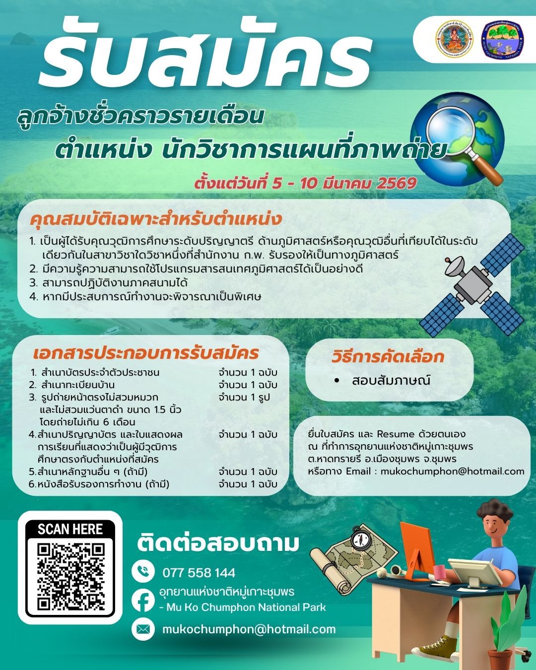 อุทยานแห่งชาติหมู่เกาะชุมพร รับสมัครนักวิชาการแผนที่ภาพถ่าย 1 อัตรา เงินเดือน 15,000 บาท ตั้งแต่วันที่ 5-10 มี.ค. 2569 แสดงความคิดเห็น : - กรุณาใช้คำพูดที่สุภาพและไม่ทำให้ผู้อื่นเสื่อมเสีย - ห้ามมิให้ผู้ใดโพดขายสินค้าเด็ดขาด - ข้อความโพสโดยสาธารณชน โปรดใช้วิจารณญาณในการอ่าน ที่เกี่ยวข้อง กรมประมง รับสมัครบุคคลเข้ารับราชการ 9 อัตรา เงินเดือน 13,130 - 19,970 บาท ตั้งแต่วันที่ 27 ก.พ. - 24 มี.ค. 2569 19 ก.พ. 2569 เวลา 21:31 น. 2,105 วิทยาลัยเทคนิคบางนรา รับสมัครพนักงานราชการทั่วไป 1 อัตรา เงินเดือน 21,780 บาท ตั้งแต่วันที่ 12-20 มี..ค 2569 1 มี.ค. 2569 เวลา 12:56 น. 569 โรงเรียนแม่แจ่ม รับสมัครลูกจ้างชั่วคราว 1 อัตรา เงินเดือน 9,000 บาท ตั้งแต่วันที่ 16-25 มี.ค. 2569 14 มี.ค. 2569 เวลา 13:49 น. 334 โรงพยาบาลบรบือ รับสมัครลูกจ้างชั่วคราวเงินำารุง (รายวัน) 13 อัตรา จ้างวันละ 330 - 750 บาท ตั้งแต่วันที่ 9-20 มี.ค. 2569 14 มี.ค. 2569 เวลา 12:26 น. 102 โรงเรียนสายน้ำทิพย์ รับสมัครบุคคลเพื่อจ้างเป็นครูอัตราจ้าง 1 อัตรา เงินเดือน 15,000 บาท ตั้งแต่บัดนี้ - 10 เม.ย. 2569 13 มี.ค. 2569 เวลา 21:26 น. 1,090 เทศบาลตำบลยางเนื้ง รับสมัครบุคคลเป็นพนักงานจ้าง 2 อัตรา เงินเดือน 9,000 บาท ตั้งแต่วันที่ 16 - 24 มี.ค. 2569 10 มี.ค. 2569 เวลา 19:09 น. 837 โรงเรียนสายน้ำทิพย์ รับสมัครบุคคลเป็นครูอัตราจ้าง 1 อัตรา เงินเดือน 15,000 บาท ตั้งแต่บัดนี้ - 10 เม.ย. 2569 14 มี.ค. 2569 เวลา 17:27 น. 1,261 อําเภอม่วงสามสิบ รับสมัครลูกจ้างเหมาบริการ 1 อัตรา เงินเดือน 9,000 บาท ตั้งแต่วันที่ 18-20 มี.ค. 2569 13 มี.ค. 2569 เวลา 19:30 น. 169 สํานักงานเขตพื้นที่การศึกษาประถมศึกษานนทบุรี เขต 2 รับสมัครจ้างเหมาบริการ 2 อัตรา เงินเดือน 9,000 บาท ตั้งแต่วันที่ 9-17 มี.ค.2569 8 มี.ค. 2569 เวลา 14:16 น. 411 สำนักงานแรงงานจังหวัดนครราชสีมา สาขาอำเภอปากช่อง รับสมัครพนักงานจ้างเหมาบริการ เงินเดือน 15,000 บาท ตั้งแต่วันที่ 16-20 มี.ค 2569 15 มี.ค. 2569 เวลา 16:33 น. 159 ศูนย์วิจัยและพัฒนาการเพาะเลี้ยงสัตว์น้ำชายฝั่งสมุทรสงคราม รับสมัครพนักงานราชการทั่วไป 1 อัตรา เงินเดือน 13,660 บาท ตั้งแต่วันที่ 10 - 18 มี.ค. 2569 20 ก.พ. 2569 เวลา 19:04 น. 860 สํานักงานพาณิชย์จังหวัดพะเยา รับสมัครจ้างเหมาบริการ 3 อัตรา เงินเดือน 10,500 - 13,500 บาท ตั้งแต่วันที่ 16-20 มี.ค. 2569 13 มี.ค. 2569 เวลา 22:57 น. 651