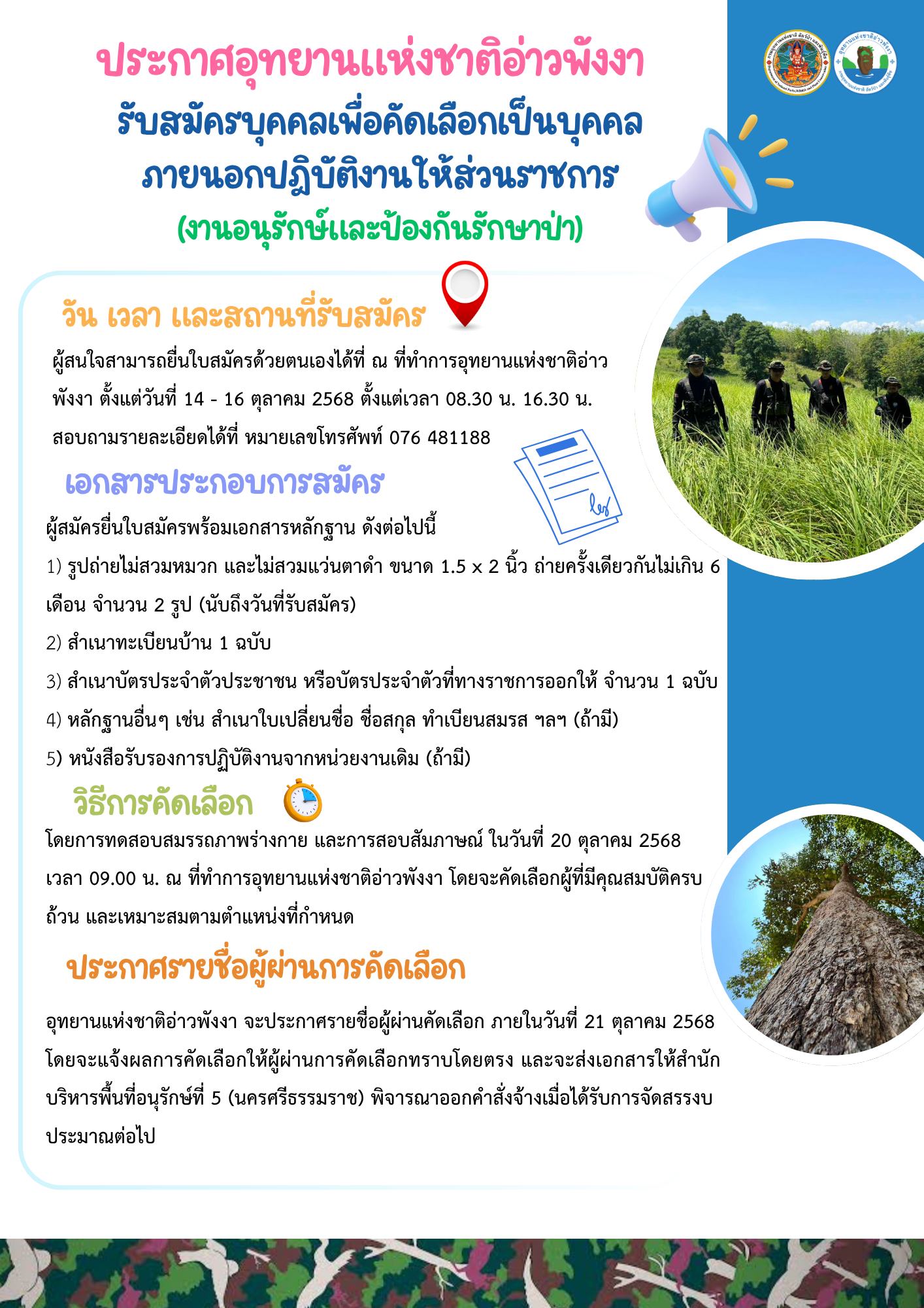 อุทยานแห่งชาติอ่าวพังงา รับสมัคร งานอนุรักษ์และป้องกันรักษาป่า ตั้งแต่วันที่ 14-16 ต.ค. 2568 ไฟล์แนป ::: ประกาศรับสมัครสอบ อ้างอิง ::: Tag : แสดงความคิดเห็น : - กรุณาใช้คำพูดที่สุภาพและไม่ทำให้ผู้อื่นเสื่อมเสีย - ห้ามมิให้ผู้ใดโพดขายสินค้าเด็ดขาด - ข้อความโพสโดยสาธารณชน โปรดใช้วิจารณญาณในการอ่าน ที่เกี่ยวข้อง คณะเทคโนโลยี มหาวิทยาลัยขอนแก่น รับสมัครพนักงานมหาวิทยาลัย 1 อัตรา เงินเดือน 18,000 บาท ตั้งแต่บัดนี้ - 7 พ.ย. 2568 27 ต.ค. 2568 เวลา 19:37 น. 1,485 สํานักงานจังหวัดตาก รับสมัครบุคคลเป็นพนักงานราชการทั่วไป 1 อัตรา เงินเดือน 21,780 บาท ตั้งแต่วันที่ 3 - 11 พ.ย. 2568 23 ต.ค. 2568 เวลา 16:02 น. 4,739 ธนาคารออมสิน รับสมัครพนักงาน เงินเดือน 48,600 - 94,100 บาท ตั้งแต่บัดนี้ - 7 พ.ย 2568 27 ต.ค. 2568 เวลา 14:50 น. 4,976 โรงพยาบาลสุไหงโก-ลก รับสมัครเจ้าพนักงานพัสดุ 1 อัตรา เงินเดือน 15,000 บาท ตั้งแต่วันที่ 3 - 7 พ.ย. 2568 3 พ.ย. 2568 เวลา 10:25 น. 275 องค์การสวนสัตว์แห่งประเทศไทย รับสมัครลูกจ้างชั่วคราว เงินเดือน 15,000 บาท ตั้งแต่วันที่ 28 ตุลาคม - 6 พ.ย 2568 28 ต.ค. 2568 เวลา 16:02 น. 1,349 โรงเรียนบ้านคุ้งเขาเขียว (สําเภาราษฎร์บํารุง) รับสมัคร ครูอัตราจ้าง 1 อัตรา เงินเดือน 9,000 บาท ตั้งแต่วันที่ 3-7 พ.ย. 2568 3 พ.ย. 2568 เวลา 11:57 น. 197 สํานักงานปศุสัตว์จังหวัดนราธิวาส รับสมัครพนักงานราชการทั่วไป 1 อัตรา เงินเดือน 21,780 บาท ตั้งแต่วันที่ 3 - 7 พ.ย. 2568 28 ต.ค. 2568 เวลา 17:56 น. 1,242 สถาบันการอาชีวศึกษาภาคตะวันออกเฉียงเหนือ 4 รับสมัคร ลูกจ้างชั่วคราว 2 อัตรา เงินเดือน 13,920 บาท ตั้งแต่วันที่ 10-14 พ.ย. 2568 30 ต.ค. 2568 เวลา 17:47 น. 550 โรงเรียนเทศบาลวัดท่าโพธิ์ รับสมัคร ครูอัตราจ้าง 1 อัตรา เงินเดือน 8,900 บาท ตั้งแต่วันที่ 3-6 พ.ย. 2568 3 พ.ย. 2568 เวลา 13:07 น. 160 กรมวิชาการเกษตร รับสมัครสอบบรรจุบุคคลเข้ารับราชการ 11 อัตรา เงินเดือน 13,130 - 15,320 บาท ตั้งแต่วันที่ 14 พ.ย. - 4 ธ.ค. 2568 4 พ.ย. 2568 เวลา 19:44 น. 399 โรงพยาบาลสุโขทัย รับสมัครบุคคลเข้ารับราชการ 4 อัตรา เงินเดือน 18,150 - 19,970 บาท ตั้งแต่วันที่ 3 - 7 พ.ย. 2568 30 ต.ค. 2568 เวลา 18:44 น. 814 สํานักงานพัฒนาระบบสาธารณสุข รับสมัคร บุคคลภายนอกที่ช่วยปฏิบัติราชการ 4 อัตรา อัตราจ้างวันละ 240 - 825 บาท ตั้งแต่วันที่ 9- ต.ค. - 7 พ.ย. 2568 14 ต.ค. 2568 เวลา 21:55 น. 537