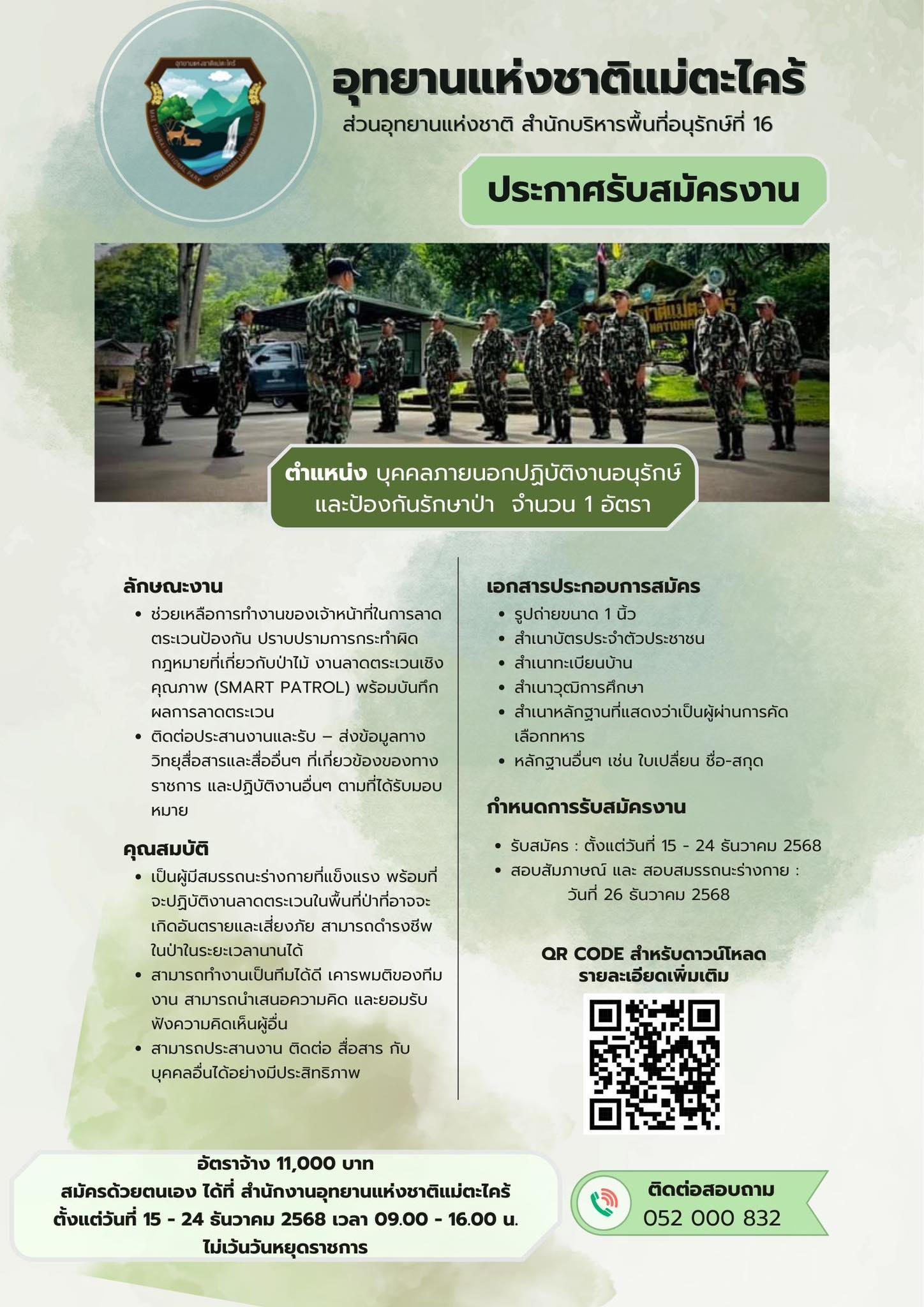 อุทยานแห่งชาติแม่ตะไคร้ รับสมัคร บุคคลภายนอกปฏิบัติงานอนุรักษ์ 1 อัตรา เงินเดือน 11,000 บาท ตั้งแต่วันที่ 15-24 ธ.ค. 2568 แสดงความคิดเห็น : - กรุณาใช้คำพูดที่สุภาพและไม่ทำให้ผู้อื่นเสื่อมเสีย - ห้ามมิให้ผู้ใดโพดขายสินค้าเด็ดขาด - ข้อความโพสโดยสาธารณชน โปรดใช้วิจารณญาณในการอ่าน ที่เกี่ยวข้อง คณะเภสัชศาสตร์ มหาวิทยาลัยอุบลราชธานี รับสมัครสอบเเข่งขันบุคคลทั่วไปเป็นพนักงานวิทยาลัย 1 อัตรา เงินเดือน 21,000 บาท ตั้งแต่บัดนี้-18 ม.ค. 2569 5 ม.ค. 2569 เวลา 16:28 น. 1,263 โรงเรียนบุเปือยวิทยาคาร รับสมัคร จ้างเหมาบริการ 1 อัตรา เงินเดือน 9,000บาท ตั้งแต่วันที่ 12-18 ม.ค. 2569 11 ม.ค. 2569 เวลา 13:20 น. 258 สํานักงานธนารักษ์พื้นที่นครสวรรค์ รับสมัคร ลูกจ้างชั่วคราว 1 อัตรา เงินเดือน 13,920 บาท ตั้งแต่วันที่ 12-16 ม.ค. 2569 5 ม.ค. 2569 เวลา 07:23 น. 1,444 สํานักงานคณะกรรมการอ้อยและน้ําตาลทราย รับสมัคร ลูกจ้างประจําเงินกองทุน 17 อัตรา เงินเดือน 11,380 - 18,380 บาท ตั้งแต่วันที่ 9-20 ม.ค. 2569 10 ม.ค. 2569 เวลา 10:58 น. 305 กองทัพบก รับสมัครทหารกองเกินเข้ารับราชการทหารกองประจำการ (กรณีพิเศษ) ด้วยระบบออนไลน์ ตั้งแต่บัดนี้ถึง 25 ม.ค. 2569 29 ธ.ค. 2568 เวลา 08:53 น. 4,291 สถาบันวิจัยพหุศาสตร์ มหาวิทยาลัยเชียงใหม่ รับสมัครพนักงานมหาวิทยาลัย 1 อัตรา เงินเดือน 41,000 บาท ตั้งแต่บัดนี้ - 16 ม.ค. 2569 7 ม.ค. 2569 เวลา 10:37 น. 1,360 สํานักงานคณะกรรมการการแข่งขันทางการค้า รับสมัคร พนักงาน 1 อัตรา เงินเดือน 35,500 บาท ตั้งแต่วันที่ 25 ธ.ค. 2568 - 15 ก.พ. 2569 30 ธ.ค. 2568 เวลา 10:30 น. 1,680 สํานักงานสรรพากรพื้นที่ศรีสะเกษ รับสมัครลูกจ้างชั่วคราว 1 อัตรา เงินเดือน 18,150 บาท ตั้งเเต่วันที่ 19-23 ม.ค. 2569 10 ม.ค. 2569 เวลา 20:45 น. 1,277 คณะเศรษฐศาสตร์ มหาวิทยาลัยแม่โจ้ รับสมัครบุคคลเป็นพนักงานมหาวิทยาลัย 1 อัตรา เงินเดือน 34,000 บาท ตั้งแต่บัดนี้ - 30 ม.ค. 2569 20 ธ.ค. 2568 เวลา 10:31 น. 1,231 วิทยาลัยสารพัดช่างอุดรธานี รับสมัคร ลูกจ้างเหมาบริการ 1 อัตรา เงินเดือน 8,500 บาท ตั้งแต่วันที่ 8-19 ม.ค. 2569 15 ม.ค. 2569 เวลา 15:30 น. 78 เทศบาลเมืองท่าช้าง รับสมัครบุคคลเป็นพนักงานจ้าง 3 อัตรา เงินเดือน 9,000 บาท ตั้งแต่วันที่ 12 - 20 ม.ค. 2569 10 ม.ค. 2569 เวลา 17:48 น. 253 โรงพยาบาลมะเร็งอุบลราชธานี รับสมัคร ตําแหน่งนักวิชาการสาธารณสุข 1 อัตรา ตั้งแต่วันที่ 7-27 ม.ค. 2569 9 ม.ค. 2569 เวลา 10:02 น. 484