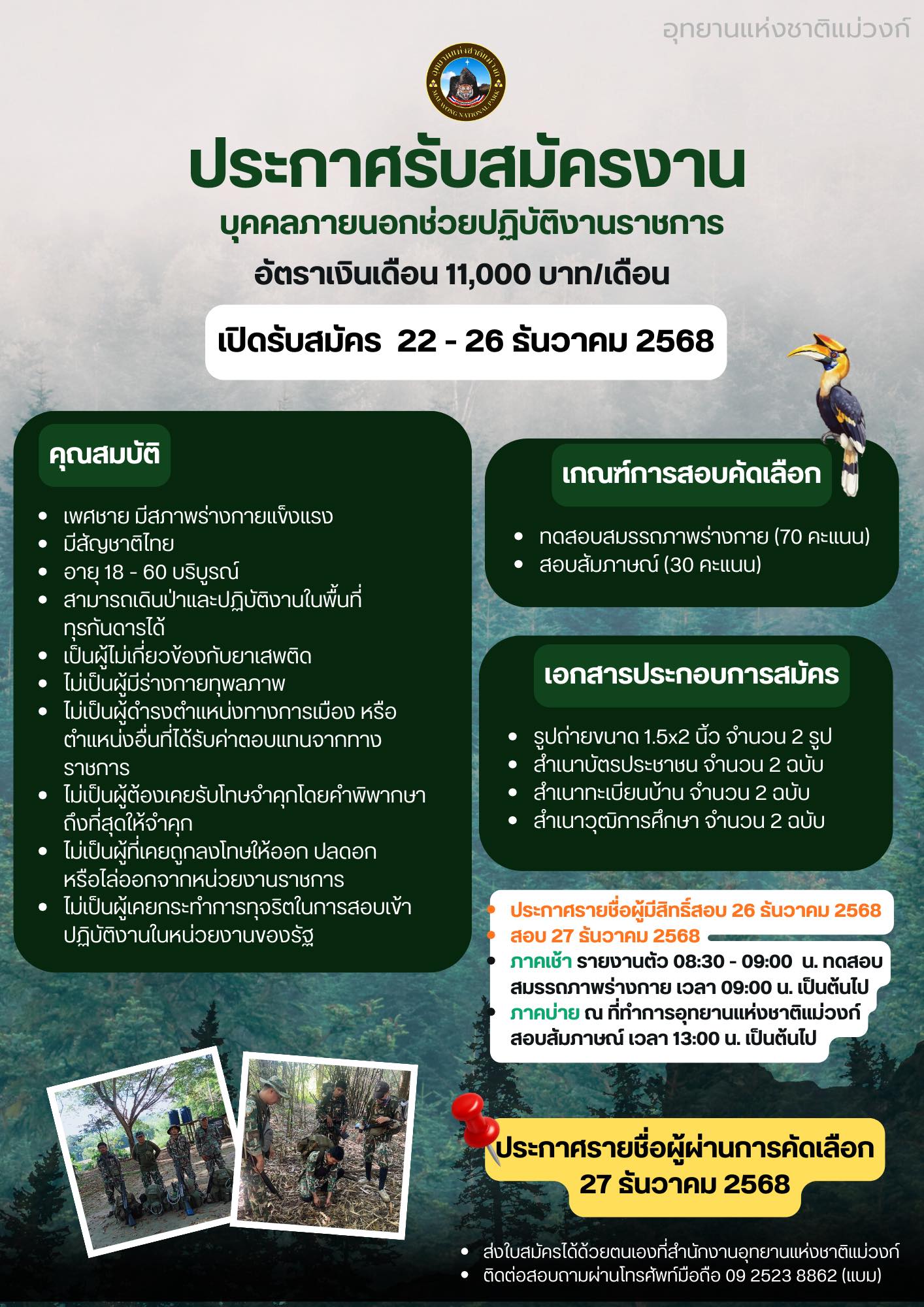 อุทยานแห่งชาติแม่วงก์ รับสมัคร บุคคลภายนอกช่วยปฏิบัติงานราชการ 1 อัตรา เงินเดือน 11,000 บา22-26 ธ.ค. 2568 แสดงความคิดเห็น : - กรุณาใช้คำพูดที่สุภาพและไม่ทำให้ผู้อื่นเสื่อมเสีย - ห้ามมิให้ผู้ใดโพดขายสินค้าเด็ดขาด - ข้อความโพสโดยสาธารณชน โปรดใช้วิจารณญาณในการอ่าน ที่เกี่ยวข้อง เทศบาลเมืองสมุทรสงคราม รับสมัครบุคคลทั่วไปเป็นพนักงาน 10 อัตรา เงินเดือน 9,000 - 11,500 บาท ตั้งแต่บัดนี้ - 22 ม.ค. 2569 15 ม.ค. 2569 เวลา 18:42 น. 574 กองทัพบก รับสมัครทหารกองเกินเข้ารับราชการทหารกองประจำการ (กรณีพิเศษ) ด้วยระบบออนไลน์ ตั้งแต่บัดนี้ถึง 25 ม.ค. 2569 29 ธ.ค. 2568 เวลา 08:53 น. 4,299 โรงพยาบาลธรรมศาสตร์เฉลิมพระเกียรติ รับสมัครบุคคลเป็นพนักงาน 3 อัตรา เงินเดือน 10,360 - 21,250 บาท ตั้งแต่วันที่ 15 - 29 ม.ค. 2569 14 ม.ค. 2569 เวลา 19:54 น. 1,379 สำนักงานเลขานุการกรม รับสมัคร ลูกจ้างชั่วคราวรายเดือน 3 อัตรา เงินเดือน 11,380- 18,150บาท ตั้งแต่วันที่ 9-28 ม.ค. 2569 13 ม.ค. 2569 เวลา 14:29 น. 342 ที่ทําการปกครองจังหวัดยโสธร รับสมัคร ลูกจ้างเหมาบริการ 1 อัตรา เงินเดือน 9,000 บาท ตั้งแต่วันที่ 14-16 ม.ค. 2569 12 ม.ค. 2569 เวลา 20:22 น. 353 โรงพยาบาลเกาะสมุย รับสมัครคัดเลือกลูกจ้างชั่วคราวเงินบํารุง (รายวัน) 14 อัตรา ตั้งแต่วันที่ 14 - 29 ม.ค. 2569 11 ม.ค. 2569 เวลา 21:27 น. 766 สํานักงานสาธารณสุขจังหวัดสมุทรปราการ รับสมัคร พนักงานราชการ 5 อัตรา เงินเดือน 13,660 - 27,540บาท ตั้งแต่วันที่ 8-24 ม.ค. 2569 30 ธ.ค. 2568 เวลา 10:04 น. 1,019 อุทยานแห่งชาติสันกาลาคีรี รับสมัครพนักงานจ้างเหมาบริการ 1 อัตรา เงินเดือน 12,000 บาท ตั้งแต่วันที่ 9 - 22 ม.ค. 2569 9 ม.ค. 2569 เวลา 18:31 น. 993 สำนักงานการตรวจเงินแผ่นดินภูมิภาคที่ 2 (จังหวัดชลบุรี) รับสมัครลูกจ้างชั่วคราว 2 อัตรา เงินเดือน 9,400 บาท ตั้งแต่วันที่ 5 - 23 ม.ค 2569 1 ม.ค. 2569 เวลา 11:52 น. 384 เทศบาลเมืองโนนสูง - น้ำคำ รับสมัครบุคคลเป็นพนักงานจ้าง 7 อัตรา เงินเดือน 9,000 บาท ตั้งแต่บัดนี้ - 23 ม.ค. 2569 14 ม.ค. 2569 เวลา 19:26 น. 692 สํานักงานบังคับคดีจังหวัดชลบุรี รับสมัครบุคคลเป็นลูกจ้างชั่วคราว 2 อัตรา เงินเดือน 11,380 - 18,150 บาท ตั้งแต่วันที่ 16 - 23 ม.ค. 2569 13 ม.ค. 2569 เวลา 20:46 น. 933 เทศบาลนครนครราชสีมา รับสมัคร พนักงานจ้างทั่วไป 74 อัตรา เงินเดือน 9,400 - 15,000 บาท ตั้งแต่วันที่ 6-16 ม.ค. 2569 20 ธ.ค. 2568 เวลา 20:53 น. 5,910