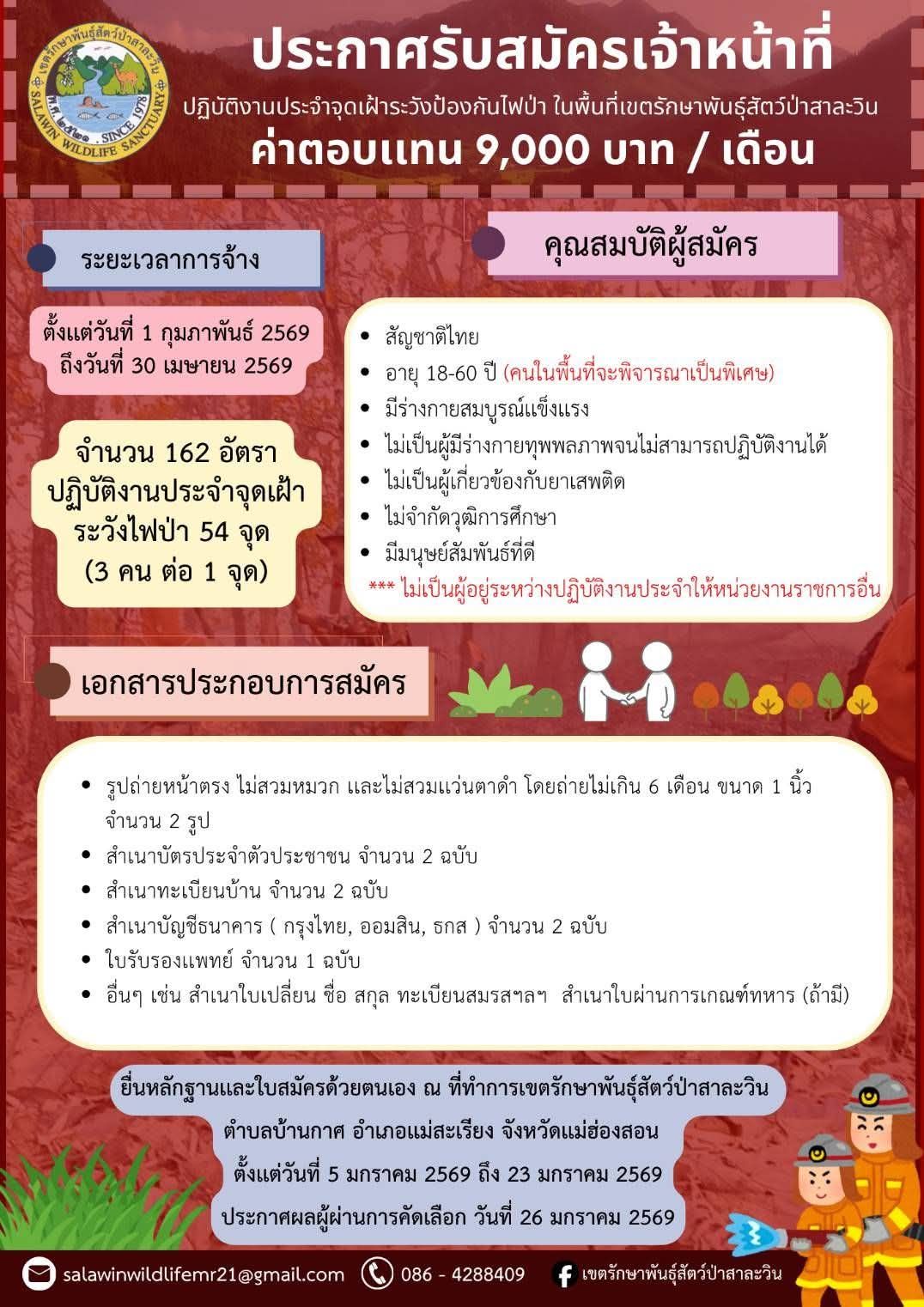 เขตรักษาพันธุ์สัตว์ป่าสาละวิน รับสมัคร เจ้าหน้าที่ปฏิบัติงาน ประจำจุดเฝ้าระวังไฟป่า 162 อัตรา เงินเดือน 9,000 บาท ตั้งแต่บัดนี้ถึง 23 ม.ค. 2569 แสดงความคิดเห็น : - กรุณาใช้คำพูดที่สุภาพและไม่ทำให้ผู้อื่นเสื่อมเสีย - ห้ามมิให้ผู้ใดโพดขายสินค้าเด็ดขาด - ข้อความโพสโดยสาธารณชน โปรดใช้วิจารณญาณในการอ่าน ที่เกี่ยวข้อง หน่วยบัญชาการนาวิกโยธิน รับสมัคร อาสาสมัครทหารพรานนาวิกโยธิน 83 อัตรา ในวันที่ 17 มกราคม 2569 28 ธ.ค. 2568 เวลา 12:28 น. 1,081 สํานักงานสาธารณสุขจังหวัดเชียงราย รับสมัครพนักงานกระทรวงสาธารณสุขทั่วไป 1 อัตรา เงินเดือน 15,000 บาท ตั้งแต่วันที่ 12-16 ม.ค. 2569 10 ม.ค. 2569 เวลา 20:52 น. 2,453 สํานักงานประจําศาลเยาวชนและครอบครัวจังหวัดชลบุรี รับสมัคร จ้างเหมาบริการรายบุคคล 1 อัตรา เงินเดือน 14,070 บาท ตั้งแต่วันที่ 23 ธ.ค. 2568 - 16 ม.ค. 2569 2 ม.ค. 2569 เวลา 12:43 น. 511 มหาวิทยาลัยขอนแก่น รับสมัครบุคคลเข้าปฏิบัติงานเป็นลูกจ้างมหาวิทยาลัย 1 อัตรา เงินเดือน 13,920 บาท ตั้งแต่บัดนี้ - 10 ก.พ. 2569 1 ม.ค. 2569 เวลา 18:02 น. 3,089 สํานักงานสาธารณสุขจังหวัดสมุทรปราการ รับสมัคร พนักงานราชการ 5 อัตรา เงินเดือน 13,660 - 27,540บาท ตั้งแต่วันที่ 8-24 ม.ค. 2569 30 ธ.ค. 2568 เวลา 10:04 น. 1,019 สํานักงานประกันสังคมจังหวัดขอนแก่น รับสมัคร จ้างงานผู้สูงอายุเข้าทํางาน 15 อัตรา เงินเดือน 9,900 บาท ตั้งแต่วันที่ 12-16 ม.ค.2568 15 ม.ค. 2569 เวลา 20:04 น. 80 ศุนย์บริการสาธารณสุง 28 กรุงธนบุรี รับสมัคร พนักงานช่วยงานด้านสาธารณสุข 1 อัตรา จ้างวันละ 550 บาท ตั้งแต่บัดนี้ถึง 19 ม.ค. 2569 6 ม.ค. 2569 เวลา 21:38 น. 333 สํานักงานสรรพากรพื้นที่สุรินทร์ รับสมัคร ลูกจ้างชั่วคราว 1 อัตรา เงินเดือน 18,150. บาท ตั้งแต่วันที่ 14-23 ม.ค. 2569 6 ม.ค. 2569 เวลา 21:50 น. 2,002 โรงพยาบาลตราด รับสมัครลูกจ้างชั่วคราว (รายวัน) 1 อัตรา ตั้งแต่บัดนี้ - 16 ม.ค. 2569 10 ม.ค. 2569 เวลา 20:29 น. 202 โรงพยาบาลสมเด็จพระยุพราชเชียงของ รับสมัคร นักจิตวิทยาคลินิก 1 อัตรา เงินเดือน 19,360 บาท ตั้งแต่วันที่ 8-ธ.ค. 2568 - 16 ม.ค. 2569 12 ธ.ค. 2568 เวลา 21:56 น. 216 โรงพยาบาลธรรมศาสตร์เฉลิมพระเกียรติ รับสมัครบุคคลเพื่อเป็นพนักงาน 3 อัตรา เงินเดือน 10,360 บาท ตั้งแต่บัดนี้ - 30 ก.ย. 2569 1 ธ.ค. 2568 เวลา 18:57 น. 1,260 ท่าอากาศยานร้อยเอ็ด รับสมัครพนักงานราชการทั่วไป 2 อัตรา เงินเดือน 16,700 บาท ตั้งแต่วันที่ 19 - 23 ม.ค. 2569 7 ม.ค. 2569 เวลา 09:39 น. 3,085