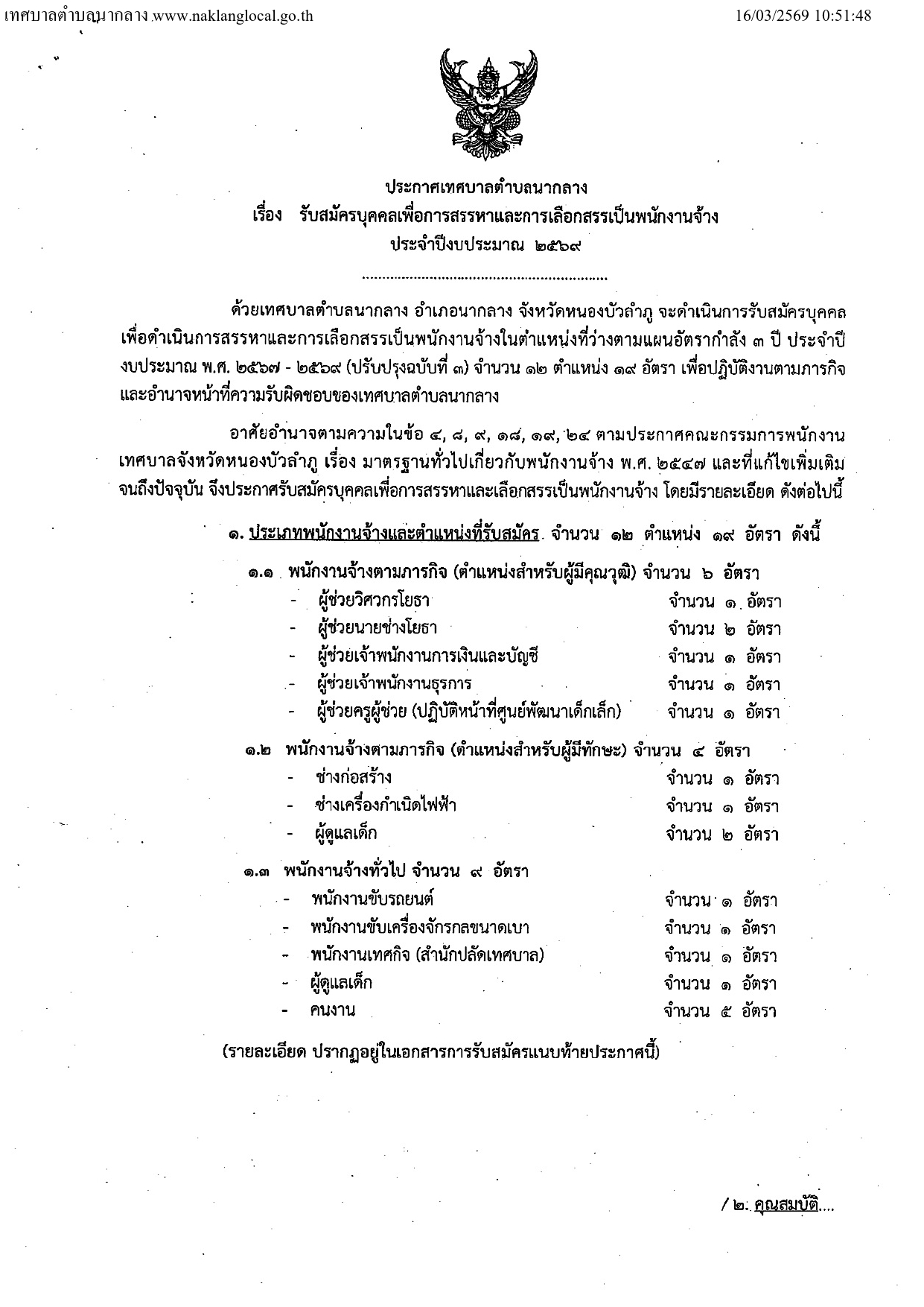 เทศบาลตําบลนากลาง รับสมัครพนักงานจ้าง 19 อัตรา ตั้งแต่วันที่ 23-31 มี.ค. 2569 แสดงความคิดเห็น : - กรุณาใช้คำพูดที่สุภาพและไม่ทำให้ผู้อื่นเสื่อมเสีย - ห้ามมิให้ผู้ใดโพดขายสินค้าเด็ดขาด - ข้อความโพสโดยสาธารณชน โปรดใช้วิจารณญาณในการอ่าน ที่เกี่ยวข้อง วิทยาลัยสารพัดช่างฉะเชิงเทรา รับสมัครลูกจ้างชั่วคราว 1 อัตรา เงินเดือน 9,800 บาท ตั้งแต่วันที่ 6-20 มี.ค. 2569 7 มี.ค. 2569 เวลา 11:50 น. 311 สํานักงานคุมประพฤติจังหวัดนครสวรรค์ รับสมัครลูกจ้างชั่วคราว 1 อัตรา เงินเดือน 18,150 บาท ตั้งแต่วันที่ 23 มี.ค. - 16 เม.ย. 2569 16 มี.ค. 2569 เวลา 15:21 น. 51 กรมทรัพย์สินทางปัญญา รับสมัครบุคคลเข้ารับราชการ 2 อัตรา เงินเดือน 13,420 - 15,320 บาท ตั้งแต่วันที่ 19 มี.ค. - 9 เม.ย. 2569 26 ก.พ. 2569 เวลา 18:41 น. 1,224 วิทยาลัยเทคนิคอุบลราชธานี รับสมัครพนักงานราชการทั่วไป 1 อัตรา เงินเดือน21,780 บาท ตั้งแต่วันที่ 16-20 มี.ค. 2569 12 มี.ค. 2569 เวลา 21:02 น. 2,318 สํานักงานคณะกรรมการป้องกันและปราบปรามยาเสพติด รับสมัครพนักงานราชการทั่วไป 6 อัตรา เงินเดือน 21,780 บาท ตั้งแต่วันที่ 2-20 มี.ค. 2569 17 ก.พ. 2569 เวลา 13:24 น. 22,668 โรงพยาบาลสมเด็จพระพุทธเลิศหล้า รับสมัครบุคคลเป็นลูกจ้างชั่วคราว 1 อัตรา ค่าจ้างวันละ 340 - 650 บาท ตั้งแต่บัดนี้ - 23 มี.ค. 2569 16 มี.ค. 2569 เวลา 15:33 น. 136 คณะศึกษาศาสตร์ มหาวิทยาลัยอุบลราชธานี รับสมัครพนักงานมหาวิทยาลัย 1 อัตรา เงินเดือน 33,600 บาท ตั้งแต่วันที่ 26 ก.พ. - 18 มี.ค. 2569 20 ก.พ. 2569 เวลา 20:21 น. 5,739 โรงพยาบาลค่ายสรรพสิทธิประสงค์ รับสมัครนักวิชาการสาธารณสุข 1 อัตรา ตั้งแต่วันที่ 20 ก.พ. - 17 มี.ค. 2569 26 ก.พ. 2569 เวลา 21:18 น. 2,516 โรงเรียนมวกเหล็กวิทยา รับสมัครเจ้าหน้าที่ห้องพยาบาล 1 อัตรา เงินเดือน 9,000บาท ตั้งแต่วันที่ 12-19 มี.ค. 2569 11 มี.ค. 2569 เวลา 21:51 น. 249 โรงพยาบาลเชียงแสน รับสมัครลูกจ้างชั่วคราว (รายเดือน) 7 อัตรา เงินเดือน 7,260 - 12,350 บาท ตั้งแต่วันที่ 4-17 มี.ค. 2569 5 มี.ค. 2569 เวลา 14:03 น. 300 สถาบันการอาชีวศึกษาเกษตรภาคกลาง รับสมัครพนักงานราชการทั่วไป 1 อัตรา เงินเดือน 21,780 บาท ตั้งแต่วันที่ 12-18 มี.ค. 2569 12 มี.ค. 2569 เวลา 20:59 น. 855 มหาวิทยาลัยเกษตรศาสตร์ รับสมัครบุคคลเข้าเป็นพนักงานมหาวิทยาลัย 3 อัตรา เงินเดือน 15,000 - 17,500 บาท ตั้งแต่บัดนี้ - 21 มี.ค. 2569 7 มี.ค. 2569 เวลา 17:13 น. 2,715