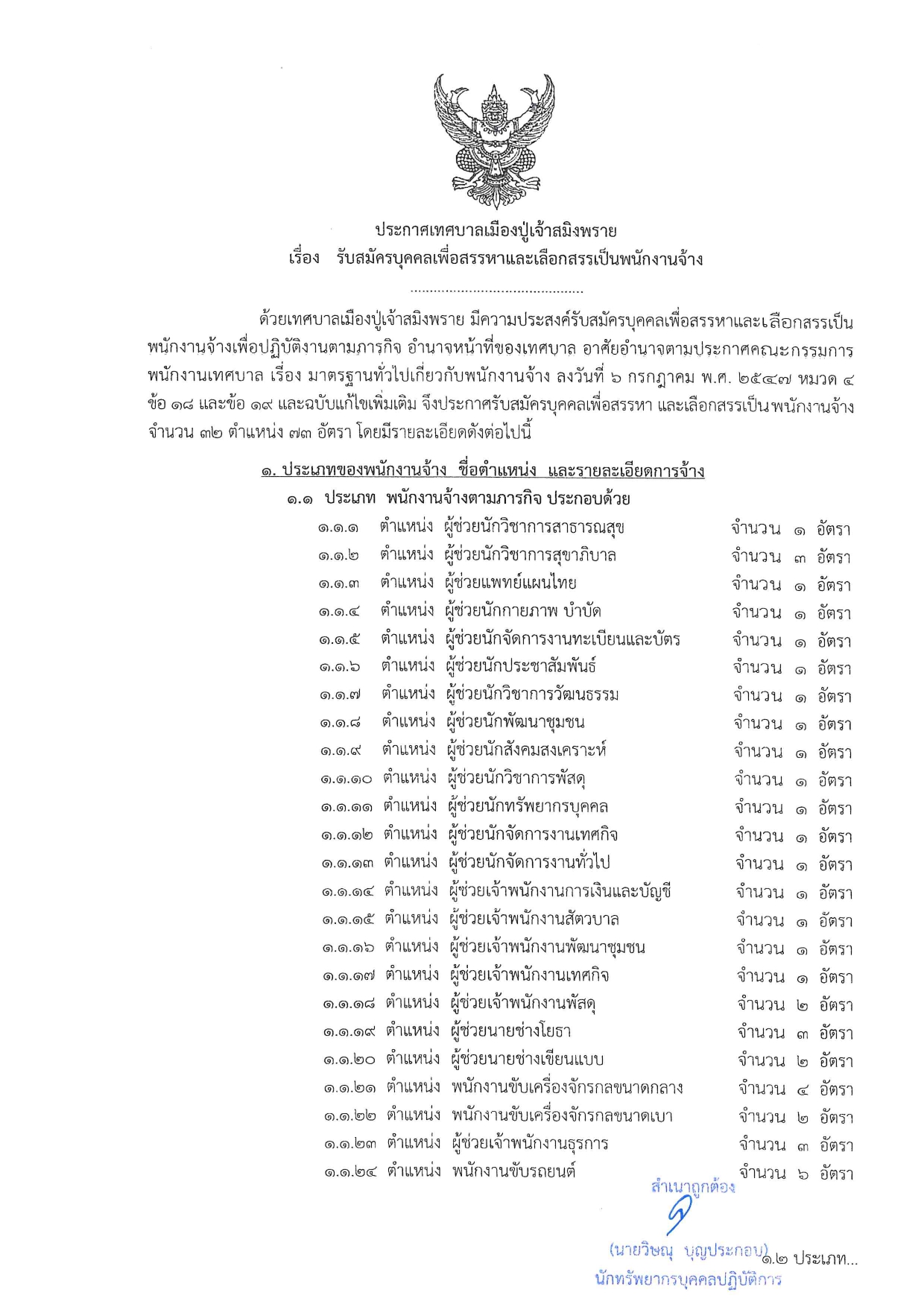 เทศบาลเมืองปู่เจ้าสมิงพราย รับสมัคร พนักงานจ้าง รวม 73 อัตรา เงินเดือน 9,000 - 15,000 บาท ตั้งแต่วันที่ 16-24 เม.ย. 2569 ที่เกี่ยวข้อง สำนักงานพัฒนาชุมชนจังหวัดชลบุรี รับสมัครอาสาพัฒนา 1 อัตรา เงินเดือน 15,000 บาท ตั้งแต่วันที่ 9-24 เม.ย. 2569 14 เม.ย. 2569 เวลา 22:22 น. 1,179 โรงเรียนศรีแก้วพิทยา รับสมัคร ครูอัตราจ้าง 1 อัตรา เงินเดือน 12,000 บาท ตั้งแต่วันที่ 1-30 เม.ย. 2569 2 เม.ย. 2569 เวลา 15:46 น. 3,519 โรงพยาบาลบางบัวทอง รับสมัครลูกจ้างชั่วคราว (รายวัน) 4 อัตรา จ้างวันละ 410 - 690 บาท ตั้งแต่วันที่ 2-22 เม.ย. 2569 7 เม.ย. 2569 เวลา 11:43 น. 776 โรงเรียนปากพูน รับสมัครครูอัตราจ้าง 1 อัตรา เงินเดือน 9,000บาท ตั้งแต่วันที่ 16-22 เม.ย. 2569 12 เม.ย. 2569 เวลา 23:11 น. 418 กองการพัสดุภาครัฐ กรมบัญชีกลาง รับสมัคร ลูกจ้างชั่วคราวรายเดือน 9 อัตรา เงินเดือน 18,150 บาท ตั้งแต่วันที่ 1-24 เม.ย. 2569 6 เม.ย. 2569 เวลา 22:18 น. 2,564 กรมควบคุมมลสํานักงานสิ่งแวดล้อมและควบคุมมลพิษที่ 15 รับสมัครพนักงานจ้างเหมาบริการ 1 อัตรา เงินเดือน 15,000 บาท ตั้งแต่บัดนี้ถึง 30 เม.ย.2569 16 มี.ค. 2569 เวลา 21:12 น. 1,945 โรงเรียนอัสสัมชัญอุบลราชธานี รับสมัครบุคลากร 5 อัตรา เงินเดือน 15,000 บาท ตั้งแต่บัดนี้เป็นต้นไป 9 เม.ย. 2569 เวลา 12:56 น. 4,644 วิทยาลัยเกษตรและเทคโนโลยีชลบุรี รับสมัครลูกจ้างชั่วคราว 2 อัตรา เงินเดือน 8,690 - 9,300 บาท ตั้งแต่วันที่ 30 มี.ค. - 24 เม.ย. 2569 30 มี.ค. 2569 เวลา 22:30 น. 499 โรงพยาบาลร้อยเอ็ด รับสมัครลูกจ้างชั่วคราว (รายวัน) 7 อัตรา จ้างวันละ 440 - 1,000 บาท ตั้งแต่วันที่ 9-20 เม.ย.2569 3 เม.ย. 2569 เวลา 15:55 น. 5,313 กรมปศุสัตว์ รับสมัครพนักงานราชการทั่วไป 3 อัตรา เงินเดือน 28,360 บาท ตั้งแต่วันที่ 16 เม.ย. - 8พ.ค. 2569 18 เม.ย. 2569 เวลา 13:11 น. 132 ศูนย์บริการสาธารณสุขเทศบาลนครนนทบุรีที่ 5 ทรายทอง รับสมัครพนักงาน 2 อัตรา เงินเดือน 15,200 - 18,500 บาท ตั้งแต่วันที่ 10 เม.ย. - 15 พ.ค. 2569 9 เม.ย. 2569 เวลา 11:37 น. 1,603 โรงเรียนตากพิทยาคม รับสมัครลูกจ้างชั่วคราว 1 อัตรา เงินเดือน 15,000 บาท ตั้งแต่บัดนี้ - 29 เม.ย. 2569 4 เม.ย. 2569 เวลา 17:43 น. 2,234