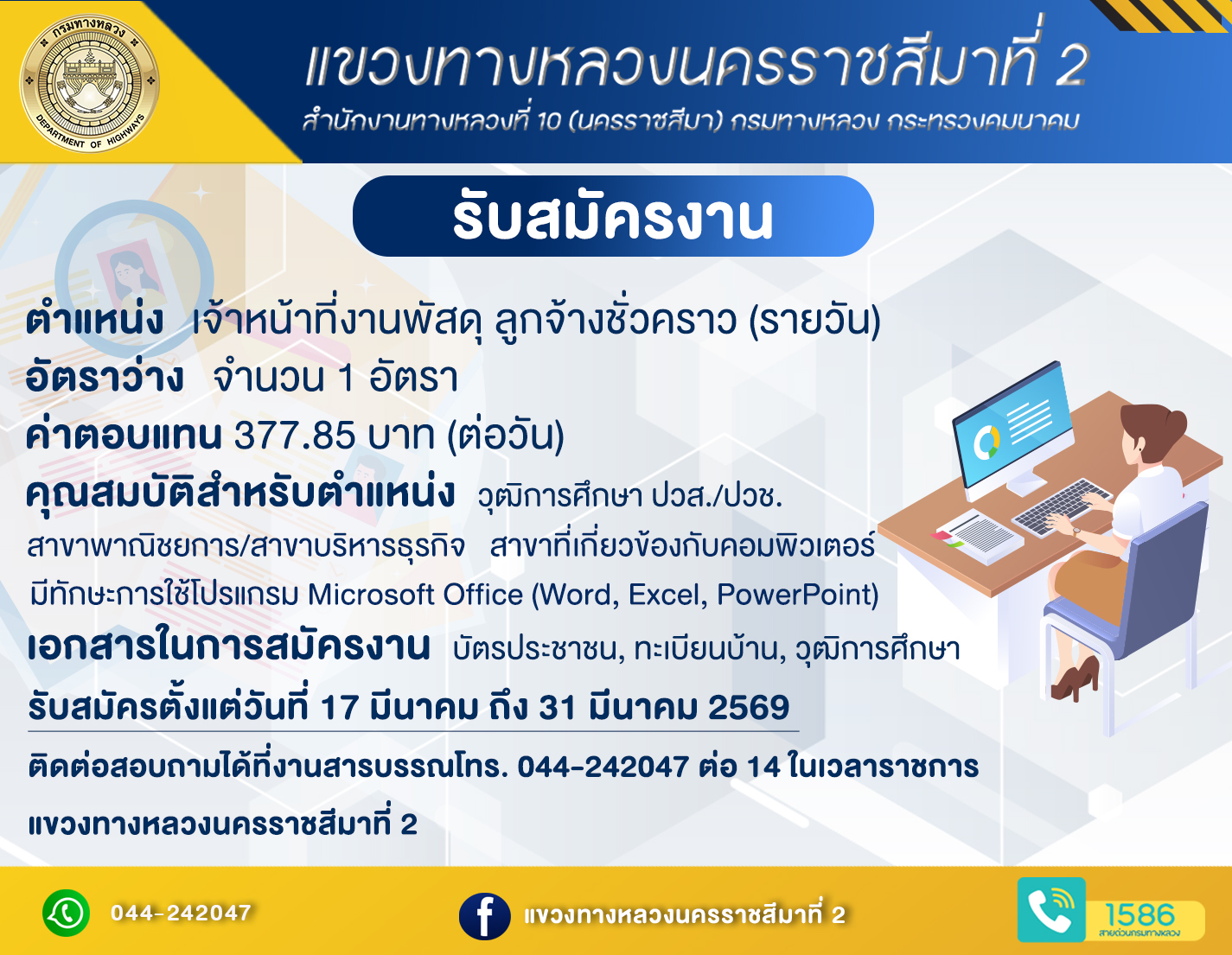แขวงทางหลวงนครราชสีมาที่ 2 รับสมัครลูกจ้างชั่วคราว 1 อัตรา จ้างวันละ 377.85 บาท ตั้งแต่วันที่ 17-31 มี.ค. 2569 แสดงความคิดเห็น : - กรุณาใช้คำพูดที่สุภาพและไม่ทำให้ผู้อื่นเสื่อมเสีย - ห้ามมิให้ผู้ใดโพดขายสินค้าเด็ดขาด - ข้อความโพสโดยสาธารณชน โปรดใช้วิจารณญาณในการอ่าน ที่เกี่ยวข้อง สํานักงานสาธารณสุขอําเภอม่วงสามสิบ รับสมัครพนักงานกระทรวงสาธารณสุขทั่วไป 3 อัตรา เงินเดือน 18,000 บาท ตั้งแต่วันที่ 11-27 มี.ค. 2569 7 มี.ค. 2569 เวลา 12:05 น. 764 โรงพยาบาลพยุห์ รับสมัครลูกจ้างชั่วคราว 2 อัตรา จ้างวันละ 330 บาท ตั้งแต่วันที่ 20 -31มี.ค. 2569 16 มี.ค. 2569 เวลา 22:40 น. 13 กรมควบคุมมลสํานักงานสิ่งแวดล้อมและควบคุมมลพิษที่ 15 รับสมัครพนักงานจ้างเหมาบริการ 1 อัตรา เงินเดือน 15,000 บาท ตั้งแต่บัดนี้ถึง 30 เม.ย.2569 16 มี.ค. 2569 เวลา 21:12 น. 26 ส่งเสริมและสนับสนุนวิชาการ 5 รับสมัครพนักงานจ้างเหมาบริการ 1 อัตรา เงินเดือน 9,000 บาท ตั้งแต่วันที่ 16-20 มี.ค. 2569 16 มี.ค. 2569 เวลา 15:46 น. 97 โรงเรียนสายน้ำทิพย์ รับสมัครบุคคลเป็นครูอัตราจ้าง 1 อัตรา เงินเดือน 15,000 บาท ตั้งแต่บัดนี้ - 10 เม.ย. 2569 14 มี.ค. 2569 เวลา 17:27 น. 1,334 สํานักข่าวกรองแห่งชาติ รับสมัครบุคคลเข้ารับราชการ 210 อัตรา เงินเดือน 13,920 - 19,970 บาท ตั้งแต่วันที่ 16 มี.ค. - 6 เม.ย. 2569 2 มี.ค. 2569 เวลา 21:44 น. 5,124 วิทยาลัยอาชีวศึกษาปัตตานี รับสมัครพนักงานราชการทั่วไป 2 อัตรา เงินเดือน 21,780 บาท ตั้งแต่วันที่ 23-27 มี.ค. 2569 16 มี.ค. 2569 เวลา 15:12 น. 111 โรงพยาบาลเพชรบูรณ์ รับสมัครลูกจ้างชั่วคราวเงินบำรุง (รายวัน) 4 อัตรา ค่าจ้างวันละ 315 - 324 ตั้งแต่วันที่ 16 - 24 มี.ค. 2569 16 มี.ค. 2569 เวลา 13:30 น. 492 ทัณฑสถานหญิงนครราชสีมา รับสมัครบุคคลเป็นลูกจ้างชั่วคราว 1 อัตรา เงินเดือน 9,400 บาท ตั้งแต่วันที่ 16 - 20 มี.ค. 2569 13 มี.ค. 2569 เวลา 19:57 น. 953 วิทยาลัยเทคนิคกาญจนาภิเษก ปัตตานี รับสมัครพนักงานราชการทั่วไป 1 อัตรา เงินเดือน 21,780 บาท ตั้งแต่วันที่ 16 - 20 มี.ค. 2569 28 ก.พ. 2569 เวลา 16:12 น. 3,023 มหาวิทยาลัยธรรมศาสตร์ รับสมัครวิศวกรไฟฟ้าปฏิบัติการ 1 อัตรา เงินเดือน 21,250 บาท ตั้งแต่วันที่ 2-23 มี.ค. 2569 24 ก.พ. 2569 เวลา 21:54 น. 1,101 วิทยาลัยสารพัดช่างพัทลุง รับสมัครพนักงานราชการทั่วไป 1 อัตรา เงินเดือน 21,780 บาท ตั้งแต่วันที่ 11-17 มี.ค. 2569 1 มี.ค. 2569 เวลา 13:01 น. 3,872