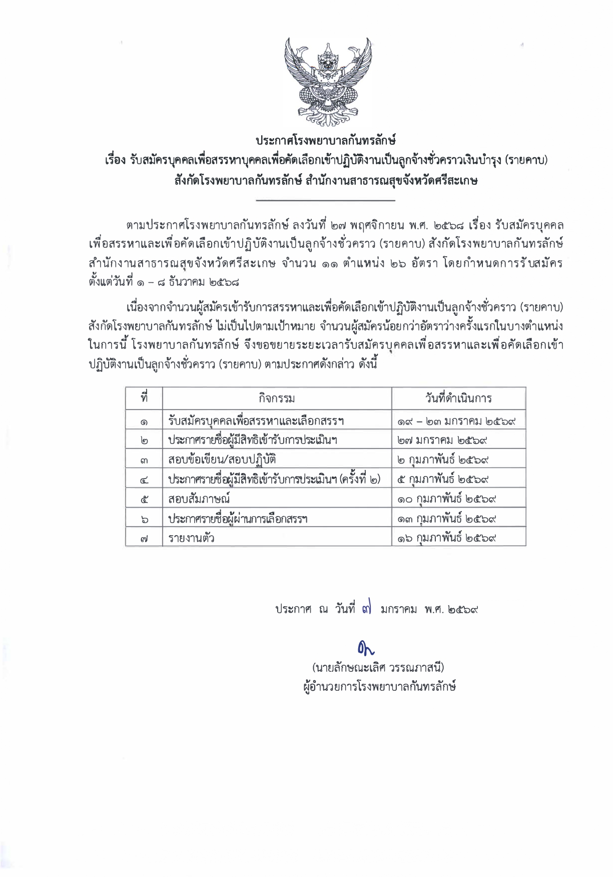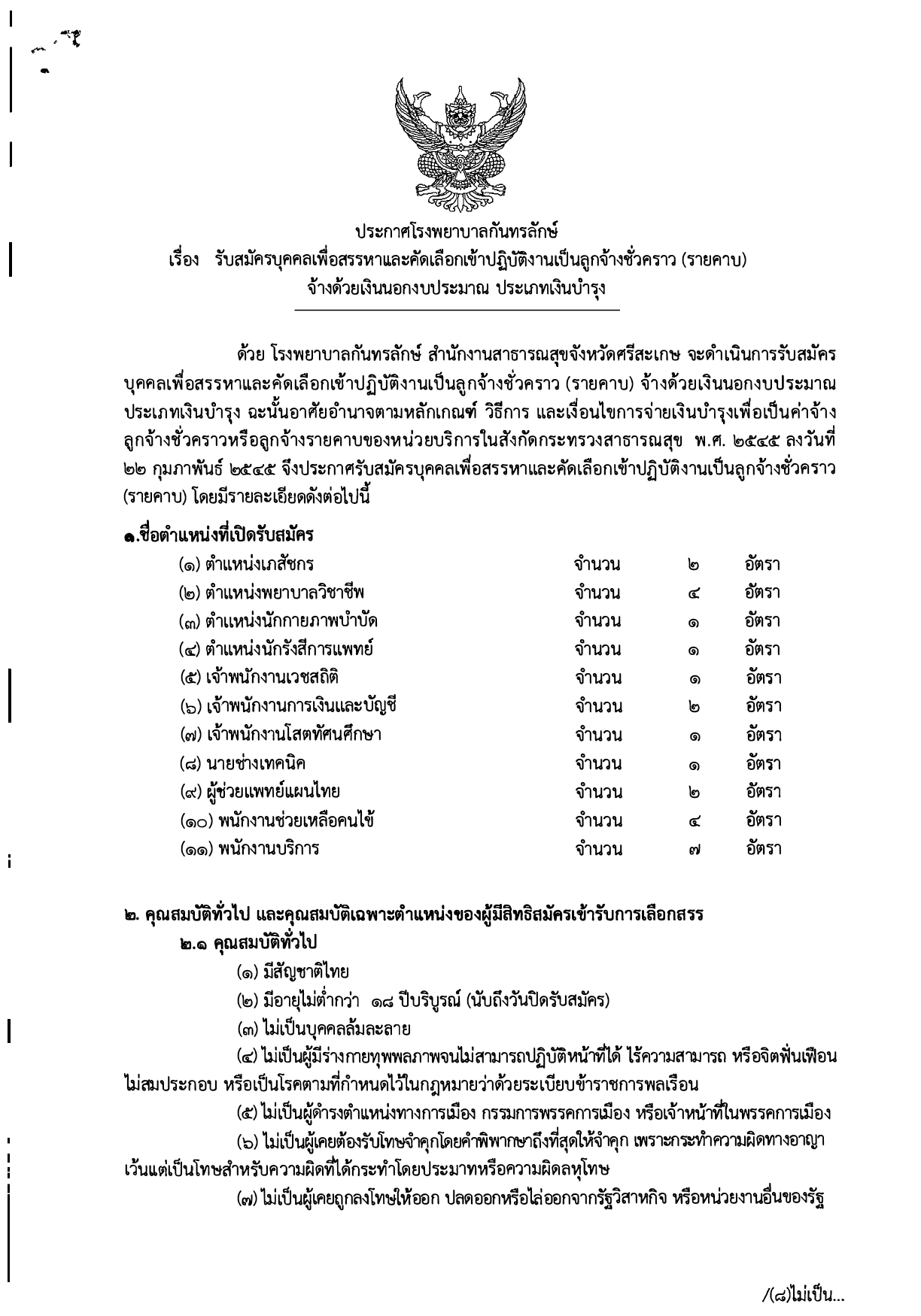โรงพยาบาลกันทรลักษ์ รับสมัคร ลูกจ้างชั่วคราว (รายคาบ) 26 อัตรา อัตราจ้าง 360 - 1,200 บาท/คาบ ตั้งแต่วันที่ 19-23 ม.ค. 2569 แสดงความคิดเห็น : - กรุณาใช้คำพูดที่สุภาพและไม่ทำให้ผู้อื่นเสื่อมเสีย - ห้ามมิให้ผู้ใดโพดขายสินค้าเด็ดขาด - ข้อความโพสโดยสาธารณชน โปรดใช้วิจารณญาณในการอ่าน ที่เกี่ยวข้อง สถานสงเคราะห์เด็กอ่อนพญาไท รับสมัคร ลูกจ้างเหมาบริการ 1 อัตรา เงินเดือน 10,000 บาท ตั้งแต่วันที่ 5-19 ม.ค. 2569 6 ม.ค. 2569 เวลา 21:31 น. 178 โรงเรียนสาธิตมหาวิทยาลัยราชภัฏจันทรเกษม รับสมัครบุคคลเข้ารับราชการเป็นลูกจ้าง 2 อัตรา เงินเดือน 15,000 บาท ตั้งแต่บัดนี้ - 25 ม.ค. 2569 15 ม.ค. 2569 เวลา 19:46 น. 574 กองสุขาภิบาลอาหาร รับสมัคร พนักงานช่วยงานด้านธุรการ 2 อัตรา จ้างวันละ 825 บาท ตั้งแต่วันที่ 6-20 ม.ค. 2569 7 ม.ค. 2569 เวลา 21:36 น. 570 สหกรณ์บริการมหาวิทยาลัยสงขลานครินทร์ จํากัด รับสมัครบุคคลเพื่อเป็นเจ้าหน้าที่สหกรณ์ 1 อัตรา เงินเดือน 15,000 - 18,000 บาท ตั้งแต่วันที่ 5 - 31 ม.ค. 2569 1 ม.ค. 2569 เวลา 18:14 น. 2,576 ศุนย์บริการสาธารณสุง 28 กรุงธนบุรี รับสมัคร พนักงานช่วยงานด้านสาธารณสุข 1 อัตรา จ้างวันละ 550 บาท ตั้งแต่บัดนี้ถึง 19 ม.ค. 2569 6 ม.ค. 2569 เวลา 21:38 น. 332 สํานักงานเศรษฐกิจการเกษตร รับสมัครพนักงานราชการทั่วไป 6 อัตรา เงินเดือน 21,780 บาท ตั้งแต่วันที่ 10-27 ม.ค. 2569 12 ม.ค. 2569 เวลา 20:29 น. 889 สํานักงานจังหวัดเลย รับสมัครพนักงานราชการ 1 อัตรา เงินเดือน 21,780 บาท ตั้งแต่วันที่ 12-16 ม.ค. 2569 25 ธ.ค. 2568 เวลา 20:19 น. 4,833 สำนักงานเลขานุการกรม รับสมัคร ลูกจ้างชั่วคราวรายเดือน 3 อัตรา เงินเดือน 11,380- 18,150บาท ตั้งแต่วันที่ 9-28 ม.ค. 2569 13 ม.ค. 2569 เวลา 14:29 น. 332 สำนักงานการตรวจเงินแผ่นดิน (สตง.) รับสมัครบุคคลเป็นลูกจ้างสมทบ 15 อัตรา เงินเดือน 9,400 - 15,000 บาท ตั้งแต่วันที่ 25 ธ.ค. - 19 ม.ค. 2569 20 ธ.ค. 2568 เวลา 10:08 น. 1,558 คณะสัตวแพทยศาสตร์ มหาวิทยาลัยเชียงใหม่ รับสมัครพนักงานมหาวิทยาลัย 1 อัตรา เงินเดือน 15,530 บาท ตั้งแต่บัดนี้ - 20 ม.ค. 2569 23 ธ.ค. 2568 เวลา 19:08 น. 1,588 มหาวิทยาลัยมหาสารคาม รับสมัคร ลูกจ้างชั่วคราว 21 อัตรา เงินเดือน 9,560 - 17,380 บาท ตั้งแต่บัดนี้ถึง 30 ม.ค. 2569 12 ม.ค. 2569 เวลา 21:20 น. 877 ท่าอากาศยานสกลนคร รับสมัครบุคคลเป็นพนักงานราชการทั่วไป 3 อัตรา เงินเดือน 16,700 บาท ตั้งแต่วันที่ 22 ม.ค. - 5 ก.พ. 2569 14 ม.ค. 2569 เวลา 19:33 น. 910