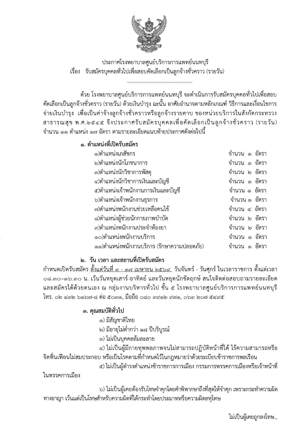 โรงพยาบาลศูนย์บริการการแพทย์นนทบุรี รับสมัครลูกจ้างชั่วคราว (รายวัน) 17 อัตรา จ้างวันละ 400 -790 บาท ตั้งแต่วันที่ 3-17 เม.ย. 2569 ที่เกี่ยวข้อง แขวงทางหลวงชนบทสุโขทัย รับสมัครลูกจ้างชั่วคราวรายเดือน 1 อัตรา เงินเดือน 11,500 บาท ตั้งแต่บัดนี้ - 20 เม.ย. 2569 13 เม.ย. 2569 เวลา 16:21 น. 943 คณะรัฐศาสตร์ มหาวิทยาลัยธรรมศาสตร์ รับสมัครพนักงานมหาวิทยาลัย 1 อัตรา เงินเดือน 21,250 บาท ตั้งแต่บัดนี้ - 30 เม.ย. 2569 11 เม.ย. 2569 เวลา 19:15 น. 1,316 ธนาคารอาคารสงเคราะห์ รับสมัครบุคคลบรรจุเพื่อเป็นพนักงาน 1 อัตรา ตั้งแต่บัดนี้ - 22 เม.ย. 2569 4 เม.ย. 2569 เวลา 17:33 น. 2,791 คณะทันตแพทยศาสตร์ มหาวิทยาลัยศรีนครินทรวิโรฒ รับสมัครพนักงานมหาวิทยาลัย 1 อัตรา เงินเดือน 20,250 บาท ตั้งแต่บัดนี้ - 30 เม.ย. 2569 2 เม.ย. 2569 เวลา 19:34 น. 2,288 ก.บ.ม. มหาวิทยาลัยเทคโนโลยีพระจอมเกล้าพระนครเหนือ รับสมัครพนักงานพิเศษ 1 อัตรา เงินเดือน 16,900 บาท ตั้งแต่วันที่ 20 มี.ค. - 20 เม.ย.2569 25 มี.ค. 2569 เวลา 14:35 น. 1,297 โรงเรียนสอาดเผดิมวิทยา จังหวัดชุมพร รับสมัครครูอัตราจ้าง 1 อัตรา เงินเดือน 15,000 บาท ตั้งแต่่วันที่ 2 - 27 เม.ย. 2569 8 เม.ย. 2569 เวลา 21:56 น. 3,698 วิทยาลัยเกษตรและเทคโนโลยีกาญจนบุรี รับสมัครบุคคลเป็นพนักงานราชการทั่วไป 1 อัตรา เงินเดือน 21,780 บาท ตั้งแต่วันที่ 20 - 24 เม.ย. 2569 9 เม.ย. 2569 เวลา 19:14 น. 2,419 โรงพยาบาลบางบัวทอง รับสมัครลูกจ้างชั่วคราว (รายวัน) 4 อัตรา จ้างวันละ 410 - 690 บาท ตั้งแต่วันที่ 2-22 เม.ย. 2569 7 เม.ย. 2569 เวลา 11:43 น. 770 มหาวิทยาลัยราชภัฏยะลา รับสมัครพนักงานมหาวิทยาลัย 1 อัตรา เงินเดือน 28,880 - 34, 650 บาท ตั้งแต่บัดนี้ - 25 เม.ย. 2569 15 เม.ย. 2569 เวลา 20:27 น. 1,435 วิทยาลัยพยาบาลตำรวจ รับสมัครบุคคลภายนอกเข้าศึกษาในหลักสูตรพยาบาลศาสตรบัณฑิต 56 อัตรา ตั้งแต่บัดนี้ - 20 เม.ย. 2569 20 ม.ค. 2569 เวลา 18:54 น. 2,314 โรงเรียนลาดยาววิทยาคม รับสมัครลูกจ้างชั่วคราว 1 อัตรา เงินเดือน 12,000 บาท ตั้งเเต่บัดนี้-24 เม.ย. 2569 17 เม.ย. 2569 เวลา 16:42 น. 717 เทศบาลเมืองมะขามคู่ รับสมัครกรณีที่มีเหตุพิเศษที่ไม่จําเป็นต้องสอบแข่งขัน 3 อัตรา เงินเดือน 18,200 บาท ตั้งแต่วันที่ 23-29 เม.ย. 2569 7 เม.ย. 2569 เวลา 22:26 น. 1,908