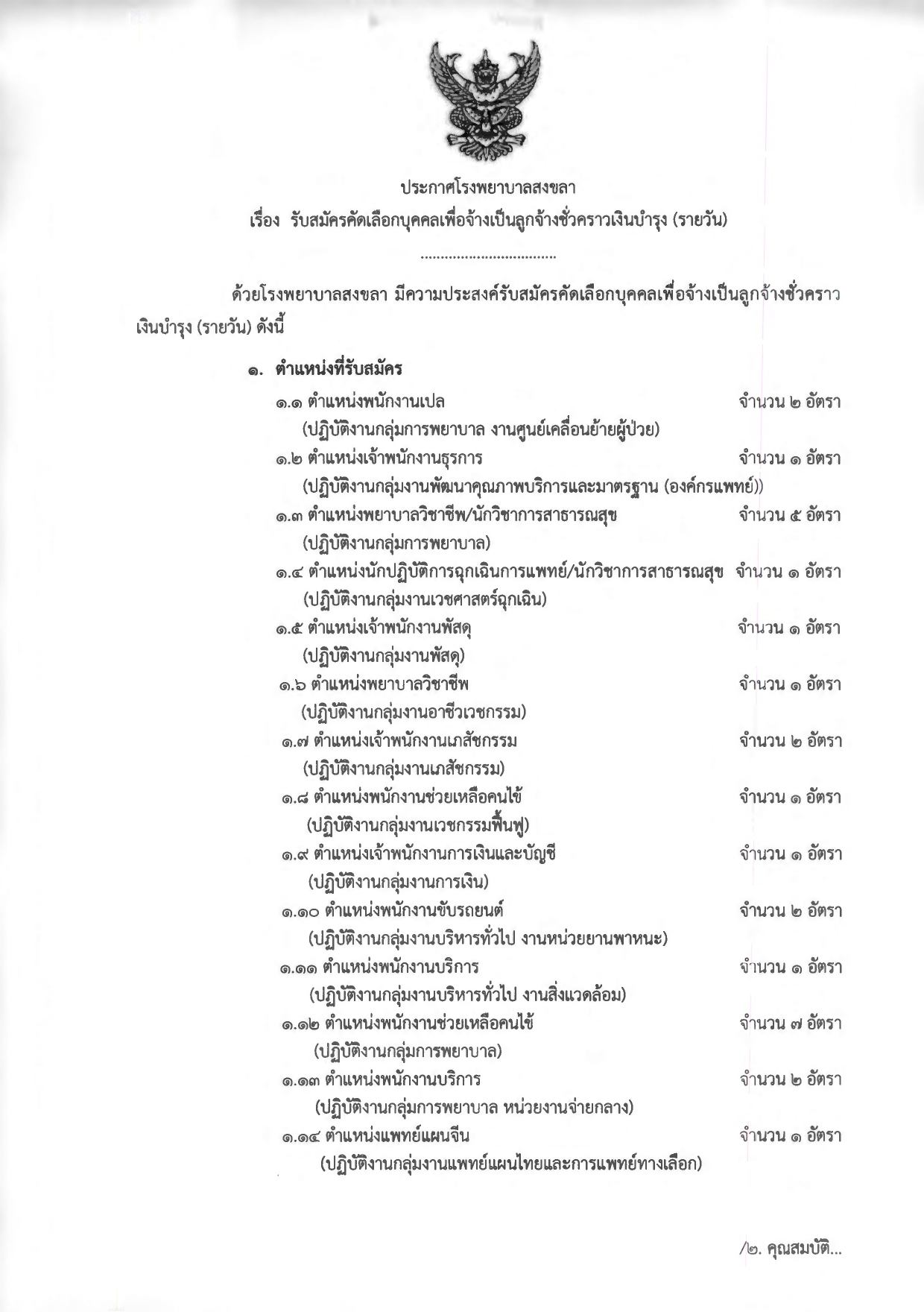 โรงพยาบาลสงขลา รับสมัคร ลูกจ้างชั่วคราวเงินบำรุง (รายวัน) 29 อัตรา จ้างวันละ 370 - 750 บาท ตั้งแต่วันที่ 27 เม.ย. - 1 พ.ค. 2569 ที่เกี่ยวข้อง สำนักงานสาธารณสุขจังหวัดบุรีรัมย์ รับสมัครบุคคลเข้ารับราชการ 5 อัตรา เงินเดือน 13,130-19,970 บาท ตั้งแต่วันที่ 27 เม.ย. - 1 พ.ค. 2569 23 เม.ย. 2569 เวลา 20:25 น. 2,234 สํานักงาน ป.ป.ช. รับสมัครบรรจุเป็นข้าราชการ 227 อัตรา เงินเดือน 18,950 บาท ตั้งแต่วันที่ 10 เม.ย. - 9 พ.ค. 2569 1 เม.ย. 2569 เวลา 18:22 น. 57,387 โรงเรียนเทศบาล 4 สันป่าก่อ รับสมัครพนักงานจ้าง 1 อัตรา เงินเดือน 7,500 บาท ตั้งแต่วันที่ 1-29 เม.ย. 2569 3 เม.ย. 2569 เวลา 21:28 น. 757 คณะเภสัชศาสตร์ มหาวิทยาลัยสงขลานครินทร์ รับสมัครพนักงานเงินรายได้จำนวน 1 ตำแหน่ง เงินเดือน 15,000 บาท ตั้งแต่บัดนี้ถึง 30 เม.ย. 2569 12 เม.ย. 2569 เวลา 13:27 น. 1,362 ศูนย์บริการสาธารณสุข 3 บางซื่อ รับสมัครบุคคลภายนอกช่วยปฏิบัติราชการ 9 อัตรา จ้างวันละ 682 -1,200 บาท ตั้งแต่วันที่ 20 เม.ย. - 8 พ.ค. 2569 13 เม.ย. 2569 เวลา 23:08 น. 1,790 โรงพยาบาลเวชชารักษ์ ลําปาง รับสมัครพนักงานกระทรวงสาธารณสุขทั่วไป 2 อัตรา เงินเดือน 18,000 บาท ตั้งแต่บัดนี้ถึง 8 พ.ค. 2569 2 เม.ย. 2569 เวลา 15:32 น. 1,783 คณะเภสัชศาสตร์ มหาวิทยาลัยพะเยา รับสมัครบรรจุพนักงานมหาวิทยาลัย 1 อัตรา เงินเดือน 27,020 - 36,230 บาท ตั้งแต่บัดนี้ - 7 พ.ค. 2569 15 เม.ย. 2569 เวลา 19:17 น. 1,252 เทศบาลตาบลนาเยีย รับสมัครพนักงานจ้าง 3 อัตรา เงินเดือน 9,000 - 15,000 บาท ตั้งแต่วันที่ 17-28 เม.ย. 2569 7 เม.ย. 2569 เวลา 22:59 น. 1,365 ศูนย์อนามัยที่ 1 เชียงใหม่ รับสมัคร พนักงานราชการทั่วไป 1 อัตรา เงินเดือน 21,780 บาท ตั้งแต่วันที่ 16-27 เม.ย. 2569 13 เม.ย. 2569 เวลา 22:39 น. 8,630 สำนักงานพัฒนาสังคมและความมั่นคงของมนุษย์จังหวัดตราด รับสมัคร จ้างเหมาบุคคลภายนอก 1 อัตรา เงินเดือน 15,000 บาท ตั้งแต่วันที่ 20-30 เม.ย. 2569 26 เม.ย. 2569 เวลา 10:39 น. 49 วิทยาลัยบูรณาการศาสตร์ มหาวิทยาลัยเกษตรศาสตร์ รับสมัครบุคคลเข้าเป็นพนักงาน 1 อัตรา เงินเดือน 21,000 บาท ตั้งแต่วันที่ 20 เม.ย. - 22 พ.ค. 2569 18 เม.ย. 2569 เวลา 18:55 น. 3,507 โรงพยาบาลจุฬาลงกรณ์ ขยายเวลารับสมัครงานตำแหน่ง เจ้าหน้าที่สถิติ 1 อัตรา ตั้งแต่บัดนี้ - 1 พ.ค. 2569 18 เม.ย. 2569 เวลา 17:36 น. 5,104