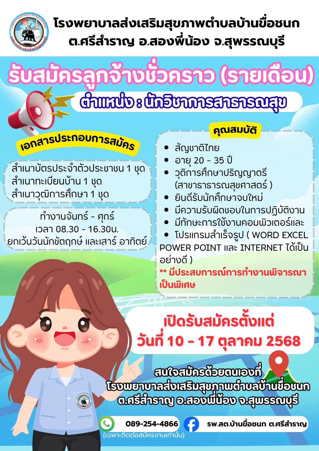 โรงพยาบาลส่งเสริมสุขภาพตําบลบ้านชื่อชนก รับสมัคร ลูกจ้างชั่วคราว ตั้งแต่วันที่ 10-17 ต.ค. 2568 ไฟล์แนป ::: ประกาศรับสมัครสอบ อ้างอิง ::: Tag : นักวิชาการสาธารณสุข แสดงความคิดเห็น : - กรุณาใช้คำพูดที่สุภาพและไม่ทำให้ผู้อื่นเสื่อมเสีย - ห้ามมิให้ผู้ใดโพดขายสินค้าเด็ดขาด - ข้อความโพสโดยสาธารณชน โปรดใช้วิจารณญาณในการอ่าน ที่เกี่ยวข้อง เทศบาลเมืองพะเยา รับสมัครบุคลากรเป็นลูกจ้างชั่วคราว 5 อัตรา เงินเดือน 13,500 - 18,000 บาท ตั้งแต่บัดนี้ - 7 พ.ย. 2568 3 พ.ย. 2568 เวลา 09:00 น. 636 ด่านกักกันสัตว์เพชรบุรี รับสมัครพนักงานราชการทั่วไป 1 อัตรา เงินเดือน 12,630 บาท ตั้งแต่วันที่ 3 - 12 พ.ย. 2568 15 ต.ค. 2568 เวลา 18:57 น. 2,033 สถาบันค้นคว้าและพัฒนาผลิตภัณฑ์อาหาร รับสมัคร นักวิชาการพัสดุ 1 อัตรา เงินเดือน 21,000 บาท ตั้งแต่วันที่ 29 ต.ค. - 28 พ.ย. 2568 1 พ.ย. 2568 เวลา 08:54 น. 353 มหาวิทยาลัยสงขลานครินทร์ รับสมัครบุคคลทั่วไปเป็นพนักงาน 2 อัตรา เงินเดือน 15,000 - 19,500 บาท ตั้งแต่บัดนี้ - 5 พ.ย. 2568 25 ต.ค. 2568 เวลา 20:21 น. 5,244 โรงเรียนสาธิตมหาวิทยาลัยราชภัฏนครปฐม รับสมัครเป็นพนักงาน 1 อัตรา เงินเดือน 19,500 บาท ตั้งเเต่บัดนี้-14 พ.ย. 2568 29 ต.ค. 2568 เวลา 19:42 น. 5,143 สํานักงานคณะกรรมการส่งเสริมการลงทุน รับสมัครบุคคลเข้ารับราชการ 2 อัตรา เงินเดือน 18,150 - 19,970 บาท ตั้งแต่วันที่ 5 - 25 พ.ย. 2568 29 ต.ค. 2568 เวลา 18:48 น. 921 กรมประมง รับสมัครพนักงานราชการทั่วไป เงินเดือน 21,780 บาท ตั้งแต่วันที่ 3 - 11 พ.ย 2568 27 ต.ค. 2568 เวลา 14:56 น. 4,965 คณะแพทยศาสตร์ มหาวิทยาลัยขอนแก่น รับสมัครลูกจ้างของมหาวิทยาลัย 1 อัตรา เงินเดือน 13,920 บาท ตั้งแต่บัดนี้ - 11 พ.ย. 2568 23 ต.ค. 2568 เวลา 14:26 น. 1,725 โรงเรียนอนุบาลลำพูน รับสมัครลูกจ้างชั่วคราว 1 อัตรา เงินเดือน 8,000 บาท ตั้งเเต่บัดนี้-14 พ.ย. 2568 28 ต.ค. 2568 เวลา 21:06 น. 1,131 มหาวิทยาลัยราชภัฏลำปาง รับสมัครบุคคลเป็นพนักงานราชการทั่วไป 3 อัตรา เงินเดือน 21,780 บาท ตั้งแต่วันที่ 27 ต.ค. - 7 พ.ย. 2568 22 ต.ค. 2568 เวลา 22:20 น. 4,247 สํานักงาน กปร. รับสมัครพนักงานราชการทั่วไป 4 อัตรา เงินเดือน 13,600 - 21,780 บาท ตั้งแต่วันที่ 10 - 28 พ.ย. 2568 1 พ.ย. 2568 เวลา 16:28 น. 1,807 โรงเรียนบ้านคุ้งเขาเขียว (สําเภาราษฎร์บํารุง) รับสมัคร ครูอัตราจ้าง 1 อัตรา เงินเดือน 9,000 บาท ตั้งแต่วันที่ 3-7 พ.ย. 2568 3 พ.ย. 2568 เวลา 11:57 น. 204