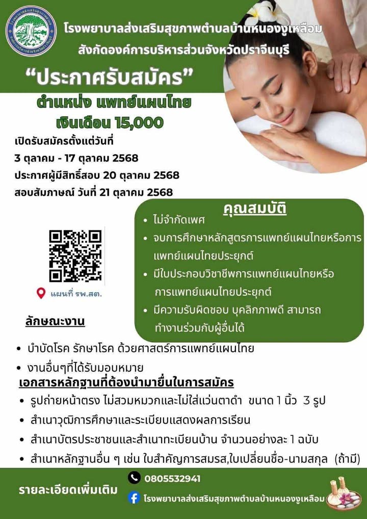 โรงพยาบาลส่งเสริมสุขภาพตําบลบ้านหนองงูเหลือม รับสมัคร แพทย์แผนไทย เงินเดือน 15,000 บาท ตั้งแต่วันที่ 3 - 17 ต.ค. 2568 ไฟล์แนป ::: ประกาศรับสมัครสอบ อ้างอิง ::: Tag : แพทย์แผนไทย แสดงความคิดเห็น : - กรุณาใช้คำพูดที่สุภาพและไม่ทำให้ผู้อื่นเสื่อมเสีย - ห้ามมิให้ผู้ใดโพดขายสินค้าเด็ดขาด - ข้อความโพสโดยสาธารณชน โปรดใช้วิจารณญาณในการอ่าน ที่เกี่ยวข้อง สํานักงานสรรพสามิตพื้นที่อุบลราชธานี รับสมัครลูกจ้างชั่วคราว 1 อัตรา เงินเดือน 11,380 บาท ตั้งเเต่วันที่ 3-7 พ.ย. 2568 30 ต.ค. 2568 เวลา 19:09 น. 1,295 สํานักงานปศุสัตว์จังหวัดนราธิวาส รับสมัครพนักงานราชการทั่วไป 1 อัตรา เงินเดือน 21,780 บาท ตั้งแต่วันที่ 3 - 7 พ.ย. 2568 28 ต.ค. 2568 เวลา 17:56 น. 1,229 โรงพยาบาลมหาราชนครศรีธรรมราช รับสมัคร ลูกจ้างชั่วคราว 19 อัตรา ตั้งแต่วันที่ 31 ต.ค. - 6 พ.ย. 2568 2 พ.ย. 2568 เวลา 19:53 น. 1,037 โรงพยาบาลสุไหงโก-ลก รับสมัครเจ้าพนักงานพัสดุ 1 อัตรา เงินเดือน 15,000 บาท ตั้งแต่วันที่ 3 - 7 พ.ย. 2568 3 พ.ย. 2568 เวลา 10:25 น. 236 กรมวิชาการเกษตร (ส่วนกลาง) รับสมัครพนักงานราชการทั่วไป 1 อัตรา เงินเดือน 21,780 บาท วันที่ 12 - 18 พ.ย. 2568 29 ต.ค. 2568 เวลา 18:54 น. 2,223 มหาวิทยาลัยราชภัฏลำปาง รับสมัครบุคคลเป็นพนักงานราชการทั่วไป 3 อัตรา เงินเดือน 21,780 บาท ตั้งแต่วันที่ 27 ต.ค. - 7 พ.ย. 2568 22 ต.ค. 2568 เวลา 22:20 น. 4,220 เทศบาลเมืองพะเยา รับสมัครบุคลากรเป็นลูกจ้างชั่วคราว 5 อัตรา เงินเดือน 13,500 - 18,000 บาท ตั้งแต่บัดนี้ - 7 พ.ย. 2568 3 พ.ย. 2568 เวลา 09:00 น. 422 โรงพยาบาลจุฬาลงกรณ์ รับสมัครบุคคลเป็นนักวิทยาศาสตร์การแพทย์ 1 อัตรา เงินเดือน 20,000 บาท ตั้งแต่บัดนี้ - 16 พ.ย. 2568 1 พ.ย. 2568 เวลา 17:28 น. 784 กลุ่มตรวจสอบภายใน กรมปศุสัตว์ รับสมัครพนักงานราชการทั่วไป 1 อัตรา เงินเดือน 21,780 บาท ตั้งแต่วันที่ 24 ต.ค. - 10 พ.ย. 2568 15 ต.ค. 2568 เวลา 18:20 น. 1,658 สํานักงานส่งเสริมการเรียนรู้ประจําจังหวัดสกลนคร รับสมัคร จ้างเหมาเอกชนดําเนินงาน 5 อัตรา เงินเดือน 11,680 - 15,000 บาท ตั้งแต่วันที่ 3-7 พ.ย. 2568 30 ต.ค. 2568 เวลา 20:50 น. 295 มหาวิทยาลัยเทคโนโลยีราชมงคลอีสาน รับสมัคร นักวิชาการศึกษา1 อัตรา เงินเดือน 15,000 บาท ตั้งแต่วันที่ 22 ต.ค. - 5 พ.ย. 2568 25 ต.ค. 2568 เวลา 20:25 น. 825 สํานักงานปศุสัตว์จังหวัดสระบุรี รับสมัครพนักงานราชการทั่วไป 1 อัตรา เงินเดือน 16,700 บาท ตั้งแต่วันที่ 27 ต.ค. - 4 พ.ย. 2568 22 ต.ค. 2568 เวลา 21:40 น. 1,998