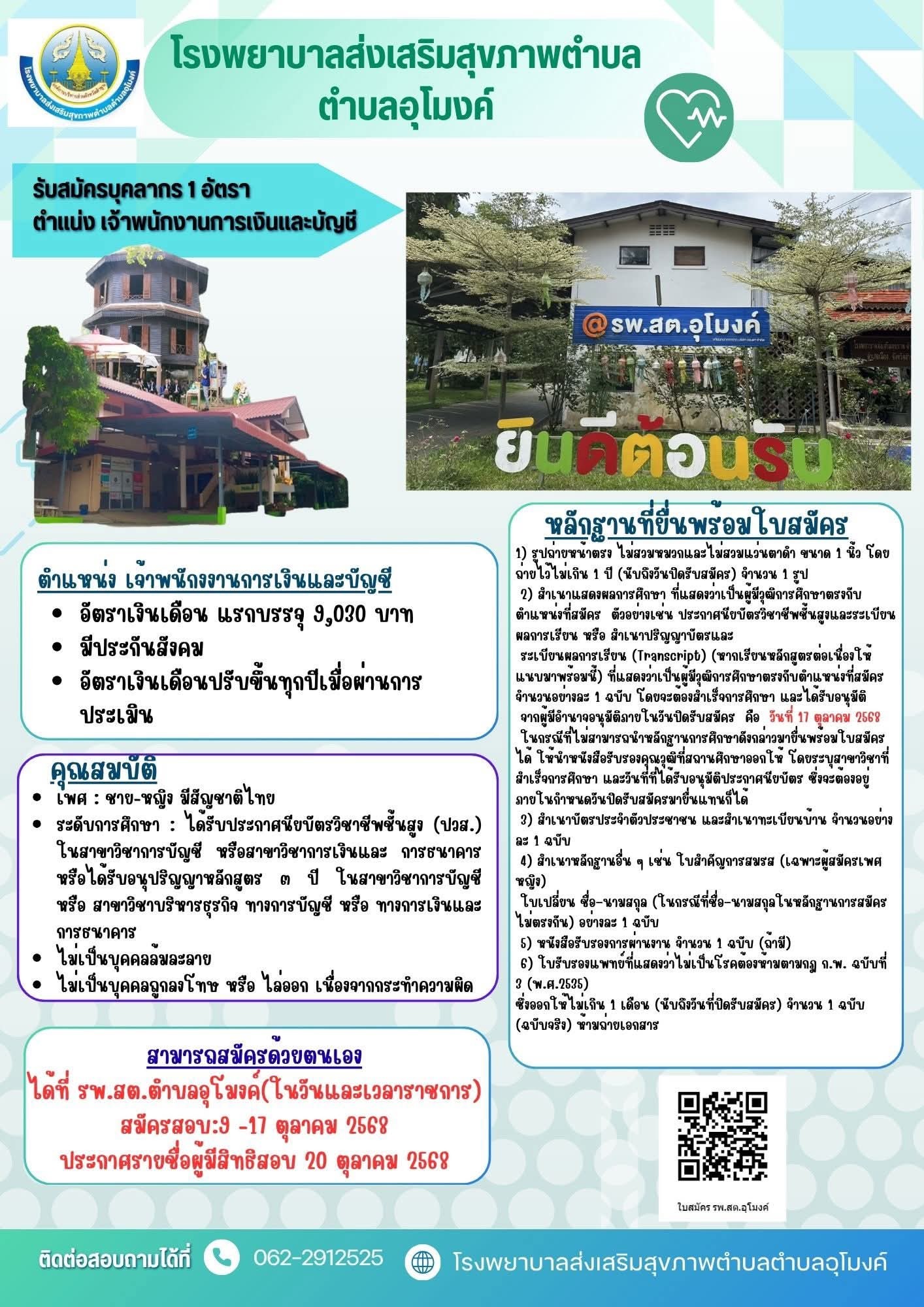 โรงพยาบาลส่งเสริมสุงภาพตําบล ตําบลอุโมงค์ รับสมัคร เจ้าพนักงานการเงินและบัญชี 1 อัตรา เงินเดือน 9,030 บาท ตั้งแต่วันที่ 9-17 ต.ค. 2568 ไฟล์แนป ::: ประกาศรับสมัครสอบ อ้างอิง ::: Tag : เจ้าพนักงานการเงินและบัญชี แสดงความคิดเห็น : - กรุณาใช้คำพูดที่สุภาพและไม่ทำให้ผู้อื่นเสื่อมเสีย - ห้ามมิให้ผู้ใดโพดขายสินค้าเด็ดขาด - ข้อความโพสโดยสาธารณชน โปรดใช้วิจารณญาณในการอ่าน ที่เกี่ยวข้อง กองบัญชีภาครัฐ รับสมัคร ตําแหน่งนักบัญชี 1 อัตรา เงินเดือน 18,150 บาท ตั้งแต่วันที่ 20 ต.ค. - 7 พ.ย. 2568 16 ต.ค. 2568 เวลา 20:27 น. 1,079 คณะวิทยาศาสตร์ มหาวิทยาลัยรามคําแหง รับสมัคร ลูกจ้างมหาวิทยาลัย 1 อัตรา เงินเดือน 15,000 บาท ตั้งแต่วันที่ 3-7 พ.ย.2568 4 พ.ย. 2568 เวลา 21:42 น. 46 ด่านกักกันสัตว์เพชรบุรี รับสมัครพนักงานราชการทั่วไป 1 อัตรา เงินเดือน 12,630 บาท ตั้งแต่วันที่ 3 - 12 พ.ย. 2568 15 ต.ค. 2568 เวลา 18:57 น. 2,021 เทศบาลนครสุราษฎร์ธานี รับสมัครบุคคลเลือกสรรเป็นพนักงานจ้าง 9 อัตรา เงินเดือน 9,400 - 15,000 บาท ตั้งแต่วันที่ 27 ต.ค. - 7 พ.ย. 2568 25 ต.ค. 2568 เวลา 20:38 น. 7,204 สํานักงานสหกรณ์จังหวัดอุดรธานี รับสมัครพนักงานจ้างเหมาบริการ 1 อัตรา เงินเดือน 15,000 บาท ตั้งแต่วันที่ 5-12 พ.ย. 2568 4 พ.ย. 2568 เวลา 21:23 น. 25 โรงพยาบาลสุไหงโก-ลก รับสมัครเจ้าพนักงานพัสดุ 1 อัตรา เงินเดือน 15,000 บาท ตั้งแต่วันที่ 3 - 7 พ.ย. 2568 3 พ.ย. 2568 เวลา 10:25 น. 236 สํานักงานตํารวจแห่งชาติ รับสมัครตํารวจชั้นสัญญาบัตร 700 อัตรา สมัครทางอินเทอร์เน็ต ตั้งแต่วันที่ 27 ต.ค. - 4 พ.ย. 2568 18 ต.ค. 2568 เวลา 21:49 น. 10,126 โรงเรียนบ้านบางสะพานน้อย รับสมัคร ครูอัตราจ้าง 1 อัตรา เงินเดือน 7,000 บาท ตั้งแต่วันที่ 1-5 พ.ย. 2568 2 พ.ย. 2568 เวลา 21:22 น. 136 สำนักตรวจเงินแผ่นดินจังหวัดสมุทรสาคร รับสมัคร พนักงานสมทบตรวจเงินแผ่นดิน ชั้น 3 จำนวน 1 อัตรา เงินเดือน 15,000 บาท ตั้งแต่วันที่ 8 ต.ค. - 7 พ.ย. 2568 28 ก.ย. 2568 เวลา 13:28 น. 1,405 โรงพยาบาลบึงบูรพ์ รับสมัครบุคคลเข้ารับราชการ 2 อัตรา เงินเดือน 18,150 - 19,970 บาท ตั้งแต่วันที่ 24 - 28 พ.ย. 2568 31 ต.ค. 2568 เวลา 11:08 น. 385 โรงพยาบาลค่ายวชิราวุธ รับสมัครบุคคลพลเรือนเป็นลูกจ้างชั่วคราว 57 อัตรา เงินเดือน 11,000 - 23,000 บาท ตั้งแต่บัดนี้ - 7 พ.ย. 2568 1 พ.ย. 2568 เวลา 16:42 น. 786 วิทยาลัยประมงติณสูลานนท์ รับสมัคร ลูกจ้างชั่วคราว 1 อัตรา เงินเดือน 8,300 บาท ตั้งแต่วันที่ 27 ต.ค. - 5 พ.ย. 2568 26 ต.ค. 2568 เวลา 17:47 น. 364