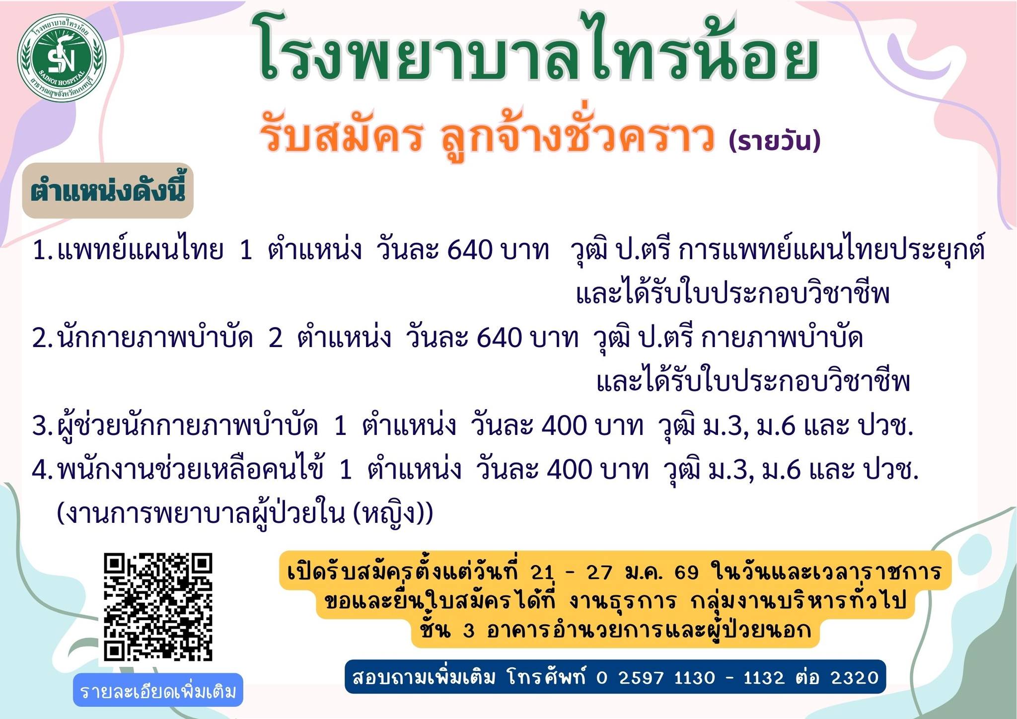 โรงพยาบาลไทรน้อย รับสมัครลูกจ้างชั่วคราว (รายวัน) 5 อัตรา จ้างวันละ 400 - 640 บาท ตั้งแต่วันที่ 21-27 ม.ค. 2569 แสดงความคิดเห็น : - กรุณาใช้คำพูดที่สุภาพและไม่ทำให้ผู้อื่นเสื่อมเสีย - ห้ามมิให้ผู้ใดโพดขายสินค้าเด็ดขาด - ข้อความโพสโดยสาธารณชน โปรดใช้วิจารณญาณในการอ่าน ที่เกี่ยวข้อง สํานักงานประกันสังคม จังหวัดสงขลา รับสมัคร พนักงานประกันสังคม 1 อัตรา เงินเดือน 9,400 บาท ตั้งแต่วันที่ 26-28 ม.ค. 2568 21 ม.ค. 2569 เวลา 19:09 น. 1,084 โรงพยาบาลปากช่องนานา รับสมัครบุคคลเป็นลูกจ้างชั่วคราว (รายวัน) 2 อัตรา ตั้งแต่วันที่ 27 ม.ค. - 2 ก.พ. 2569 25 ม.ค. 2569 เวลา 20:02 น. 654 โรงพยาบาลสกลนคร รับสมัครพนักงานกระทรวงสาธารณสุขทั่วไป 15 อัตรา เงินเดือน18,000 - 21,000 บาท ตั้งแต่วันที่ 30 ม.ค. - 13 ก.พ. 2569 24 ม.ค. 2569 เวลา 14:07 น. 813 สํานักงานสรรพากรพื้นที่ศรีสะเกษ รับสมัคร เจ้าพนักงานธุรการ 1 อัตรา เงินเดือน13,380 บาท ตั้งแต่วันที่ 26 - 30 ม.ค. 2569 19 ม.ค. 2569 เวลา 14:51 น. 910 ท่าอากาศยานกระบี่ รับสมัคร พนักงานราชการทั่วไป 3 อัตรา เงินเดือน 13,600 - 21,780 บาท ตั้งแต่วันที่ 26-30 ม.ค. 2569 26 ม.ค. 2569 เวลา 16:58 น. 219 สถาบันจิตเวชศาสตร์สมเด็จเจ้าพระยา รับสมัครพนักงานกระทรวงสาธารณสุขทั่วไป 3 อัตรา เงินเดือน 15,000 บาท ตั้งแต่วันที่ 21 - 29 ม.ค. 2569 19 ม.ค. 2569 เวลา 19:06 น. 1,321 โรงพยาบาลไทรน้อย รับสมัครลูกจ้างชั่วคราว (รายวัน) 5 อัตรา จ้างวันละ 400 - 640 บาท ตั้งแต่วันที่ 21-27 ม.ค. 2569 26 ม.ค. 2569 เวลา 09:24 น. 132 คณะสิ่งแวดล้อมและทรัพยากรศาสตร์ มหาวิทยาลัยมหาสารคาม รับสมัคร ลูกจ้างชั่วคราว 1 อัตรา เงินเดือน 16,500 บาท ตั้งแต่บัดนี้ถึง 29 ม.ค. 2569 19 ม.ค. 2569 เวลา 15:22 น. 547 โรงพยาบาลลําปาง รับสมัครลูกจ้างชั่วคราวรายวัน 3 อัตรา จ้างวันละ 350 - 440 บาท ตั้งแต่วันที่ 26 ม.ค. - 6 ก.พ. 2569 26 ม.ค. 2569 เวลา 16:36 น. 118 เทศบาลเมืองยโสธร รับสมัครบุคคลเป็นพนักงานจ้าง 2 อัตรา เงินเดือน 9,400 บาท ตั้งแต่วันที่ 21 - 29 ม.ค. 2569 21 ม.ค. 2569 เวลา 19:02 น. 2,042 มหาวิทยาลัยสงขลานครินทร์ วิทยาเขตภูเก็ต รับสมัครพนักงานแพทย์แผนไทย 1 อัตรา เงินเดือน 15,000 บาท ตั้งแต่บัดนี้ - 31 ม.ค. 2569 20 ม.ค. 2569 เวลา 20:11 น. 877 โรงพยาบาลสระบุรี รับสมัครบุคคลเป็นพนักงานราชการทั่วไป 1 อัตรา เงินเดือน 23,600 บาท ตั้งแต่วันที่ 23 - 29 ม.ค. 2569 16 ม.ค. 2569 เวลา 18:37 น. 5,153