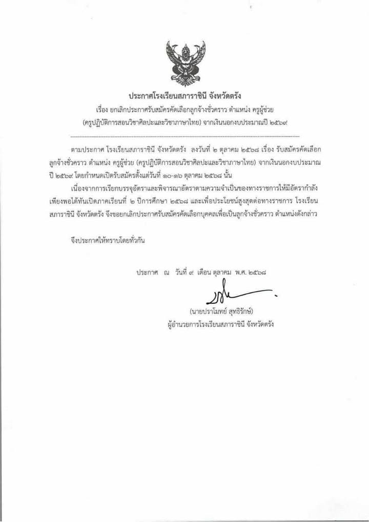 โรงเรียนสภาราชินี จังหวัดตรัง รับสมัคร ตําแหน่ง ครูผู้ช่วย 2 อัตรา เงินเดือน 10,190 บาท ตั้งแต่วันที่ 10 - 16 ต.ค. 2568 ไฟล์แนป ::: ประกาศรับสมัครสอบ อ้างอิง ::: Tag : ครูเอกภาษาไทย ครูเอกศิลปะ แสดงความคิดเห็น : - กรุณาใช้คำพูดที่สุภาพและไม่ทำให้ผู้อื่นเสื่อมเสีย - ห้ามมิให้ผู้ใดโพดขายสินค้าเด็ดขาด - ข้อความโพสโดยสาธารณชน โปรดใช้วิจารณญาณในการอ่าน ที่เกี่ยวข้อง โรงเรียนบ้านนายาว รับสมัคร ครูอัตราจ้าง 1 อัตรา เงินเดือน 9,000 บาท ตั้งแต่วันที่ 3-7 พ.ย. 2568 3 พ.ย. 2568 เวลา 15:31 น. 73 โรงพยาบาลมหาราชนครศรีธรรมราช รับสมัคร ลูกจ้างชั่วคราว 19 อัตรา ตั้งแต่วันที่ 31 ต.ค. - 6 พ.ย. 2568 2 พ.ย. 2568 เวลา 19:53 น. 1,038 สํานักงานคุมประพฤติจังหวัดบุรีรัมย์ สาขานางรอง รับสมัคร ลูกจ้างชั่วคราว 1 อัตรา เงินเดือน 11,380 บาท ตั้งแต่วันที่ 14 ต.ค. - 4 พ.ย. 2568 11 ต.ค. 2568 เวลา 18:04 น. 780 มหาวิทยาลัยสงขลานครินทร์ รับสมัครบุคคลทั่วไปเป็นพนักงาน 2 อัตรา เงินเดือน 15,000 - 19,500 บาท ตั้งแต่บัดนี้ - 5 พ.ย. 2568 25 ต.ค. 2568 เวลา 20:21 น. 5,208 มูลนิธิการศึกษาทางไกลผ่านดาวเทียม รับสมัคร เจ้าหน้าที่มูลนิธิ 4 อัตรา เงินเดือน 18,000 บาท ตั้งแต่วันที่ 20-28 พ.ย. 2568 1 พ.ย. 2568 เวลา 20:28 น. 585 สำนักงานปลัดกระทรวงการพัฒนาสังคมและความมั่นคงของมนุษย์ รับสมัครบุคคลเข้ารับราชการ 21 อัตรา เงินเดือน 13,920 - 19,970 บาท ตั้งแต่วันที่ 28 ต.ค. - 17 พ.ย. 2568 17 ต.ค. 2568 เวลา 18:39 น. 8,524 สังกัดสํานักงานการปฏิรูปที่ดินจังหวัดสุรินทร์ รับสมัครพนักงาน 1 อัตรา เงินเดือน 18,000 บาท ตั้งเเต่บัดนี้-5 พ.ย. 2568 18 ต.ค. 2568 เวลา 15:24 น. 1,764 สำนักงานบริหารหนี้สาธารณะ รับสมัคร ลูกจ้างชั่วคราวรายเดือน 6 อัตรา เงินเดือน 12,520 - 18,150 บาท ตั้งแต่วันที่ 27 ต.ค. - 9 พ.ย. 2568 25 ต.ค. 2568 เวลา 08:42 น. 697 บริษัท ไปรษณีย์ไทยดิสทริบิวชั่น จํากัด รับสมัครสอบคัดเลือกพนักงาน หลายอัตรา ตั้งแต่บัดนี้เป็นต้นไป 10 พ.ย. 2567 เวลา 19:09 น. 66,977 ราชวิทยาลัยจุฬาภรณ์ รับสมัครบรรจุบุคคลเข้าเป็นผู้ปฏิบัติงาน 8 อัตรา ตั้งแต่บัดนี้เป็นต้นไป 4 พ.ย. 2568 เวลา 18:32 น. 495 สำนักงานสหกรณ์จังหวัดหนองบัวลำภู รับสมัครพนักงานจ้างเหมาบริการ 1 อัตรา เงินเดือน 15,000 บาท ตั้งแต่วันที่ 3 - 7 พ.ย. 2568 31 ต.ค. 2568 เวลา 11:20 น. 416 สำนักงานศูนย์อำนวยการป้องกันและปราบปรามยาเสพติดจังหวัดศรีสะเกษ รับสมัครลูกจ้างเหมาบริการ 1 อัตรา เงินเดือน 15,000 บาท ตั้งแต่วันที่ 3 - 5 พ.ย. 2568 28 ต.ค. 2568 เวลา 18:05 น. 1,356