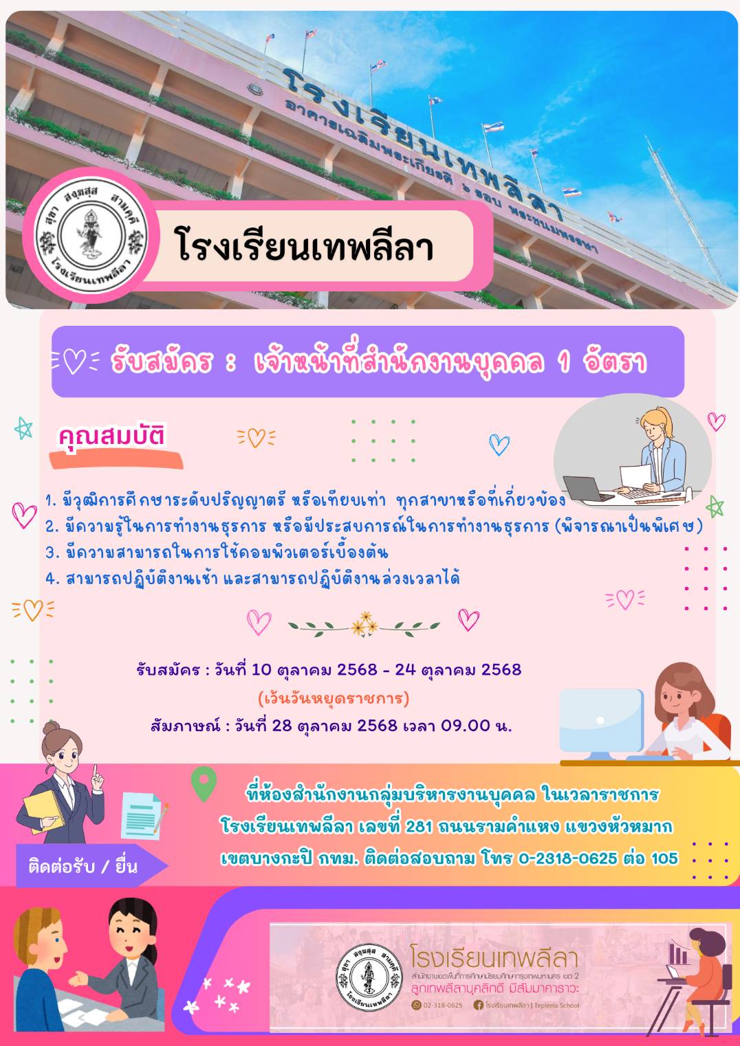 โรงเรียนเทพลีลา รับสมัคร เจ้าหน้าที่สำนักงานบุคคล 1 อัตรา ตั้งแต่วันที่ 10 - 24 ต.ค. 2568 ไฟล์แนป ::: ประกาศรับสมัครสอบ อ้างอิง ::: Tag : แสดงความคิดเห็น : - กรุณาใช้คำพูดที่สุภาพและไม่ทำให้ผู้อื่นเสื่อมเสีย - ห้ามมิให้ผู้ใดโพดขายสินค้าเด็ดขาด - ข้อความโพสโดยสาธารณชน โปรดใช้วิจารณญาณในการอ่าน ที่เกี่ยวข้อง สถาบันค้นคว้าและพัฒนาผลิตภัณฑ์อาหาร รับสมัคร พนักงานมหาวิทยา 1 อัตรา เงินเดือน 21,000 บาท ตั้งแต่วันที่ 29 ต.ค. - 28 พ.ย. 2568 1 พ.ย. 2568 เวลา 08:37 น. 528 สำนักงานคณะกรรมการดิจิทัลเพื่อเศรษฐกิจและสังคมแห่งชาติ (สดช.)รับสมัครพนักงานราชการทั่วไป เงินเดือน 55,000 - 65,000 บาท ตั้งแต่วันที่ 31 ต.ค - 7 พ.ย 2568 28 ต.ค. 2568 เวลา 16:07 น. 1,334 สํานักงานจัดหางานจังหวัดหนองคาย รับสมัคร พนักงานราชการทั่วไป 1 อัตรา เงินเดือน 21,780 บาท ตั้งแต่วันที่ 3-7 พ.ย. 2568 31 ต.ค. 2568 เวลา 21:27 น. 614 เรือนจํากลางพิษณุโลก รับสมัคร พนักงานราชการ 10 อัตรา เงินเดือน 13,660 - 21,780 บาท ตั้งแต่วันที่ 27 ต.ค. - 5 พ.ย. 2568 2 พ.ย. 2568 เวลา 12:06 น. 431 ศูนย์ป้องกันและปราบปรามประมงน้ำจืดนครราชสีมา รับสมัครพนักงานราชการทั่วไป 1 อัตรา เงินเดือน 13,660 บาท ตั้งแต่วันที่ 6 - 14 พ.ย. 2568 1 พ.ย. 2568 เวลา 16:55 น. 863 วิทยาลัยการอาชีพชุมพร รับสมัคร ลูกจ้างชั่วคราว 2 อัตรา เงินเดือน 9,800 บาท ตั้งแต่วันที่ 27 ต.ค. - 7 พ.ย. 2568 26 ต.ค. 2568 เวลา 18:33 น. 695 สํานักงานเขตราษฎร์บูรณะ รับสมัคร ลูกจ้างชั่วคราว 44 อัตรา เงินเดือน 8,690 - 9,400 บาท ตั้งแต่วันที่ 27 ต.ค. - 14 พ.ย. 2568 25 ต.ค. 2568 เวลา 13:43 น. 374 สำนักงานคุมประพฤติกรุงเทพมหานคร 4 รับสมัครบุคคลเป็นลูกจ้างชั่วคราว 3 อัตรา เงินเดือน 11,380 - 18,150 บาท ตั้งแต่บัดนี้ - 18 พ.ย. 2568 4 พ.ย. 2568 เวลา 18:41 น. 162 บริษัท เอสอาร์ที แอสเสท จำกัด รับสมัครเป็นพนักงานประจำ 11 อัตรา ตั้งแต่บัดนี้ - 7 พ.ย 2568 27 ต.ค. 2568 เวลา 15:04 น. 1,893 ด่านกักกันสัตว์มุกดาหาร รับสมัครพนักงานราชการทั่วไป 1 อัตรา เงินเดือน 12,630 บาท ตั้งแต่วันที่ 28 ต.ค. - 5 พ.ย. 2568 17 ต.ค. 2568 เวลา 18:14 น. 1,464 ด่วน!! สอศ. เปิดรับสมัครพนักงานราชการทั่วไป เงินเดือน 21,780 บาท จำนวนหลายอัตรา หลายจังหวัด ทั่วประเทศ เช็คได้ที่นี่ 24 มิ.ย. 2568 เวลา 12:48 น. 73,482 สํานักงานเขตหลักสี่ รับสมัคร อาสาสมัครช่วยปฏิบัติงานสภาเด็กและเยาวชน 1 อัตรา จ้างวันละ 480 บาท ตั้งแต่วันที่ 3-7 พ.ย. 2568 24 ต.ค. 2568 เวลา 12:42 น. 474